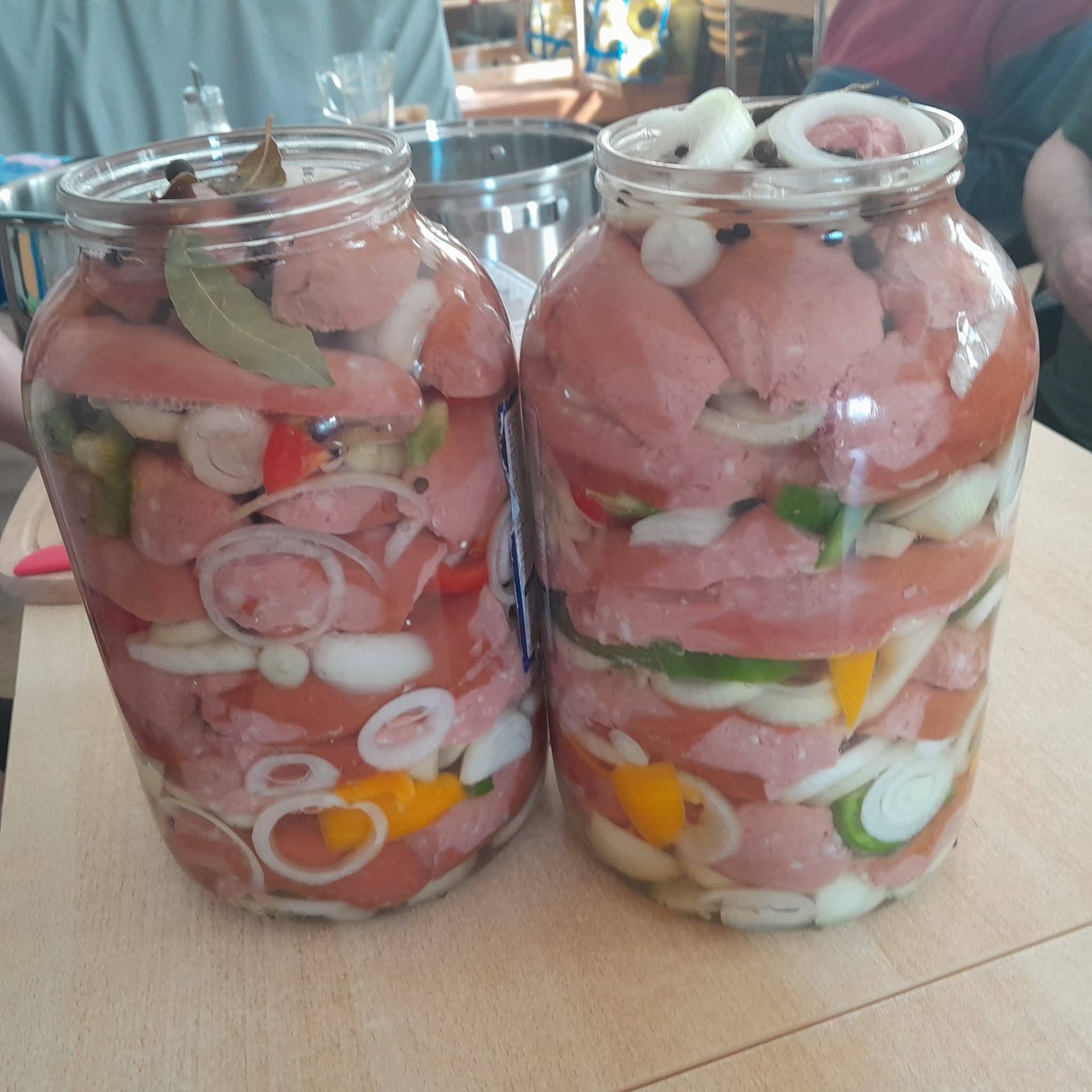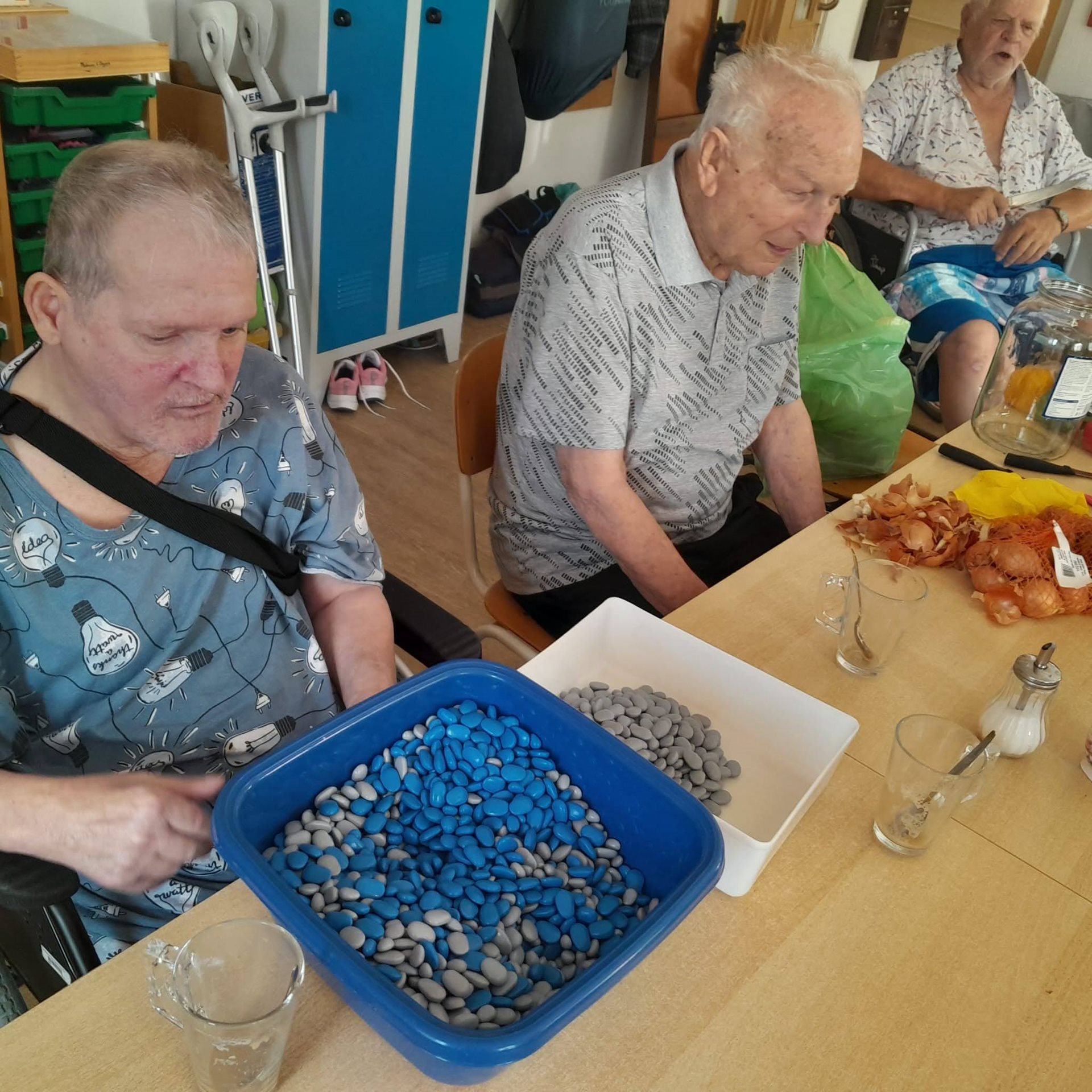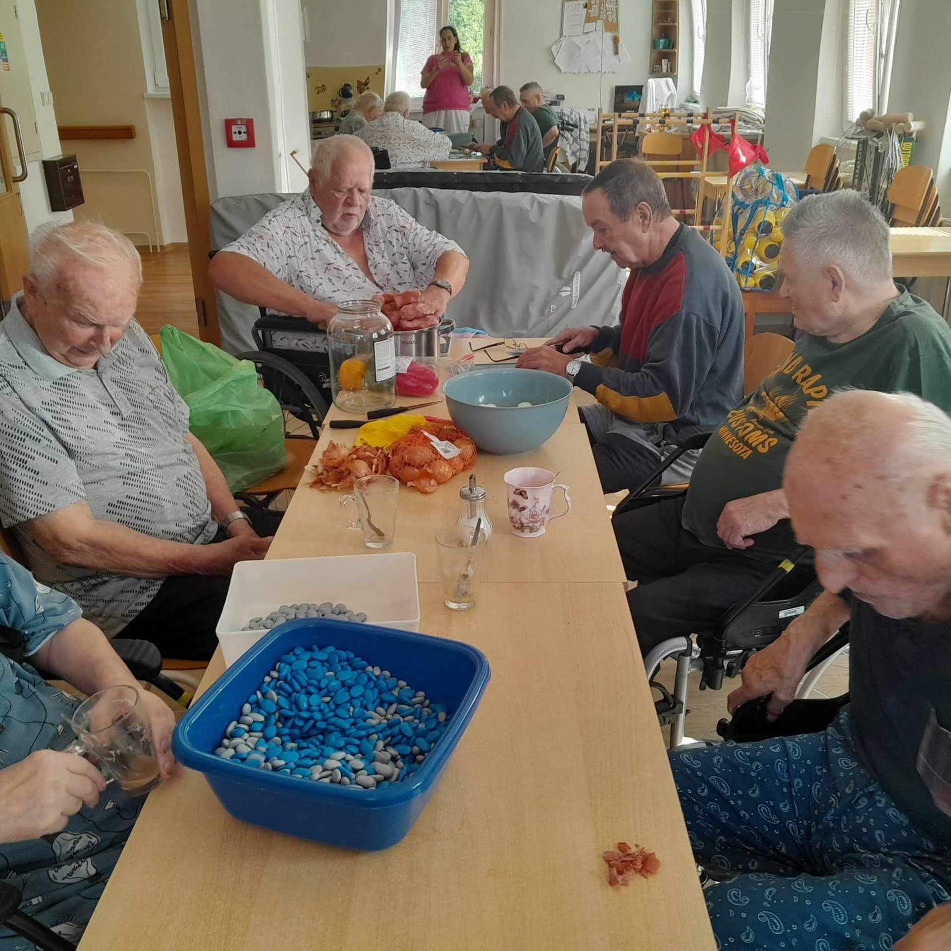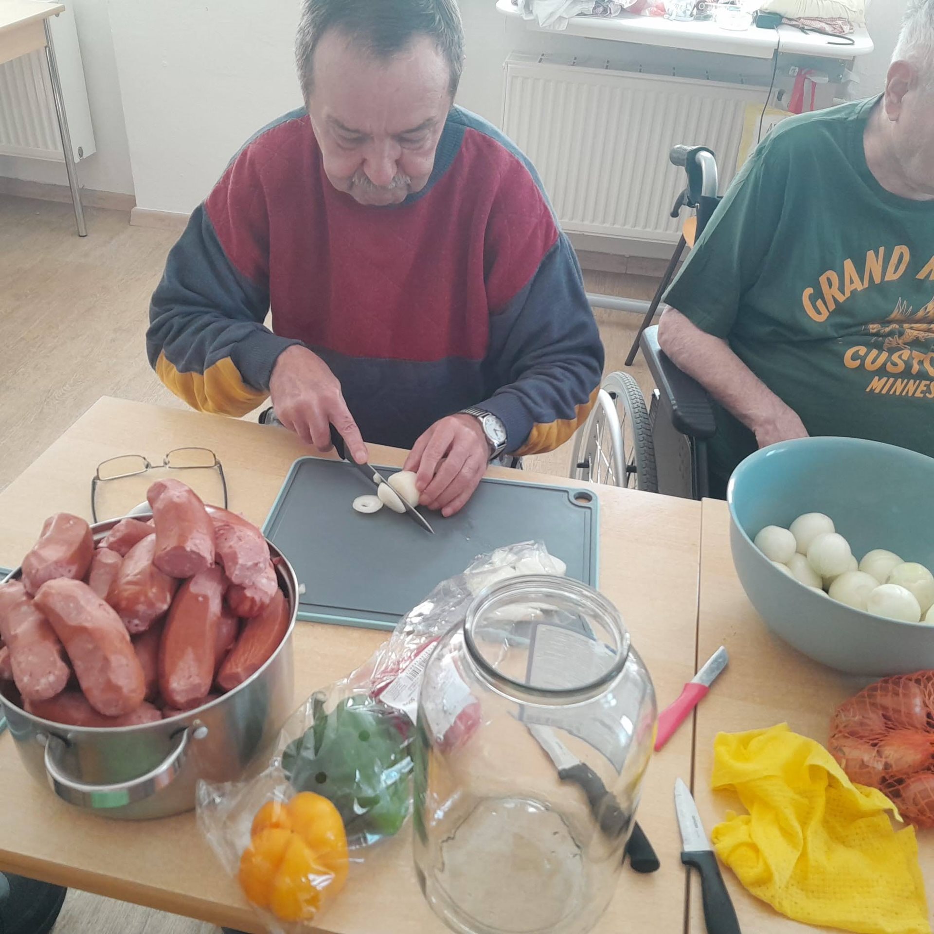 Tentokrát přišla řada na naše šikovné chlapy. Ani oni se totiž nedrží zkrátka a s chutí se pustili do příprav. Zasedli ke stolům a s vervou se chopili práce. Každý se hned ujal nějaké činnosti. Jeden loupal cibuli, druhý ji krájel, třetí se pustil do špekáčků… no zkrátka, nikdo nezůstal bez zásluhy. Společným úsilím vzniká poctivé a chutné pohoštění, na které se všichni už teď těšíme. A protože dobré věci potřebují čas, počkáme si. Ale věříme, že tak za tři týdny nás čeká příjemné odpolední posezení u poctivě proleželého a dobře dochuceného utopence. Už teď víme, že to bude stát za to a hlavně, že to všechno bude chutnat o to líp, že jsme si to připravili společně.