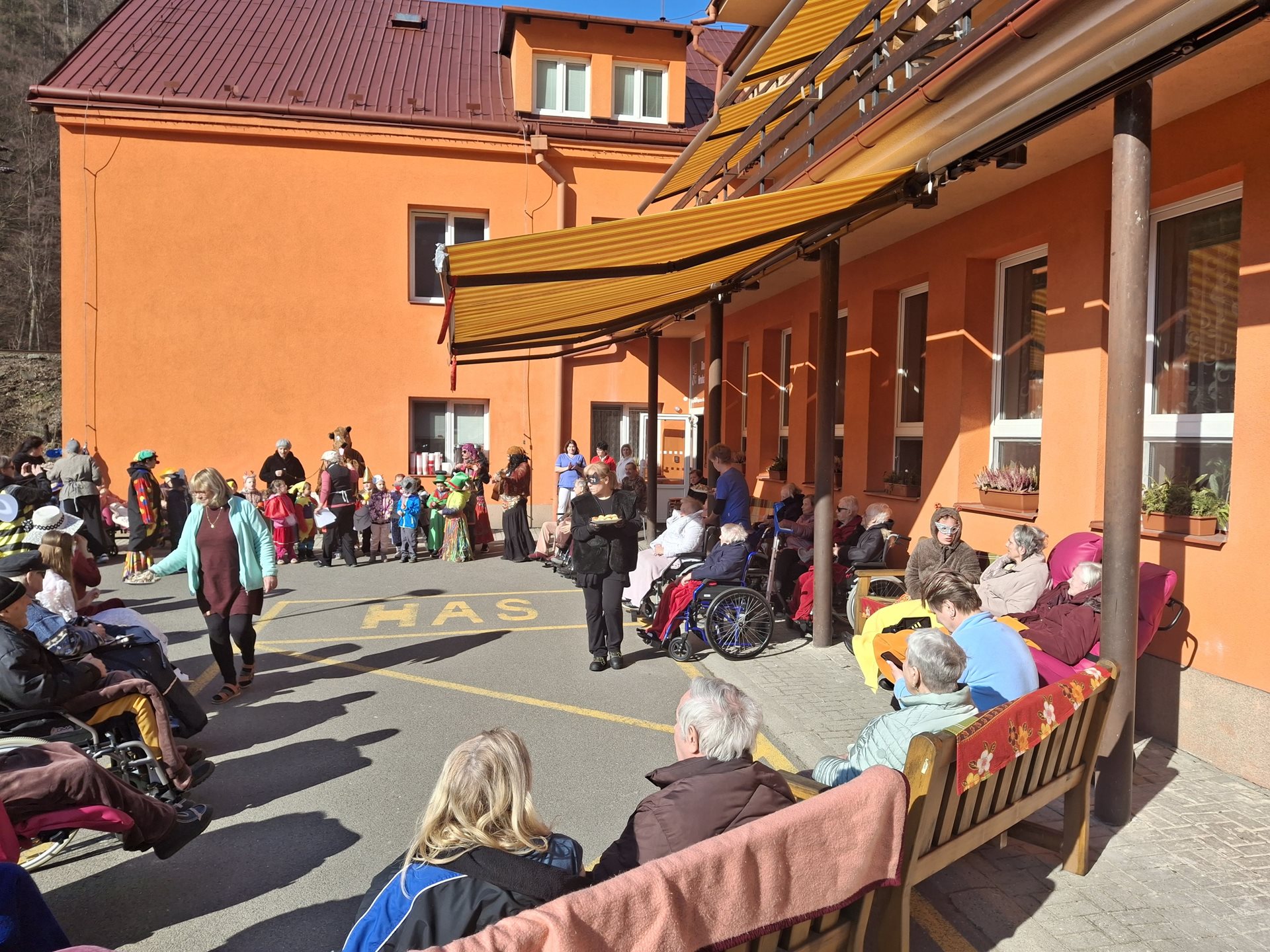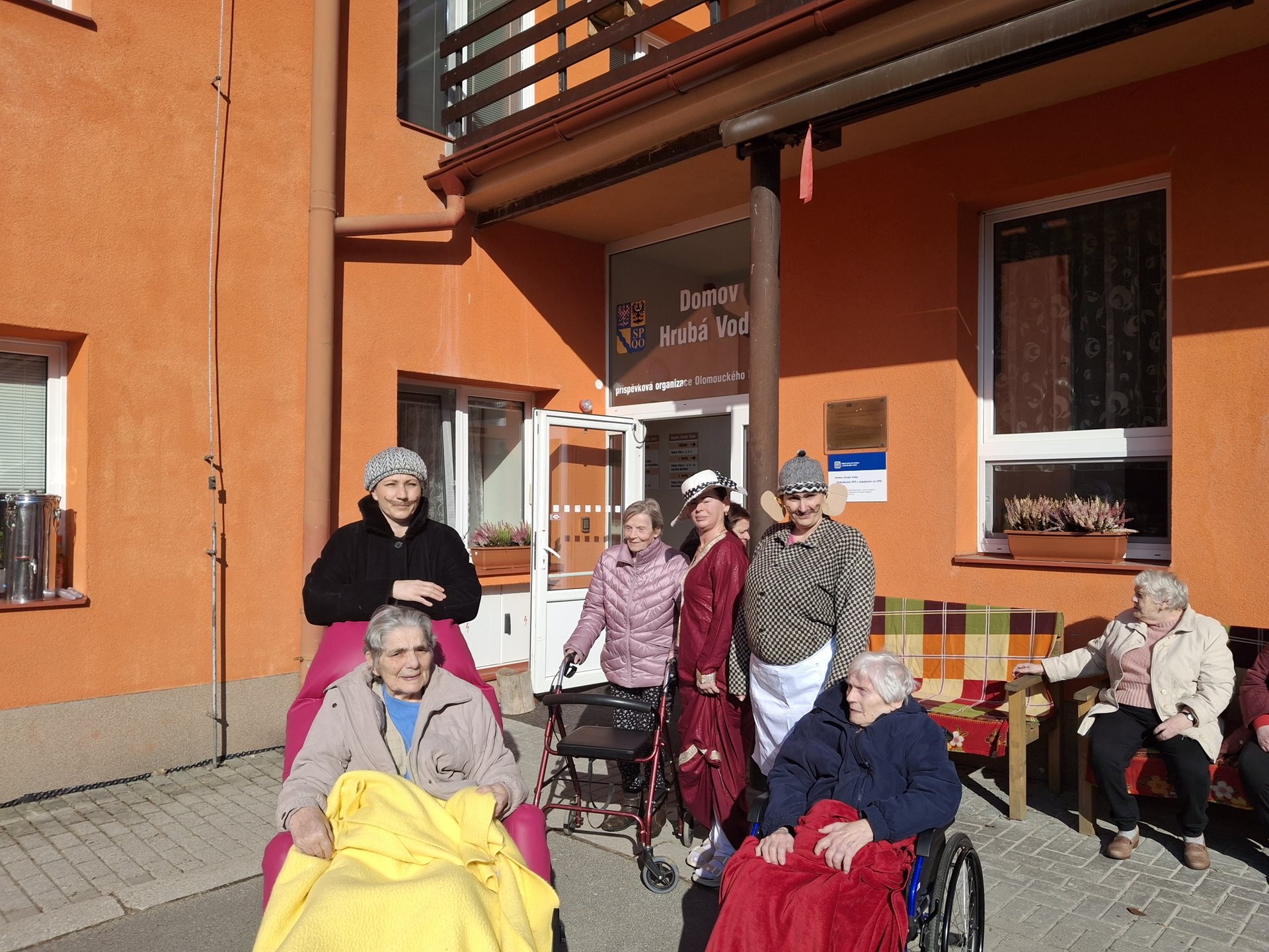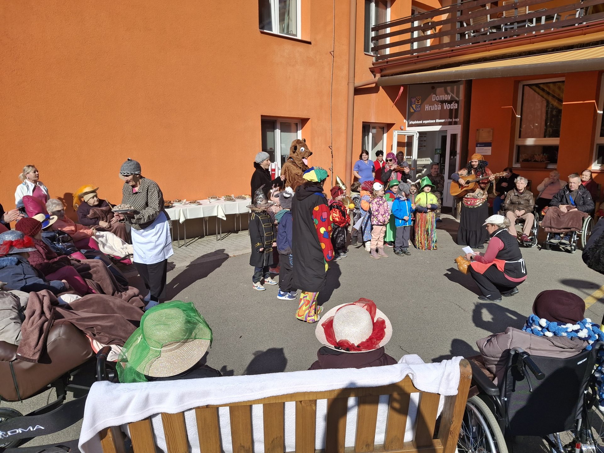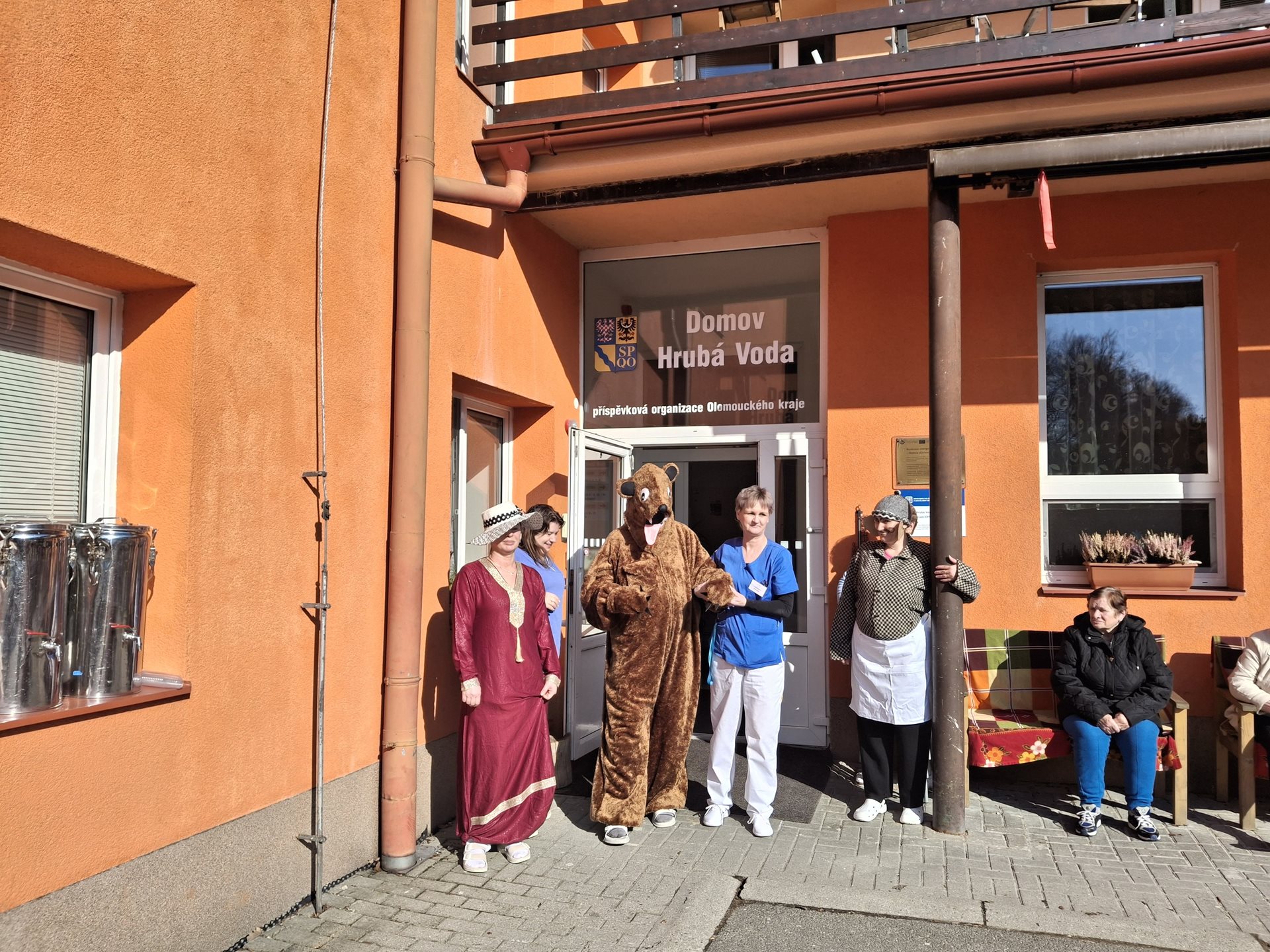 Dne 3. 3. 2026 jsme uspořádali I. ročník „Hrubovodského masopustu“. Naštěstí jsme na to nebyli sami, přizvali jsme děti z místní Mateřské školy Hlubočky. Ty rozhodně nezklamaly a svými krásnými maskami dodaly průvodu skvělou atmosféru. Počasí nám přálo natolik, že se mnozí naši klienti s úsměvem ptali, zda jsme si ho snad objednali, protože to tak opravdu skoro vypadalo. A jak by mohl být masopust bez dobrého pohoštění? Připraveny byly bohatě obložené stoly a velký úspěch měla také výborná tlačenka od místního řezníka. Hudební doprovod zajistil pan Tomáš Velzel a postaral se o pestrý hudební program. Opět se potvrdilo, jak krásné je propojovat generace, naše klienty s místními dětmi. Nezapomněli jsme ani na klienty, kteří se nemohli zúčastnit venkovního posezení. Masopustní průvod v čele s Medvědem proto dorazil přímo za nimi až na jejich pokoje. Byl to nezapomenutelný zážitek a už teď můžeme s radostí oznámit, že příští ročník určitě naváže na ten letošní. Děkujeme všem, kteří se na této krásné akci podíleli.