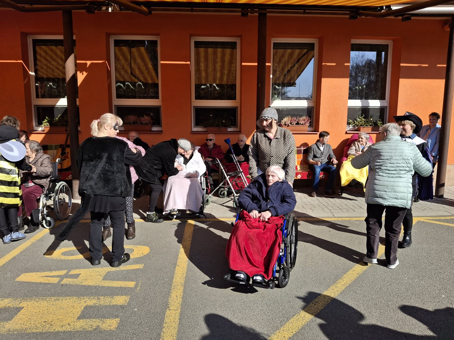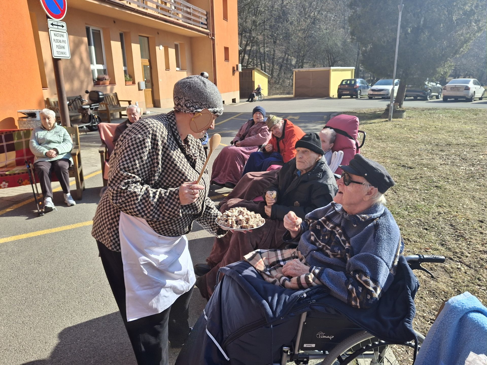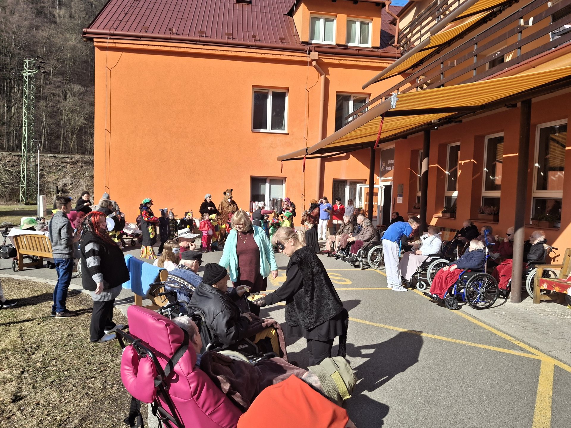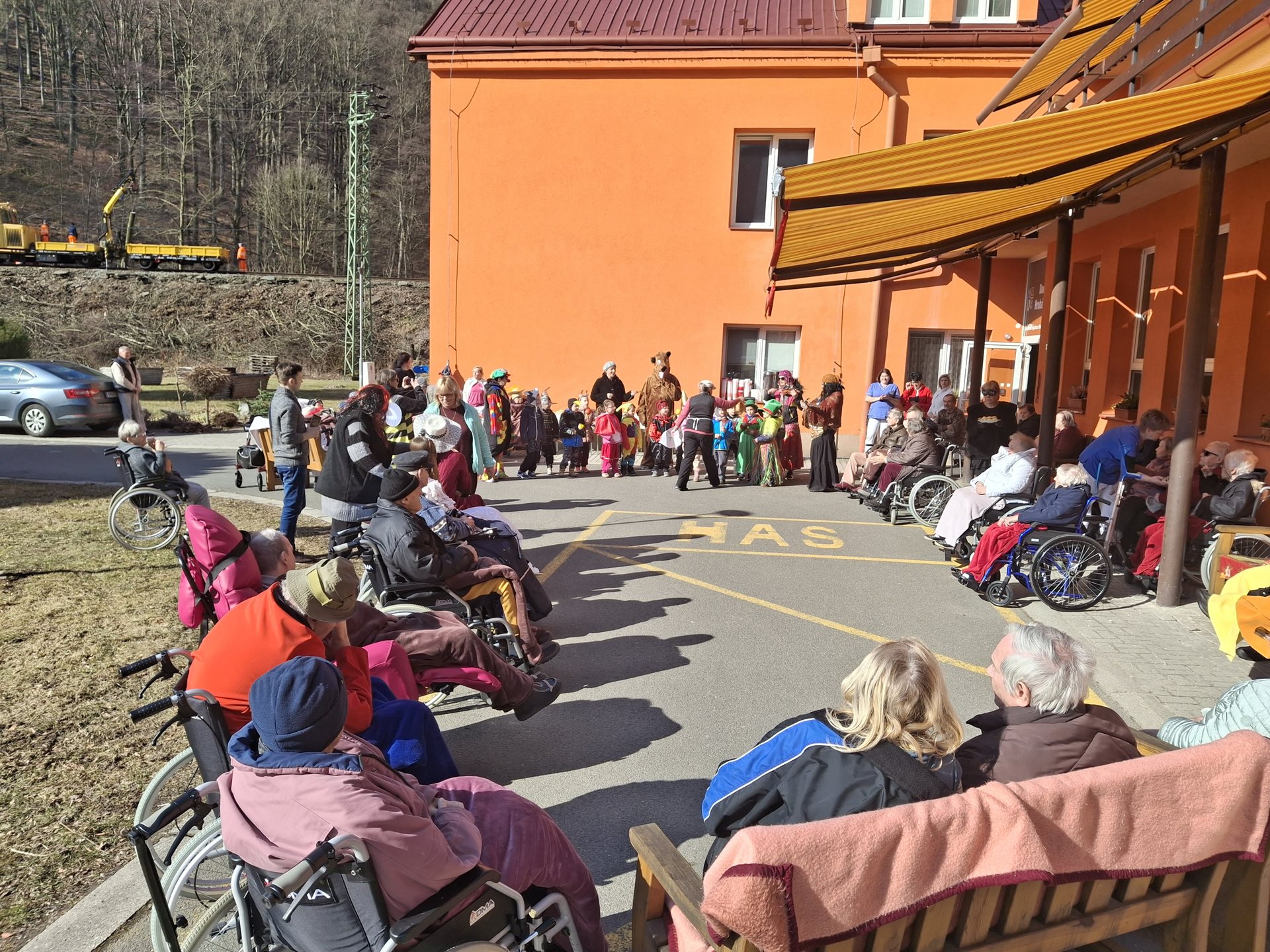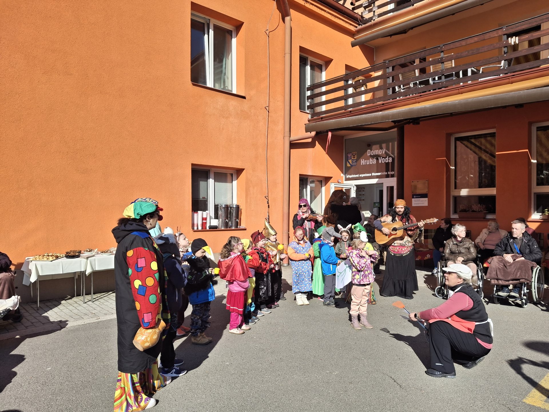 Dne 3. 3. 2026 jsme uspořádali I. ročník „Hrubovodského masopustu“. Naštěstí jsme na to nebyli sami, přizvali jsme děti z místní Mateřské školy Hlubočky. Ty rozhodně nezklamaly a svými krásnými maskami dodaly průvodu skvělou atmosféru. Počasí nám přálo natolik, že se mnozí naši klienti s úsměvem ptali, zda jsme si ho snad objednali, protože to tak opravdu skoro vypadalo. A jak by mohl být masopust bez dobrého pohoštění? Připraveny byly bohatě obložené stoly a velký úspěch měla také výborná tlačenka od místního řezníka. Hudební doprovod zajistil pan Tomáš Velzel a postaral se o pestrý hudební program. Opět se potvrdilo, jak krásné je propojovat generace, naše klienty s místními dětmi. Nezapomněli jsme ani na klienty, kteří se nemohli zúčastnit venkovního posezení. Masopustní průvod v čele s Medvědem proto dorazil přímo za nimi až na jejich pokoje. Byl to nezapomenutelný zážitek a už teď můžeme s radostí oznámit, že příští ročník určitě naváže na ten letošní. Děkujeme všem, kteří se na této krásné akci podíleli.
