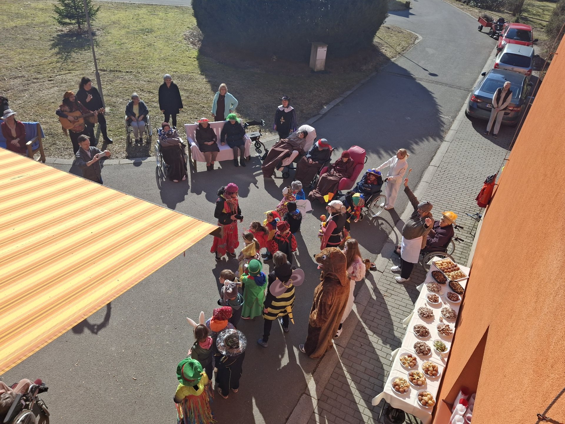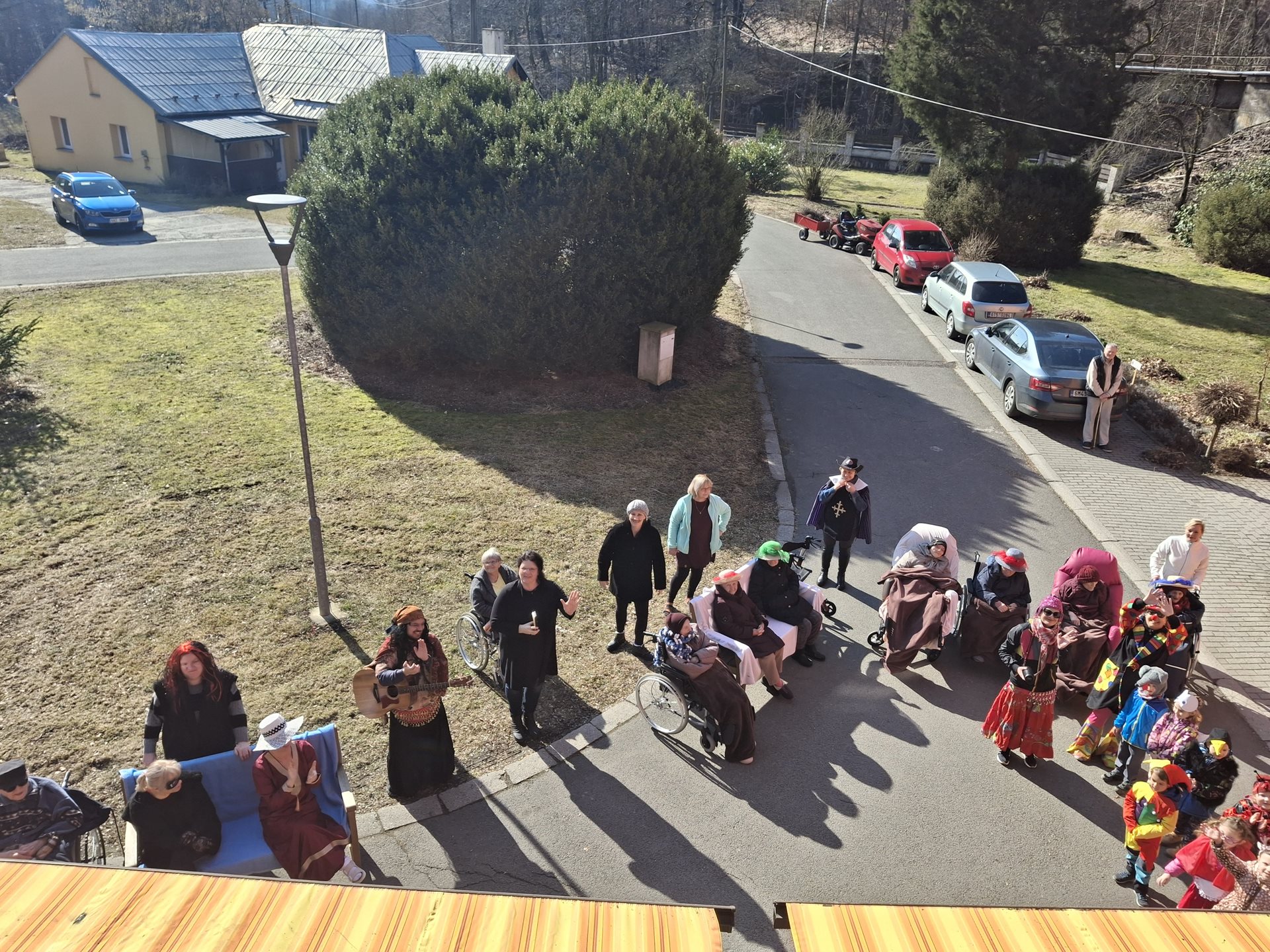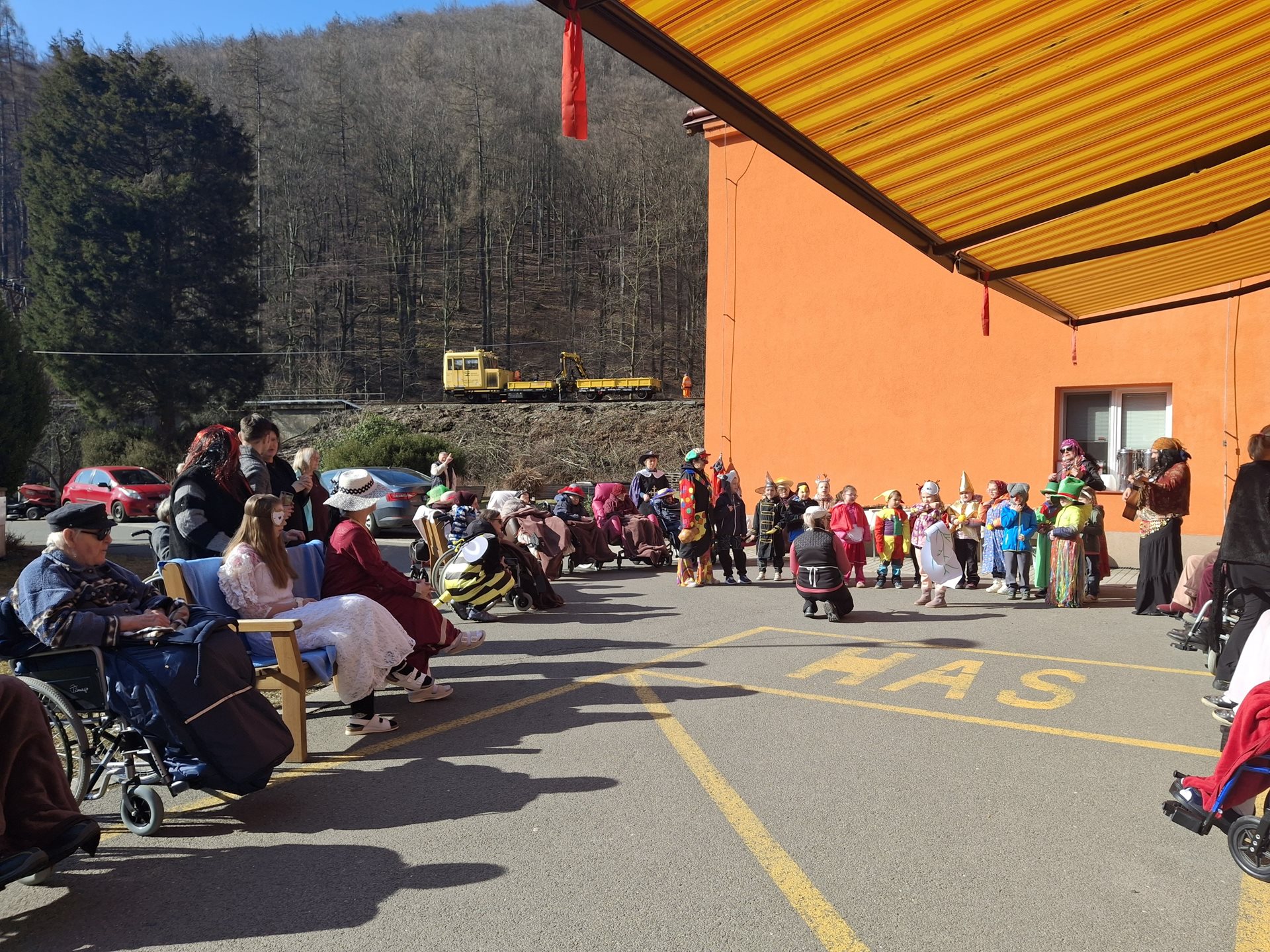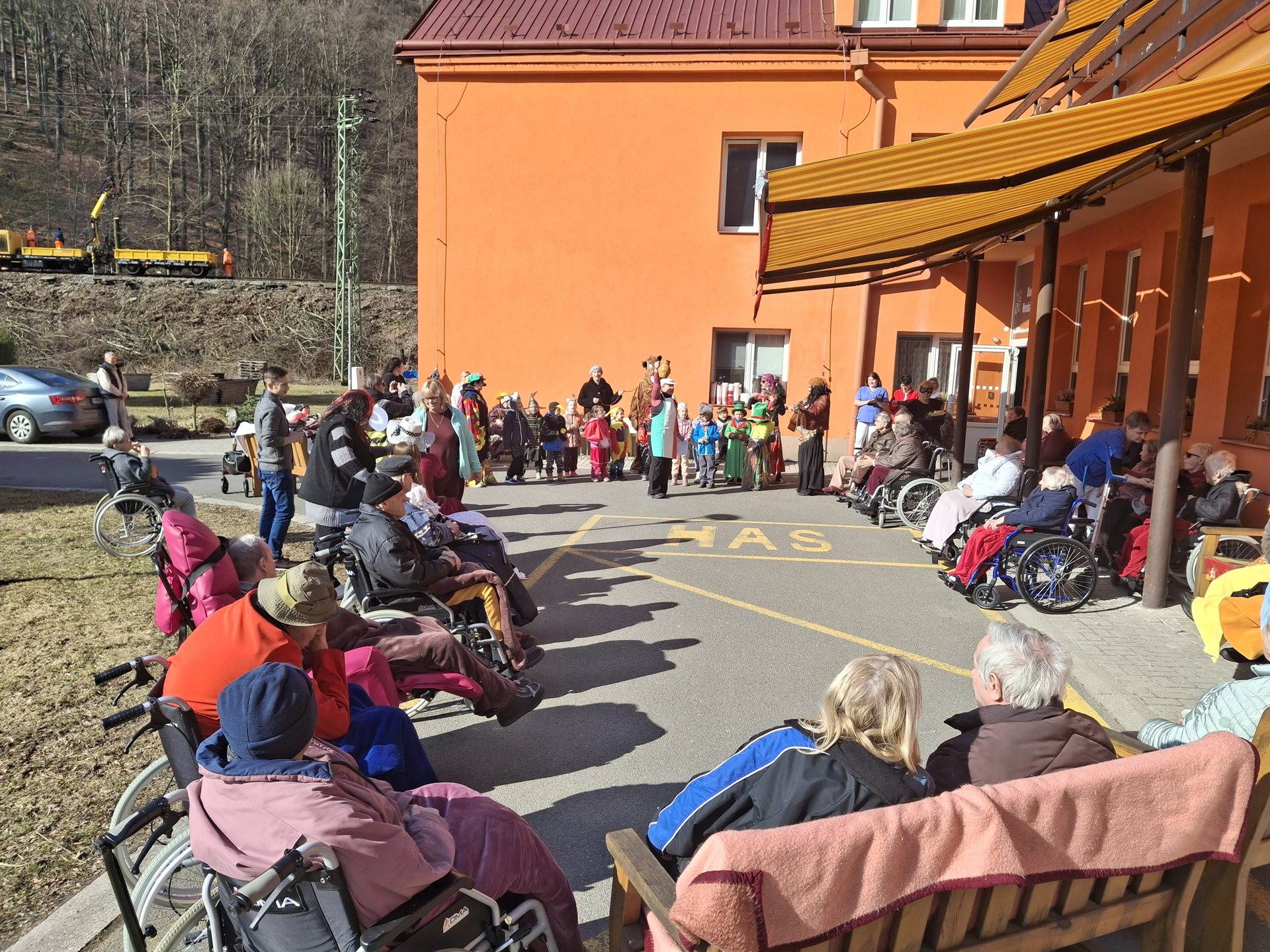 Dne 3. 3. 2026 jsme uspořádali I. ročník „Hrubovodského masopustu“. Naštěstí jsme na to nebyli sami, přizvali jsme děti z místní Mateřské školy Hlubočky. Ty rozhodně nezklamaly a svými krásnými maskami dodaly průvodu skvělou atmosféru. Počasí nám přálo natolik, že se mnozí naši klienti s úsměvem ptali, zda jsme si ho snad objednali, protože to tak opravdu skoro vypadalo. A jak by mohl být masopust bez dobrého pohoštění? Připraveny byly bohatě obložené stoly a velký úspěch měla také výborná tlačenka od místního řezníka. Hudební doprovod zajistil pan Tomáš Velzel a postaral se o pestrý hudební program. Opět se potvrdilo, jak krásné je propojovat generace, naše klienty s místními dětmi. Nezapomněli jsme ani na klienty, kteří se nemohli zúčastnit venkovního posezení. Masopustní průvod v čele s Medvědem proto dorazil přímo za nimi až na jejich pokoje. Byl to nezapomenutelný zážitek a už teď můžeme s radostí oznámit, že příští ročník určitě naváže na ten letošní. Děkujeme všem, kteří se na této krásné akci podíleli.