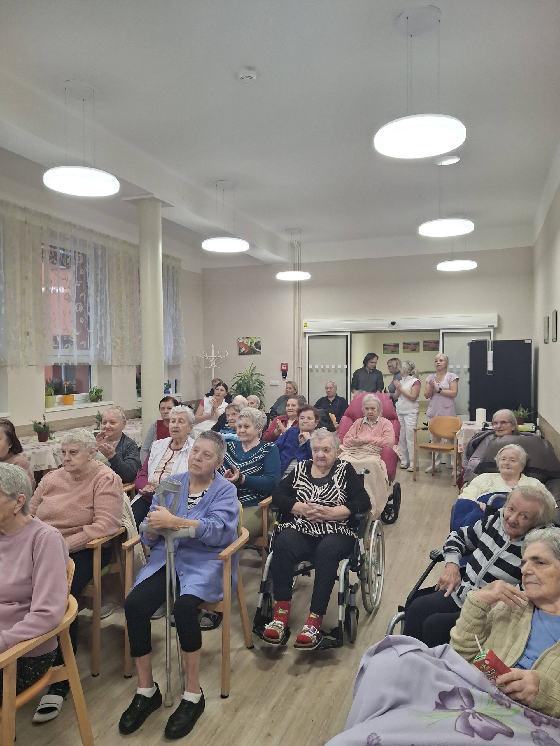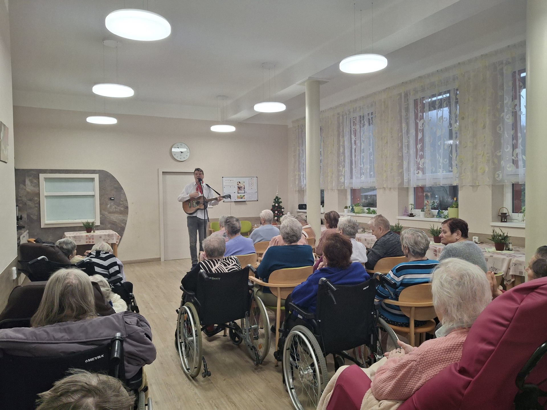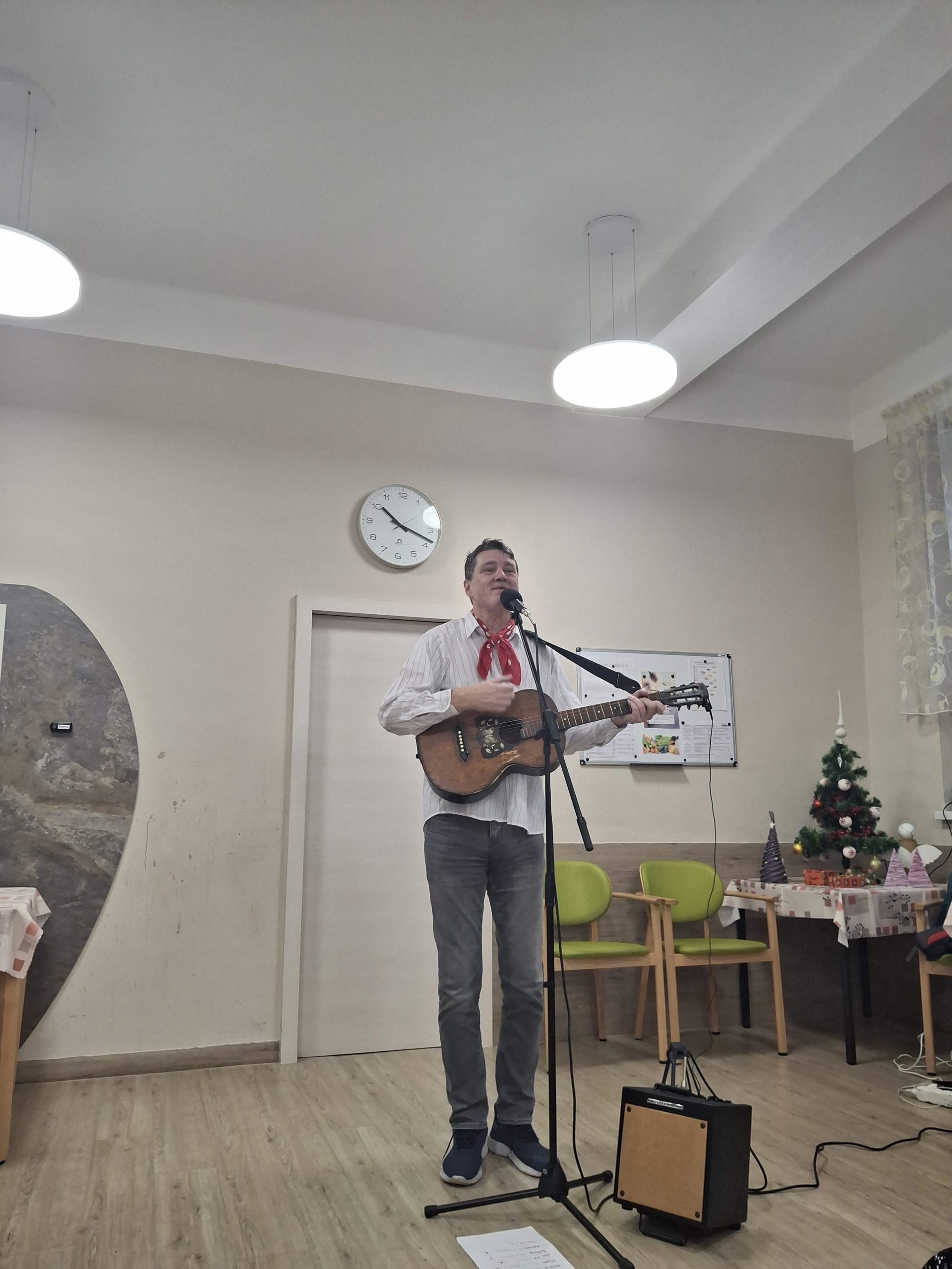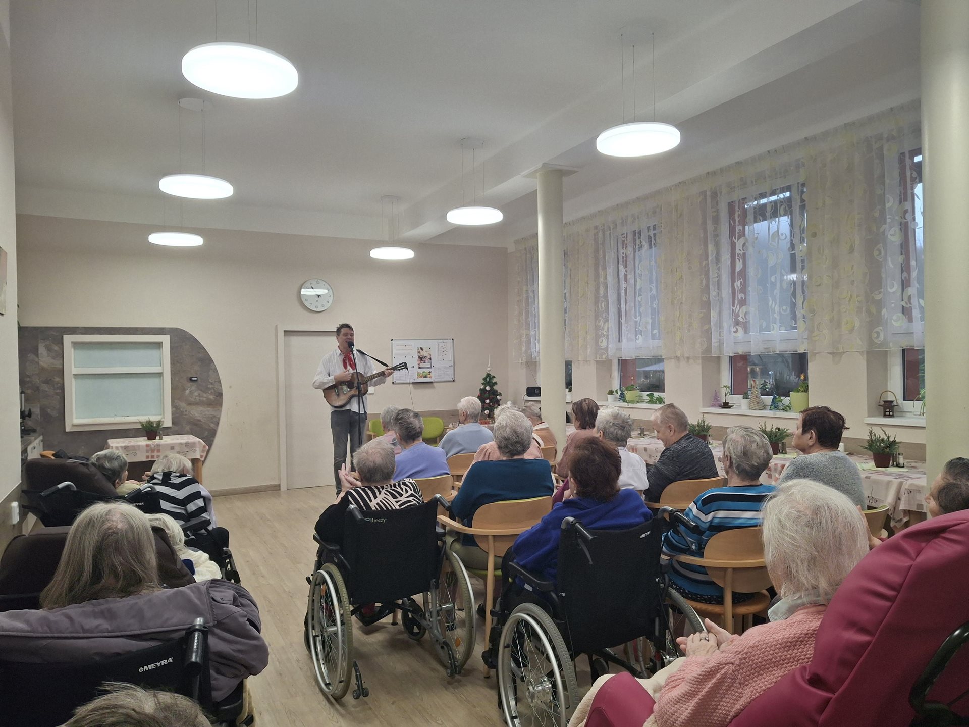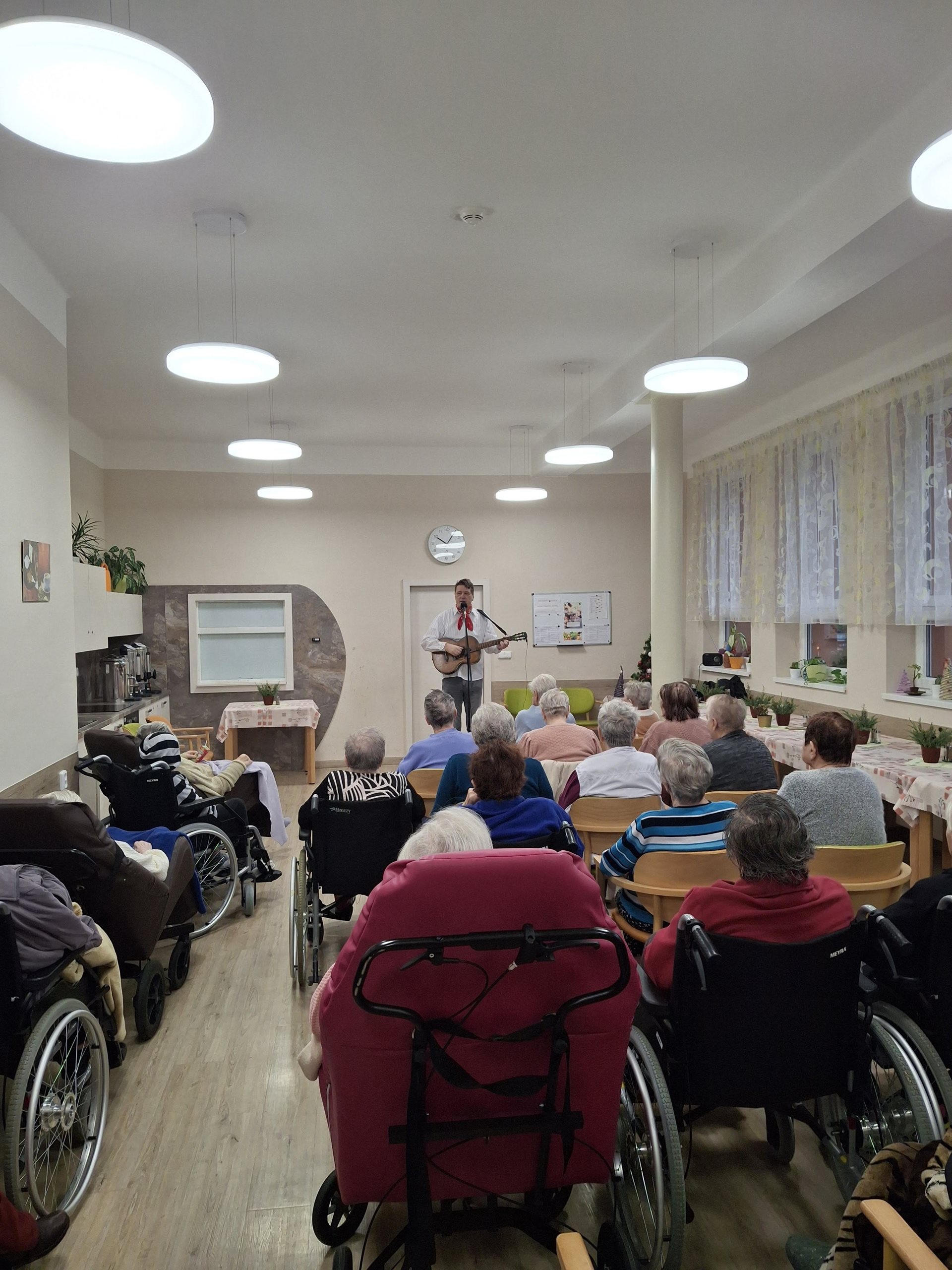 Zazněly nejznámější „šlapeťácké“ písně, staropražské a lidové skladby i oblíbené písně Karla Hašlera. Pan Pecháček myslel také na vánoční atmosféru, a tak jsme si společně zazpívali známé koledy. Publikum se sešlo v hojném počtu. Vystoupení jsme si velmi užili a byl to příjemně strávený čas.