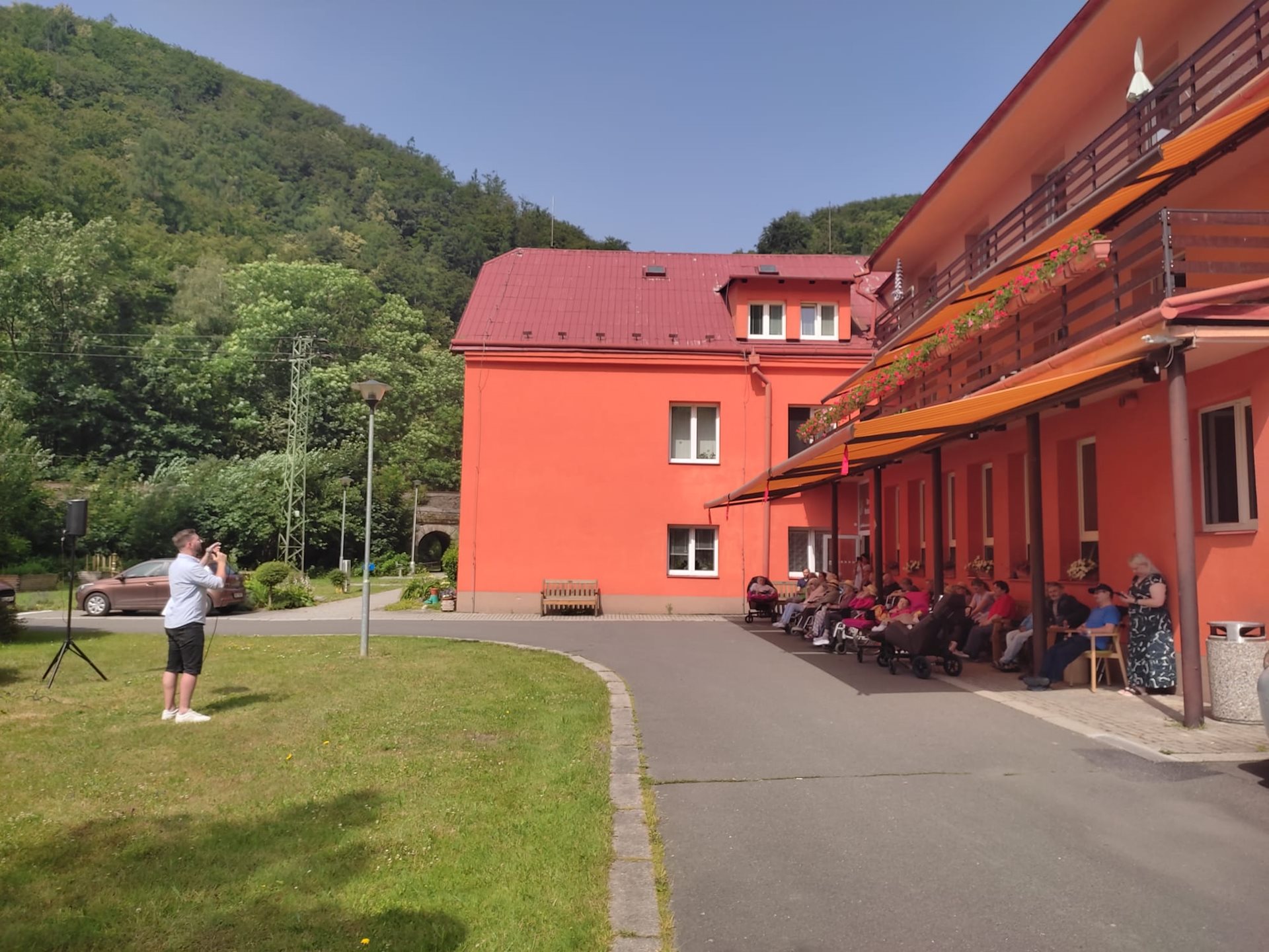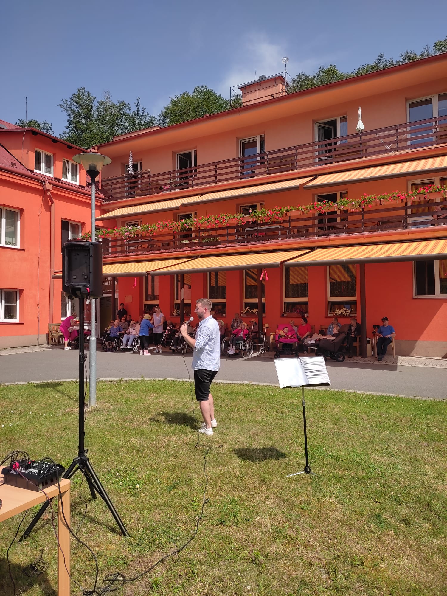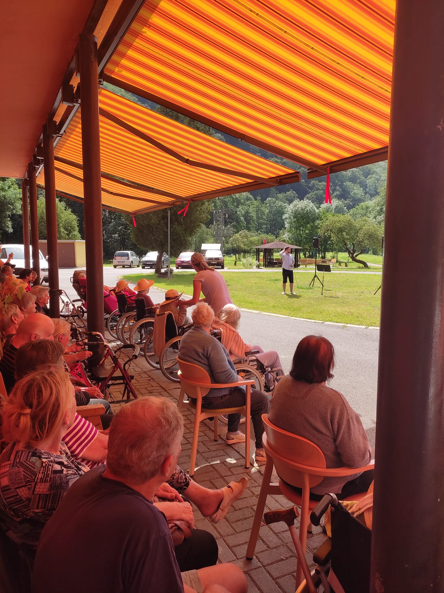 Dnes 21. 6. 2024 jsme přivítali nového interpreta, kterým je Tomáš Vaněk. Je to zpěvák a herec působící především v muzikálech. Momentálně účinkuje v jednom z nejslavnějších muzikálů Bídníci, který je uváděn v pražské GoJa Music Hall. Ztvárnil hlavní role v muzikálech Fantom opery, Ples upírů, Rent, Tick,tick...boom! a dalších. Sešli jsme se v hojném počtu, kdo nechtěl do venkovního hlediště, mohl poslouchat z horních pater nebo přímo ze svého pokoje. Moc příjemná chvilka, kdy jsme se zaposlouchali do krásného hlasu a známých písní.