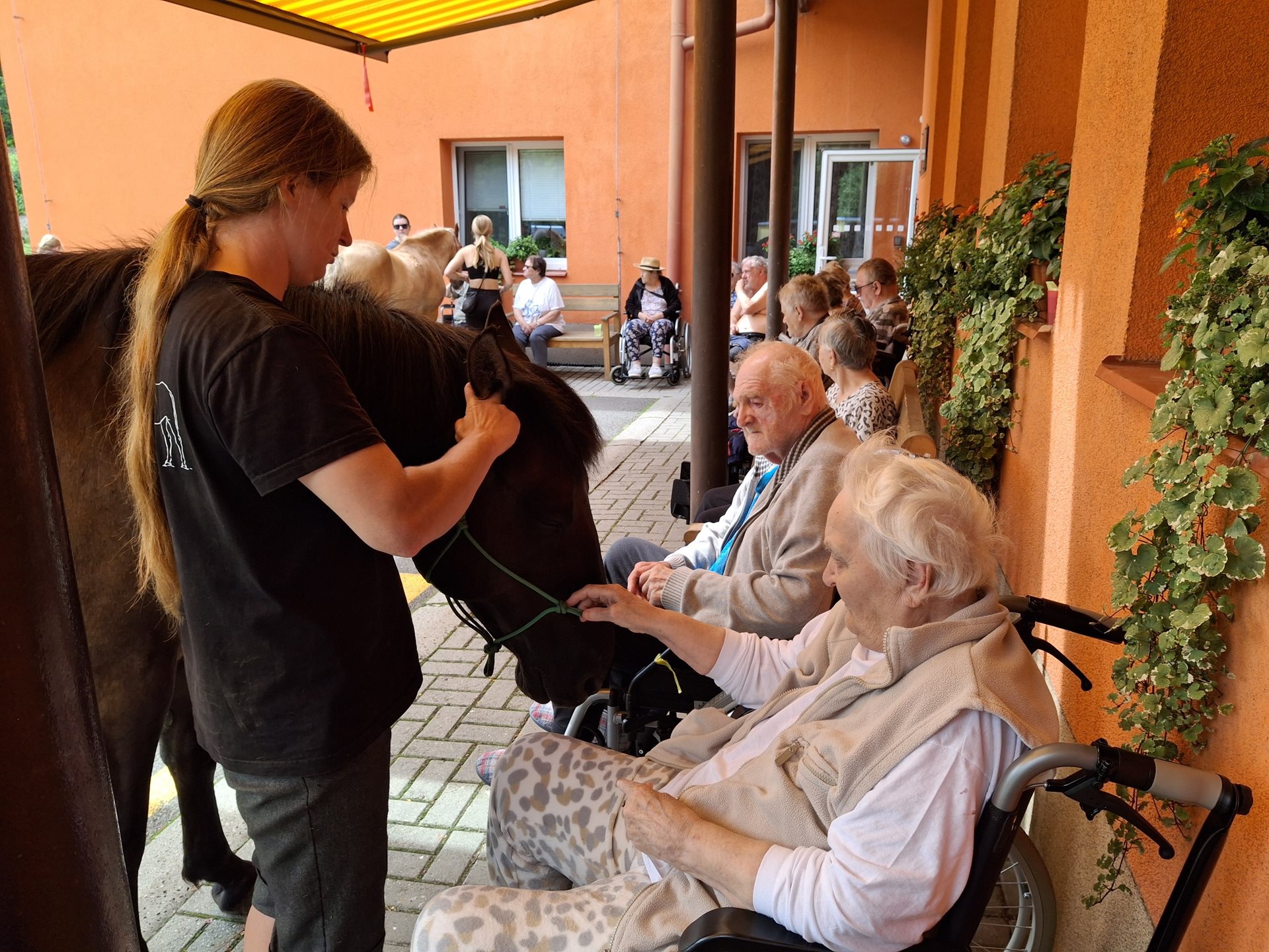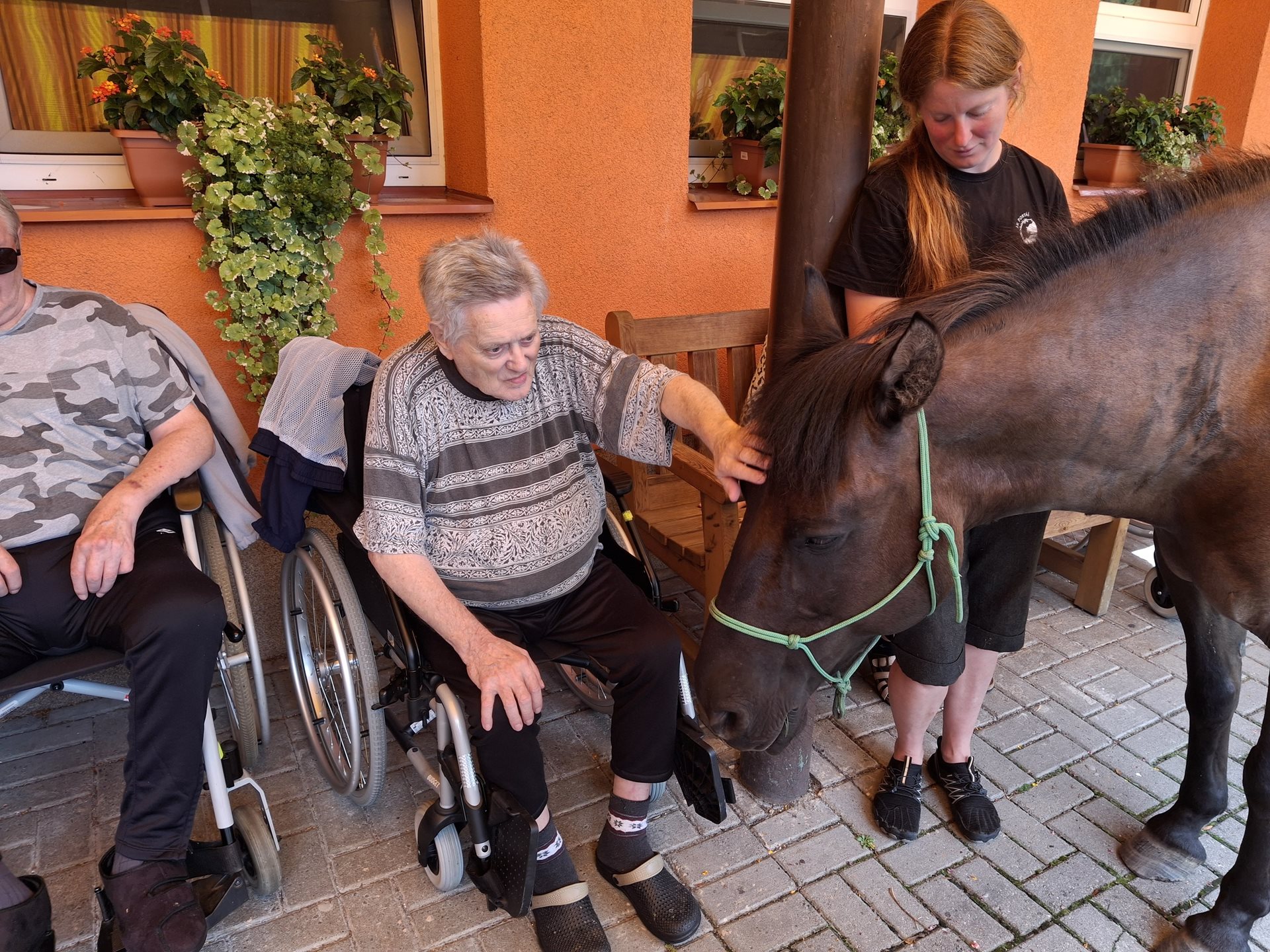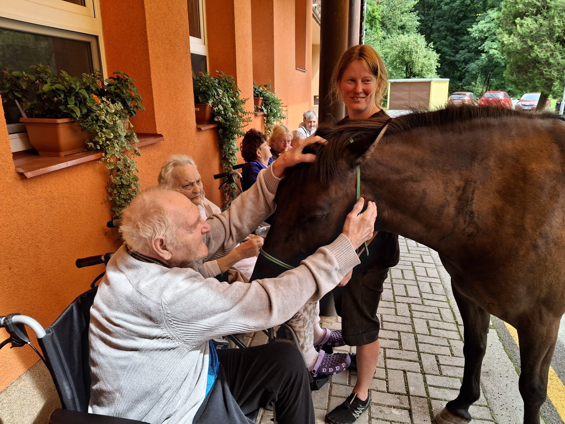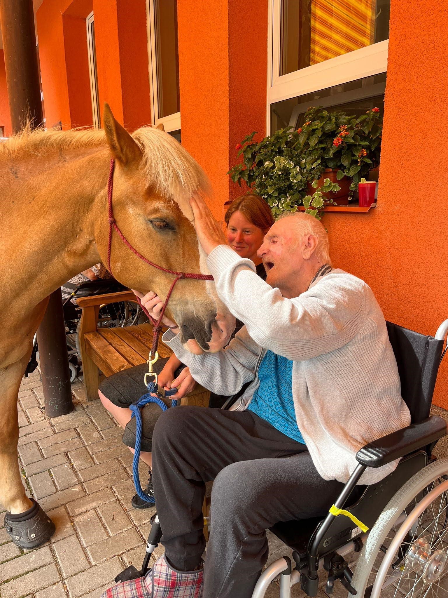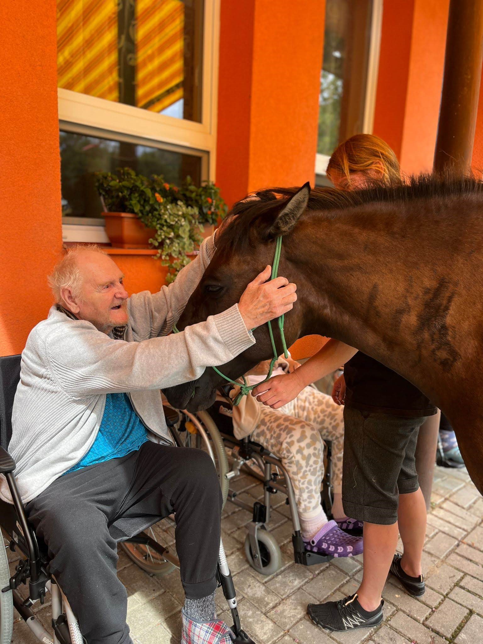 Bylo lehce pod mrakem, ale počasí nám setkání nepokazilo. V zahradě našeho Domova jsme s radostí přivítali koňské kamarády z Hrubé Vody, kteří jsou našimi sousedy. Účast byla opět bohatá a zájem veliký, všichni jsme se těšili. Během návštěvy měli uživatelé možnost koně pohladit, vyzkoušet si hřebelcování, nebo je jen v klidu pozorovat. Setkání přineslo mnoho úsměvů, milých chvil a vzpomínek, na které budeme ještě dlouho rádi vzpomínat.