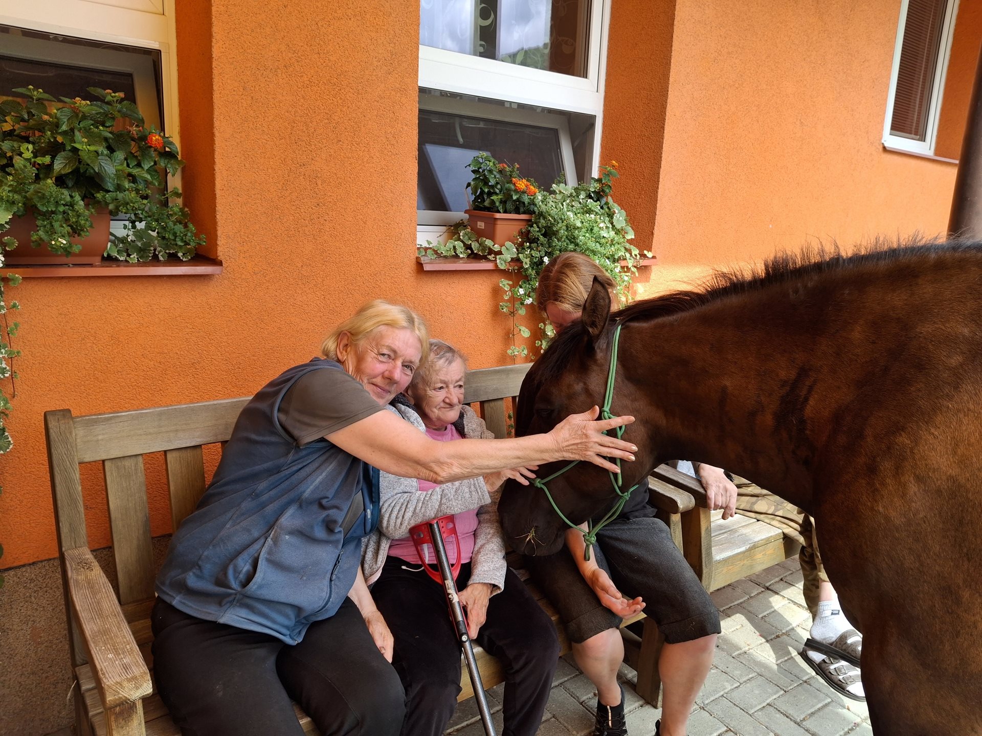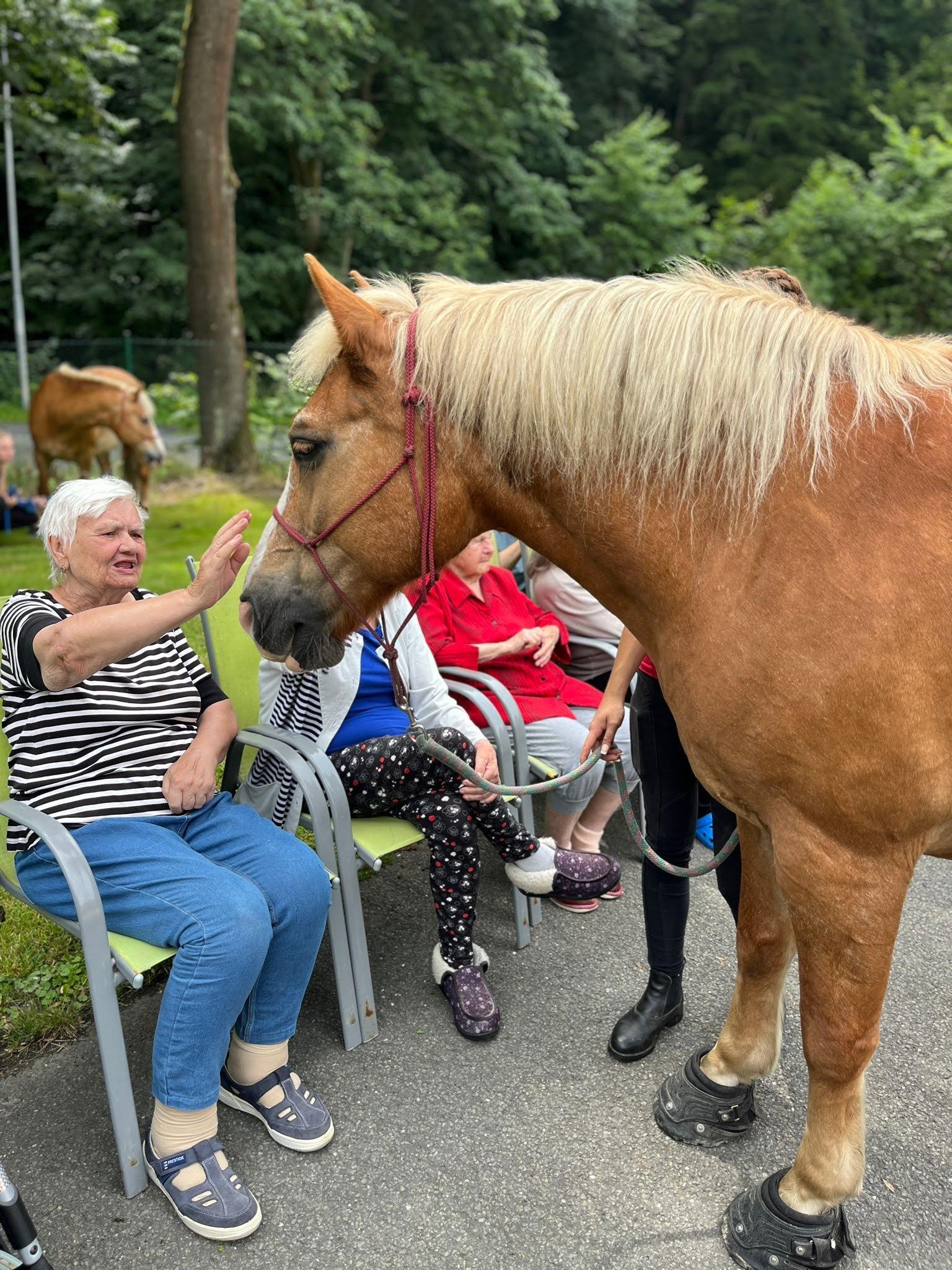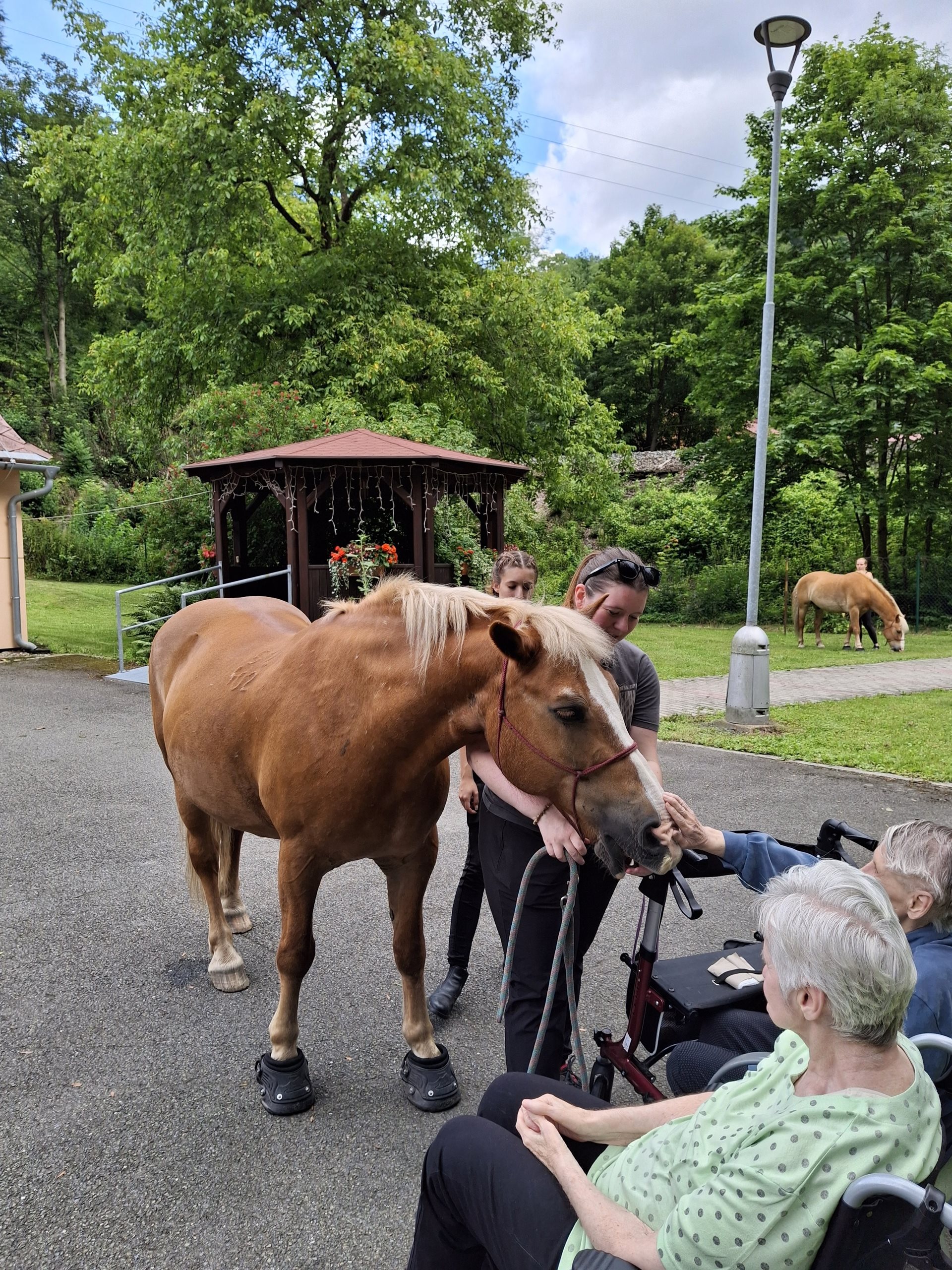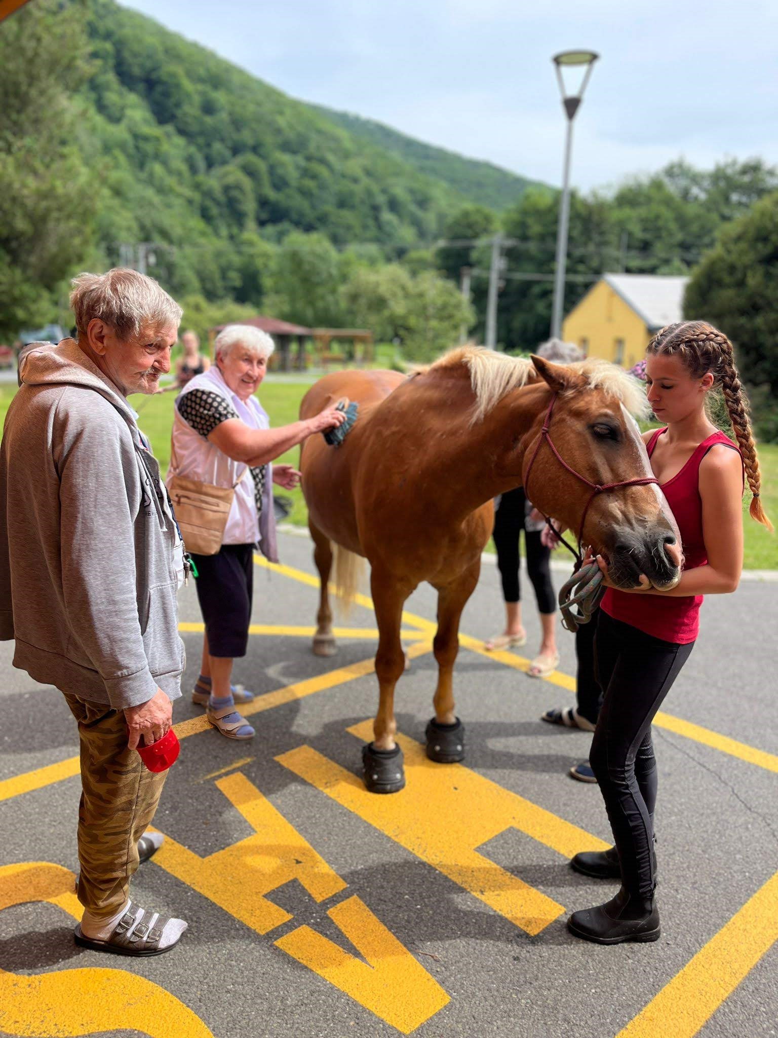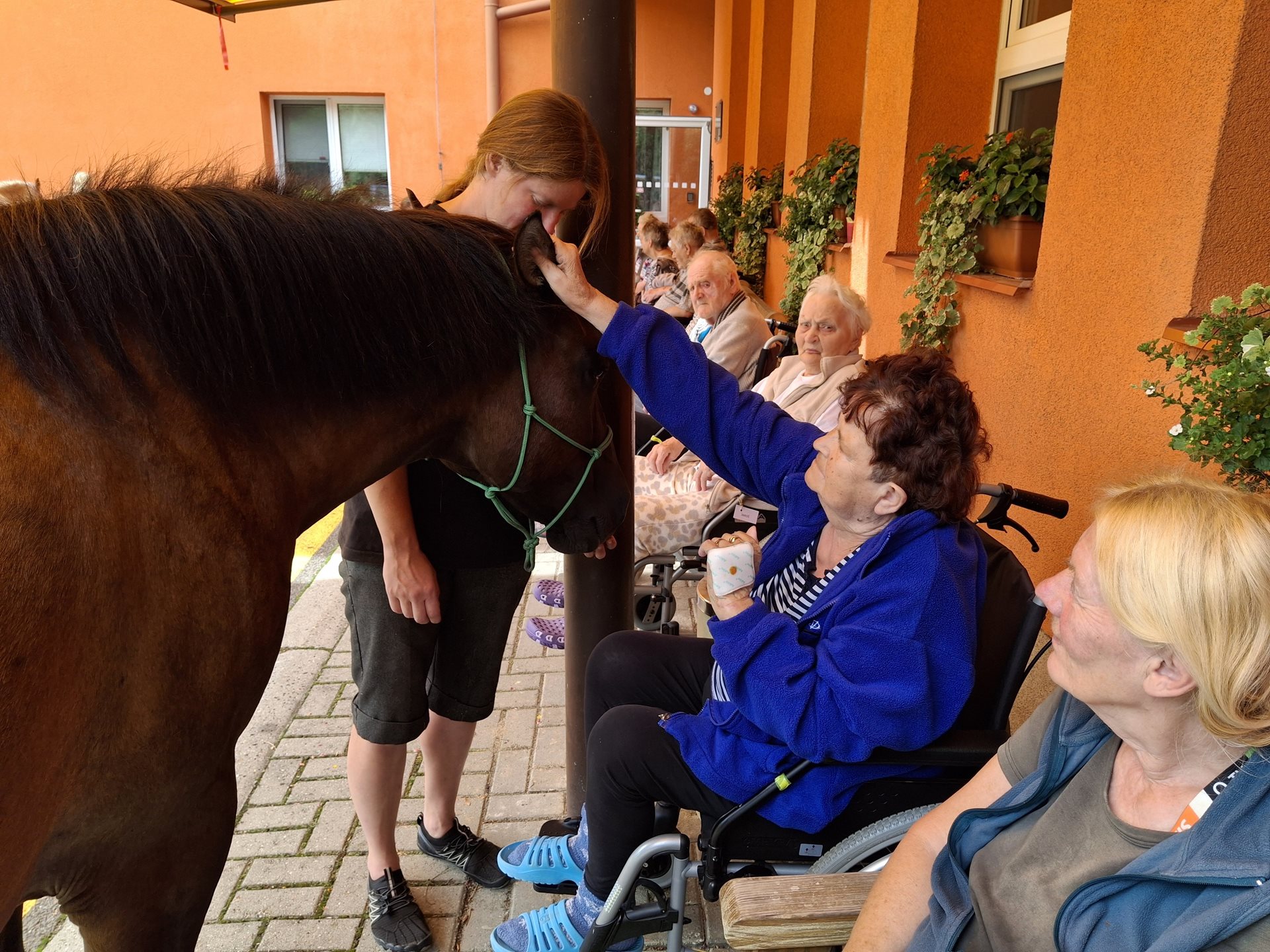 Bylo lehce pod mrakem, ale počasí nám setkání nepokazilo. V zahradě našeho Domova jsme s radostí přivítali koňské kamarády z Hrubé Vody, kteří jsou našimi sousedy. Účast byla opět bohatá a zájem veliký, všichni jsme se těšili. Během návštěvy měli uživatelé možnost koně pohladit, vyzkoušet si hřebelcování, nebo je jen v klidu pozorovat. Setkání přineslo mnoho úsměvů, milých chvil a vzpomínek, na které budeme ještě dlouho rádi vzpomínat.