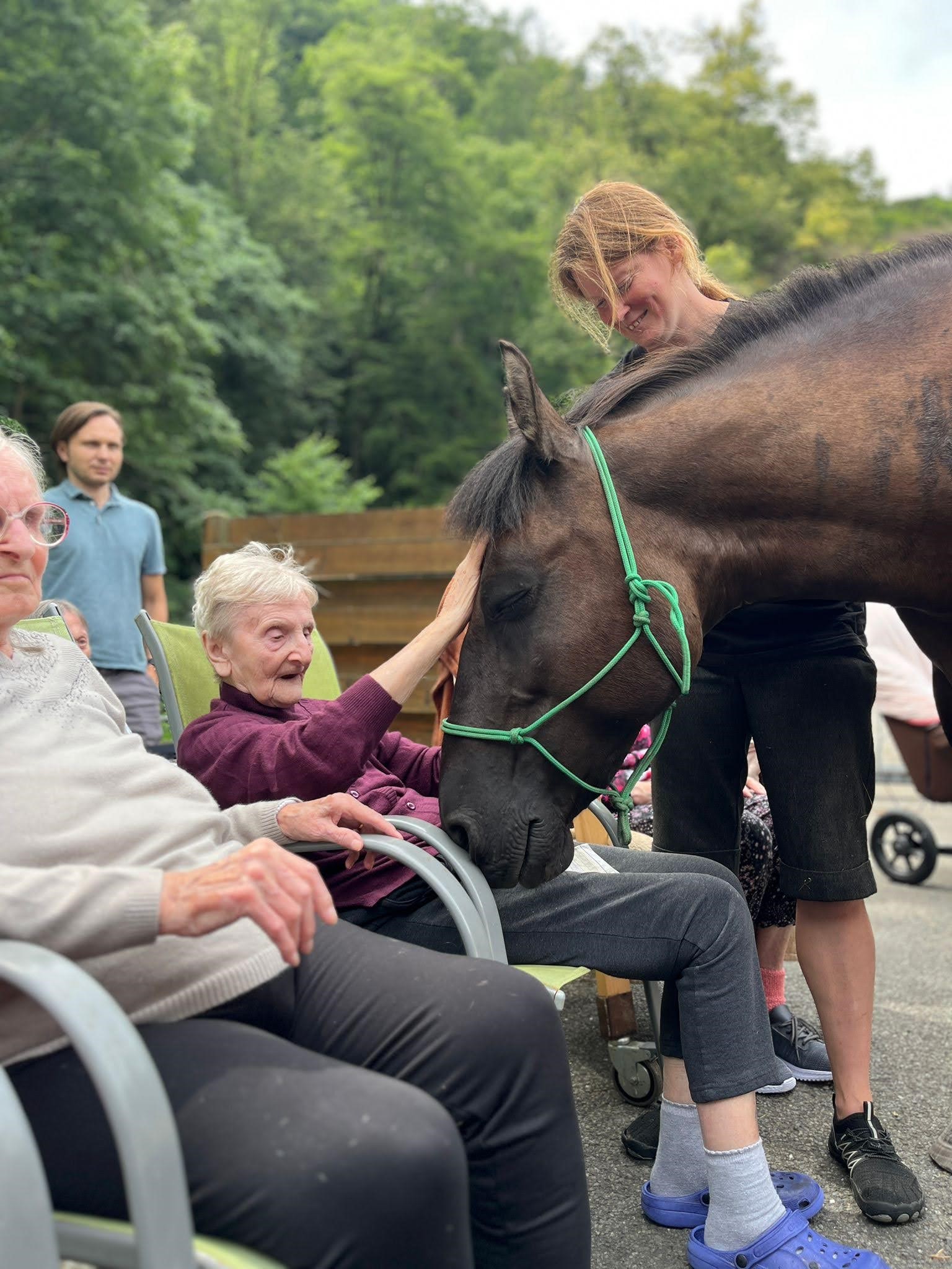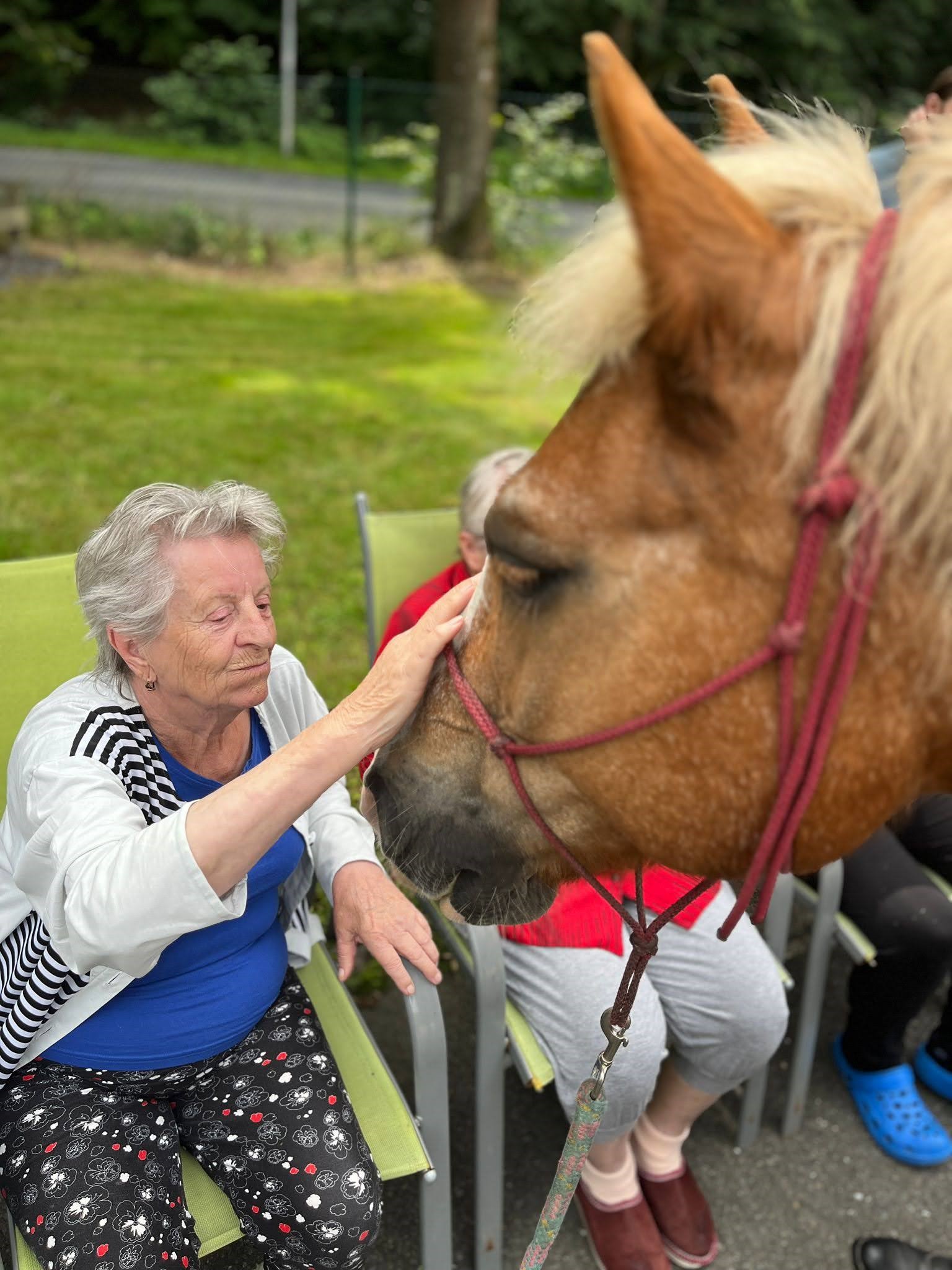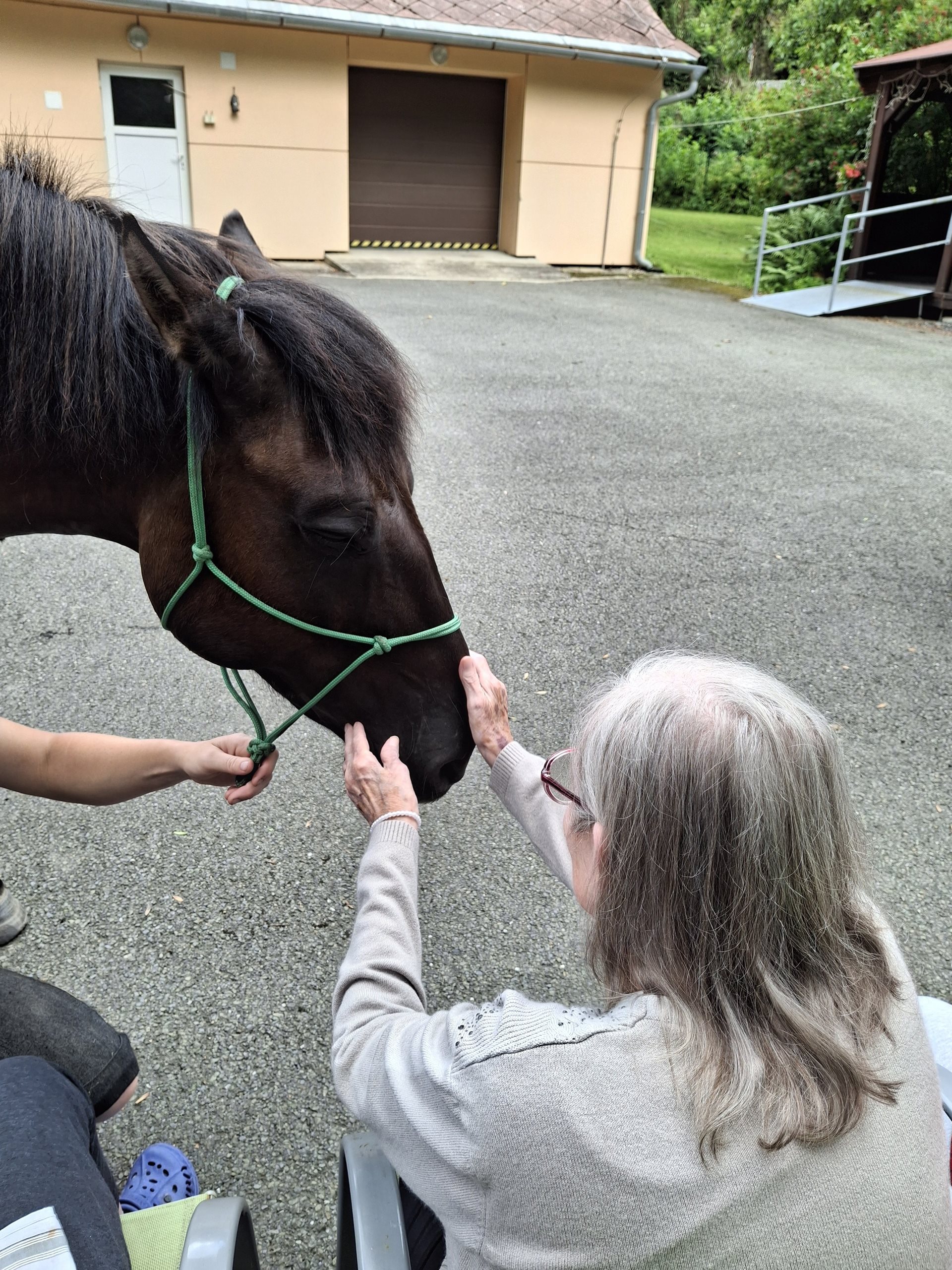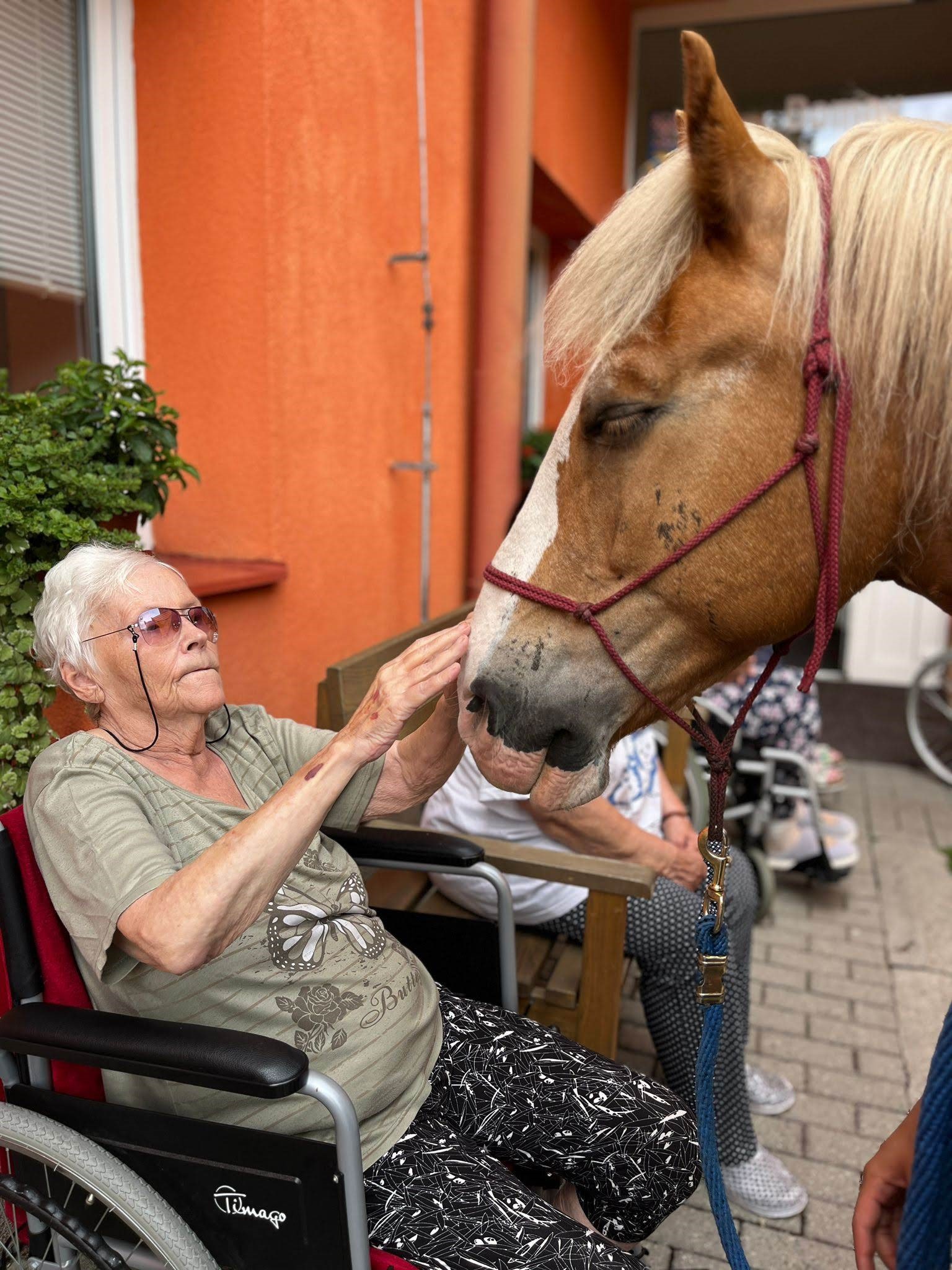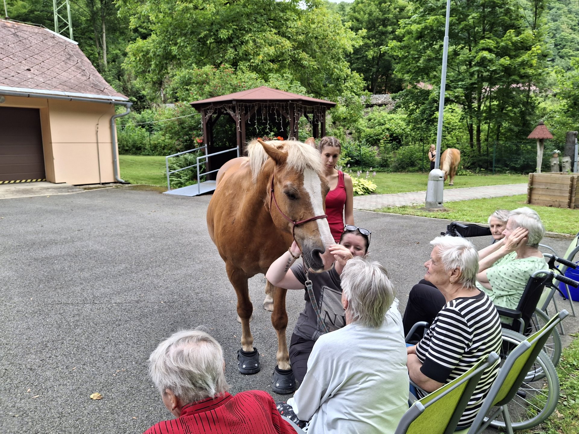 Bylo lehce pod mrakem, ale počasí nám setkání nepokazilo. V zahradě našeho Domova jsme s radostí přivítali koňské kamarády z Hrubé Vody, kteří jsou našimi sousedy. Účast byla opět bohatá a zájem veliký, všichni jsme se těšili. Během návštěvy měli uživatelé možnost koně pohladit, vyzkoušet si hřebelcování, nebo je jen v klidu pozorovat. Setkání přineslo mnoho úsměvů, milých chvil a vzpomínek, na které budeme ještě dlouho rádi vzpomínat.