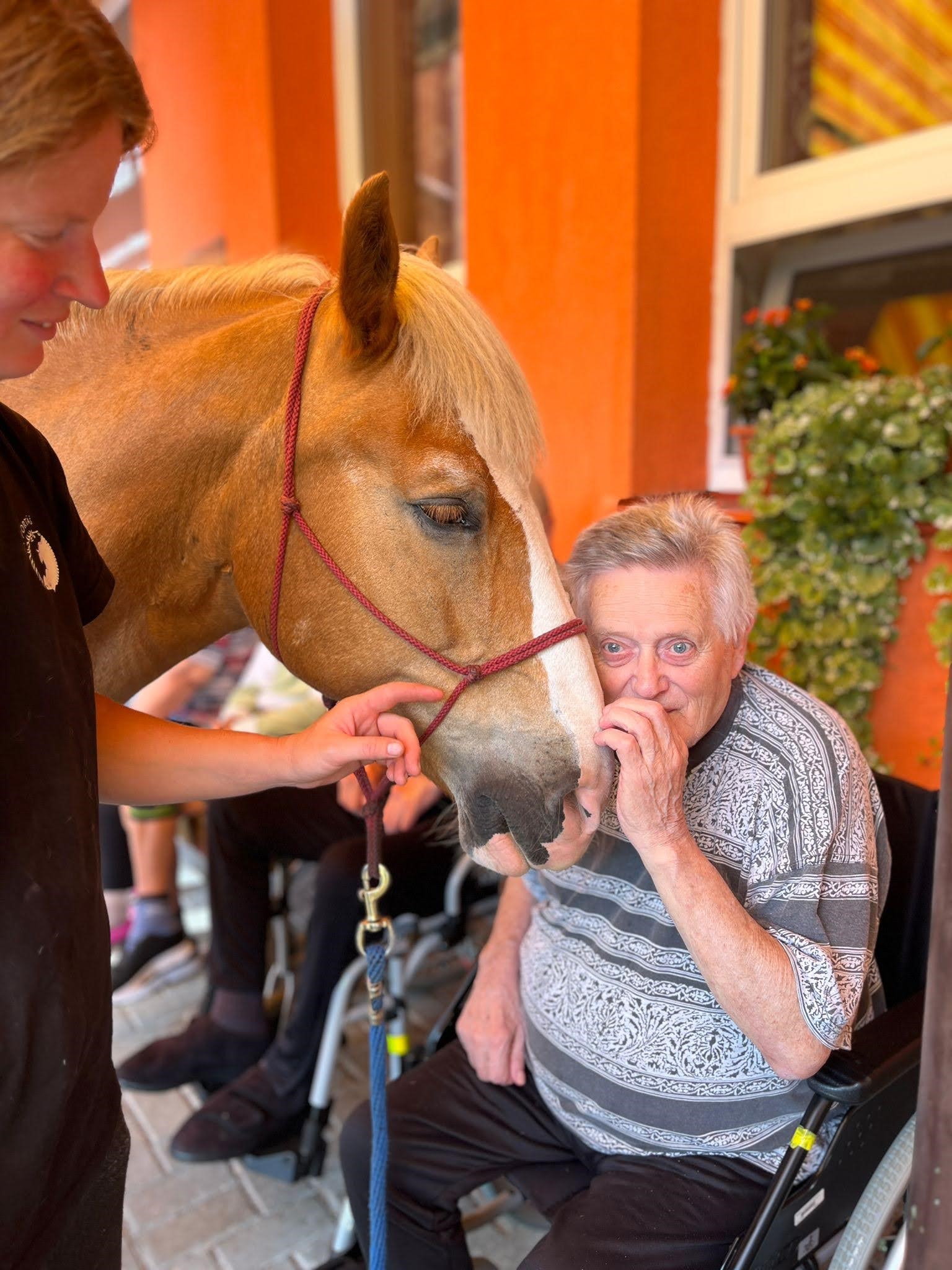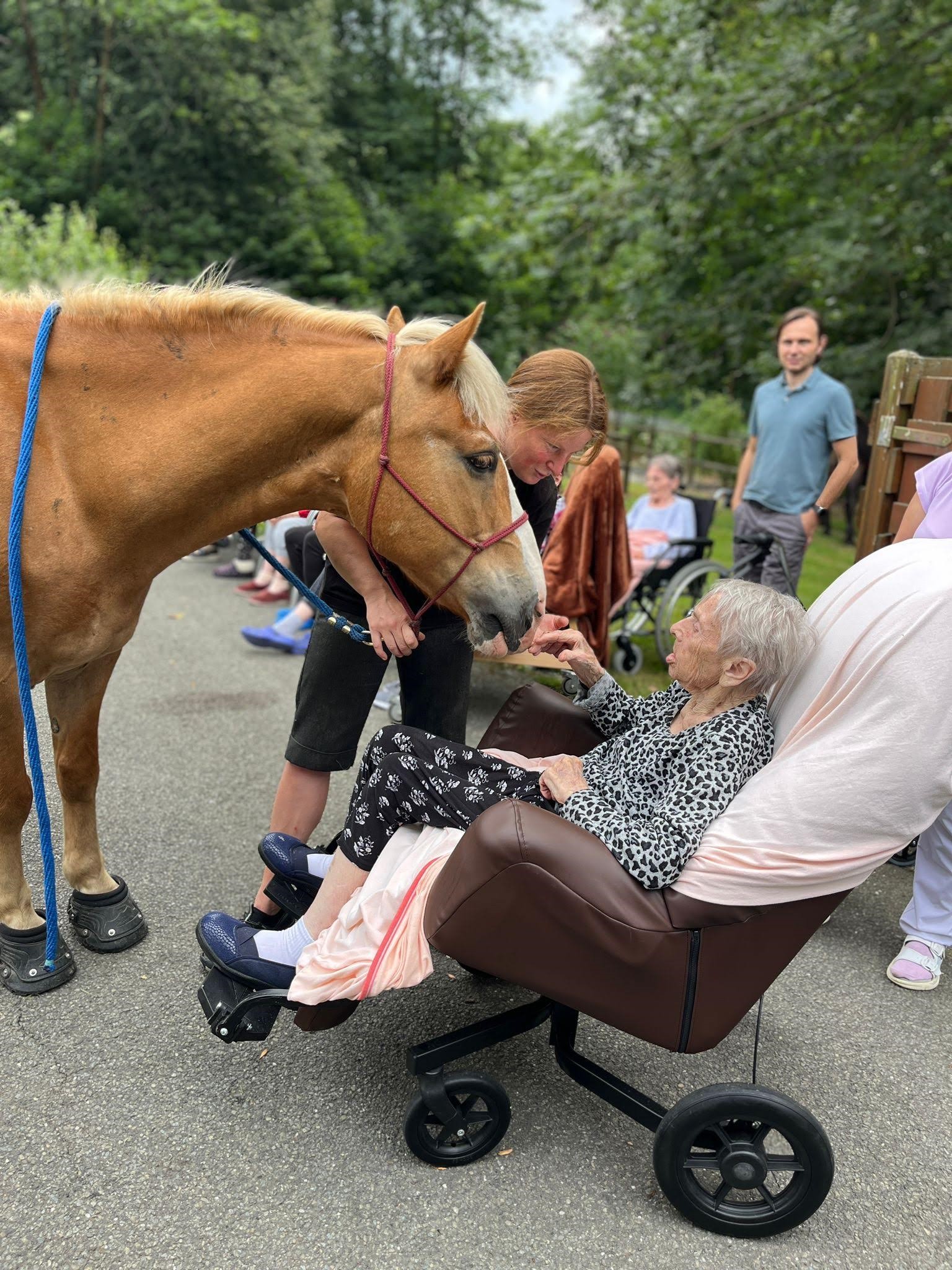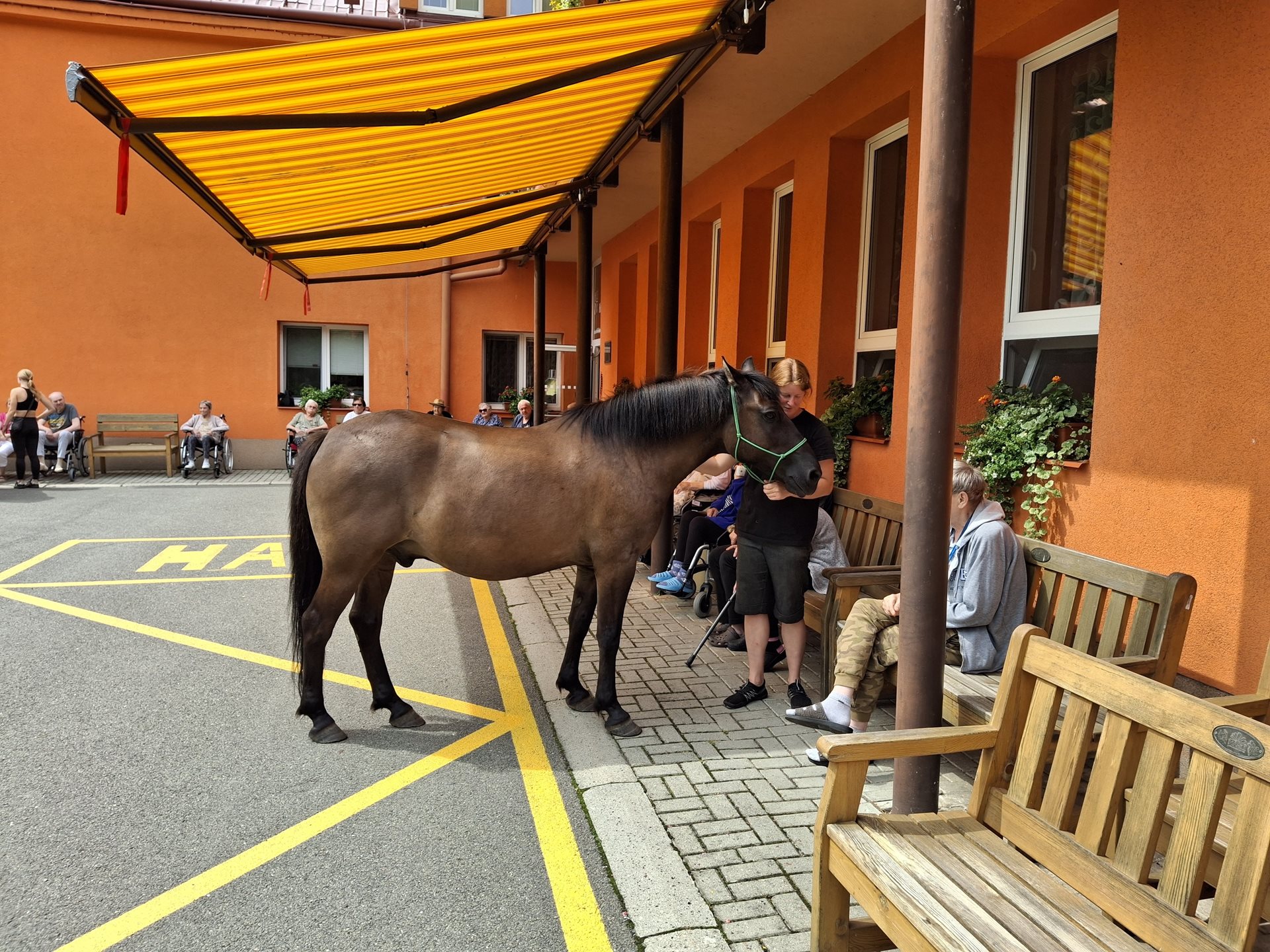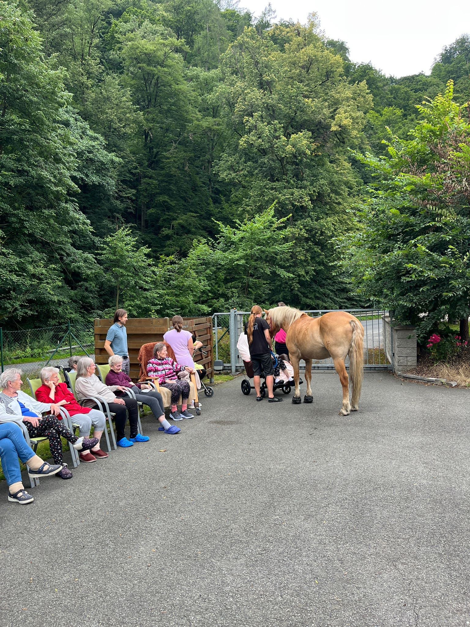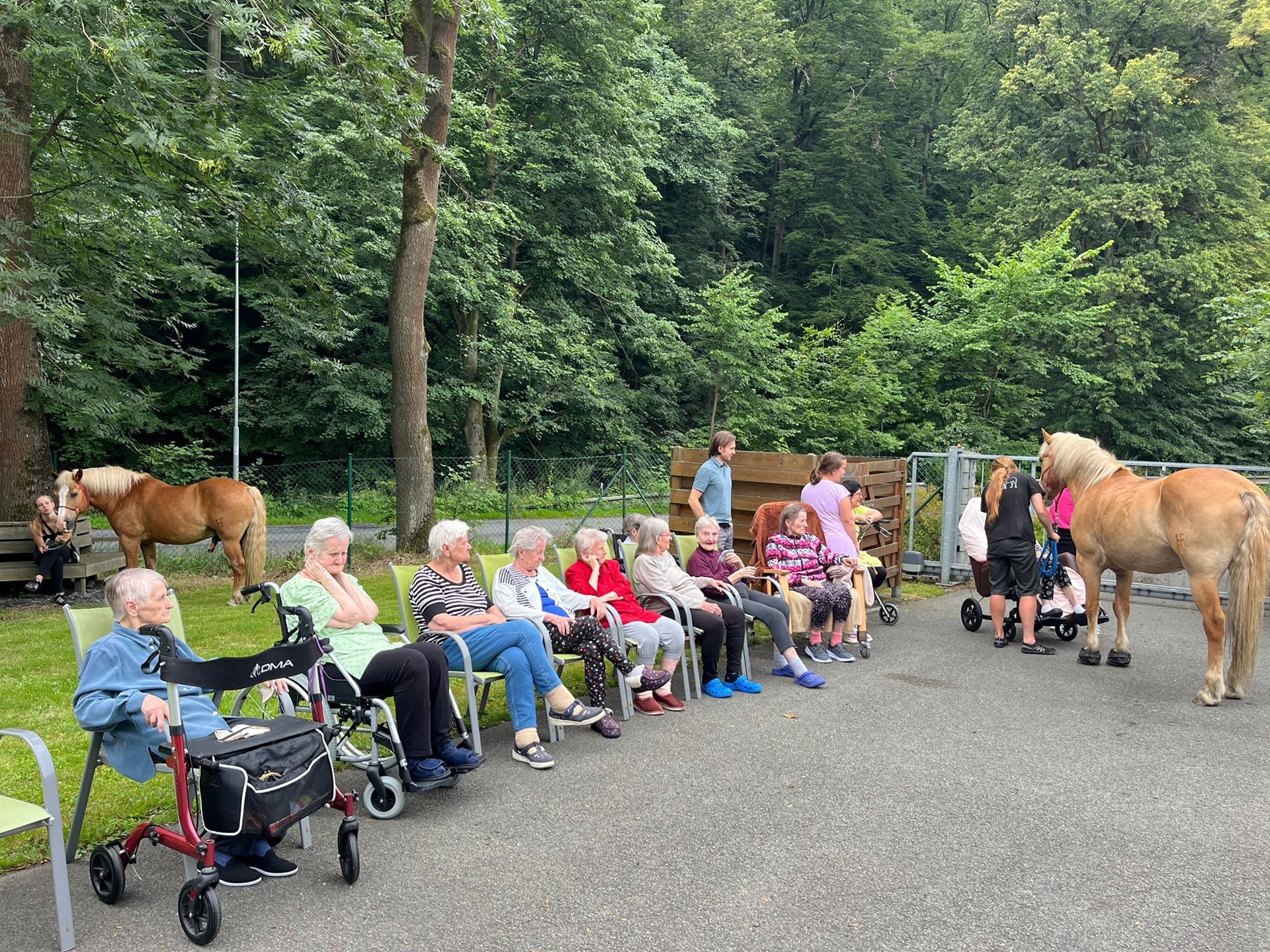 Bylo lehce pod mrakem, ale počasí nám setkání nepokazilo. V zahradě našeho Domova jsme s radostí přivítali koňské kamarády z Hrubé Vody, kteří jsou našimi sousedy. Účast byla opět bohatá a zájem veliký, všichni jsme se těšili. Během návštěvy měli uživatelé možnost koně pohladit, vyzkoušet si hřebelcování, nebo je jen v klidu pozorovat. Setkání přineslo mnoho úsměvů, milých chvil a vzpomínek, na které budeme ještě dlouho rádi vzpomínat.