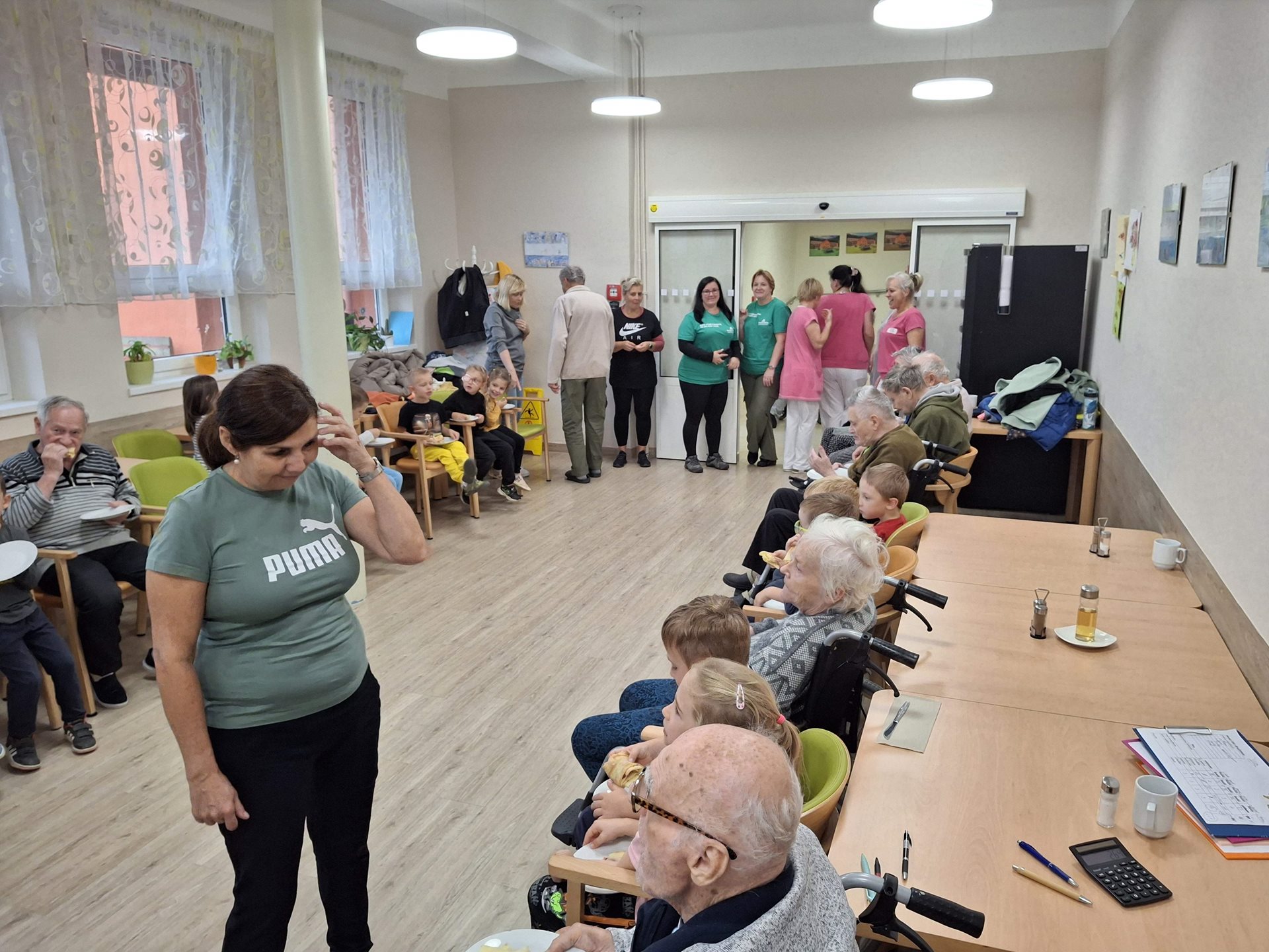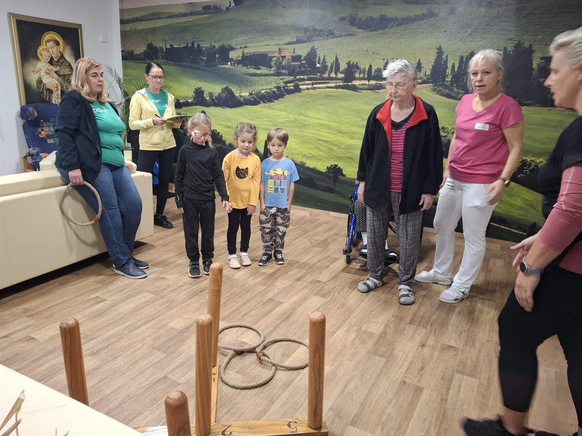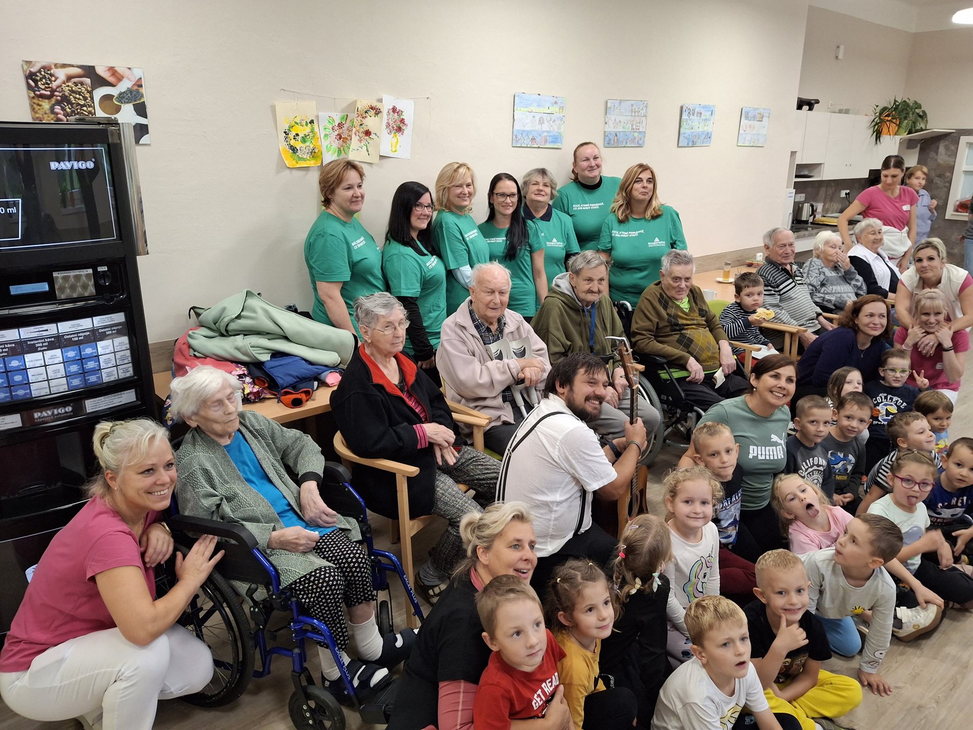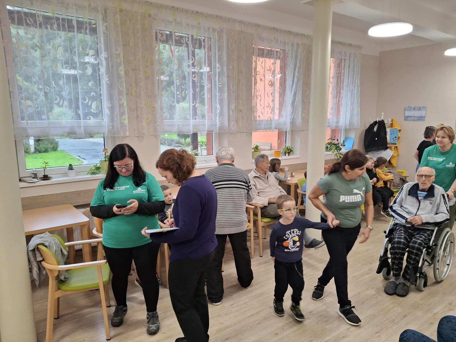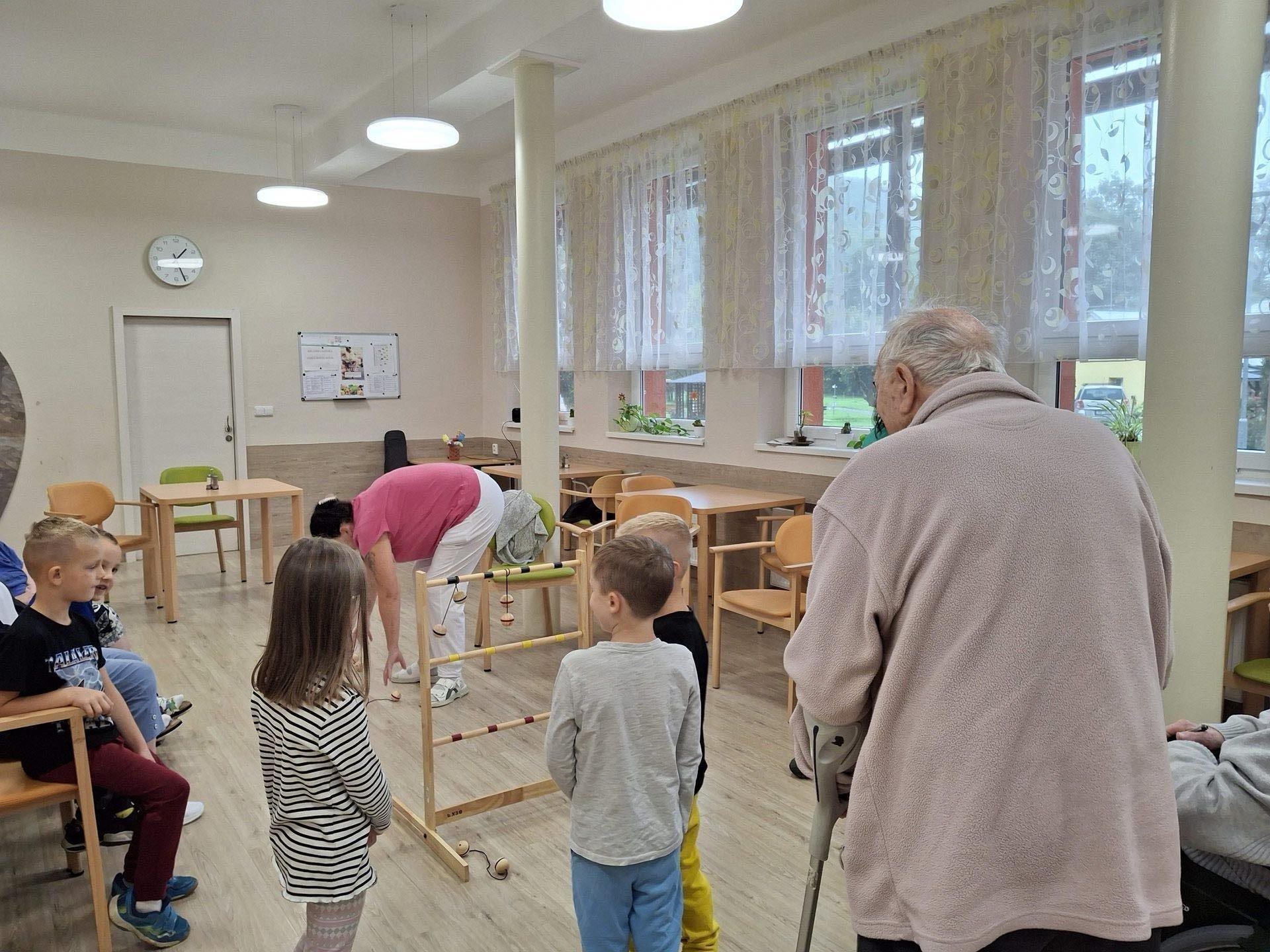 Ve středu 24. září jsme již podruhé v tomto roce uspořádali mezigenerační sportovní hry, které nesly podtitul „Když senioři a děti táhnou za jeden provaz.“ Počasí nám od samého rána příliš nepřálo – pršelo, foukal silný vítr a sluníčko se ani neukázalo. Déšť sice později ustoupil, ale vítr přetrvával, a tak jsme se rozhodli celý program operativně přesunout do vnitřních prostor. A světe div se – všechna stanoviště se vešla! Byl to den plný pohybu, her, smíchu, radosti, a především mezigeneračního porozumění. Naši milí uživatelé se opět společně s dětmi zapojili do pestrých sportovních disciplín. Připravili jsme celkem pět stanovišť: