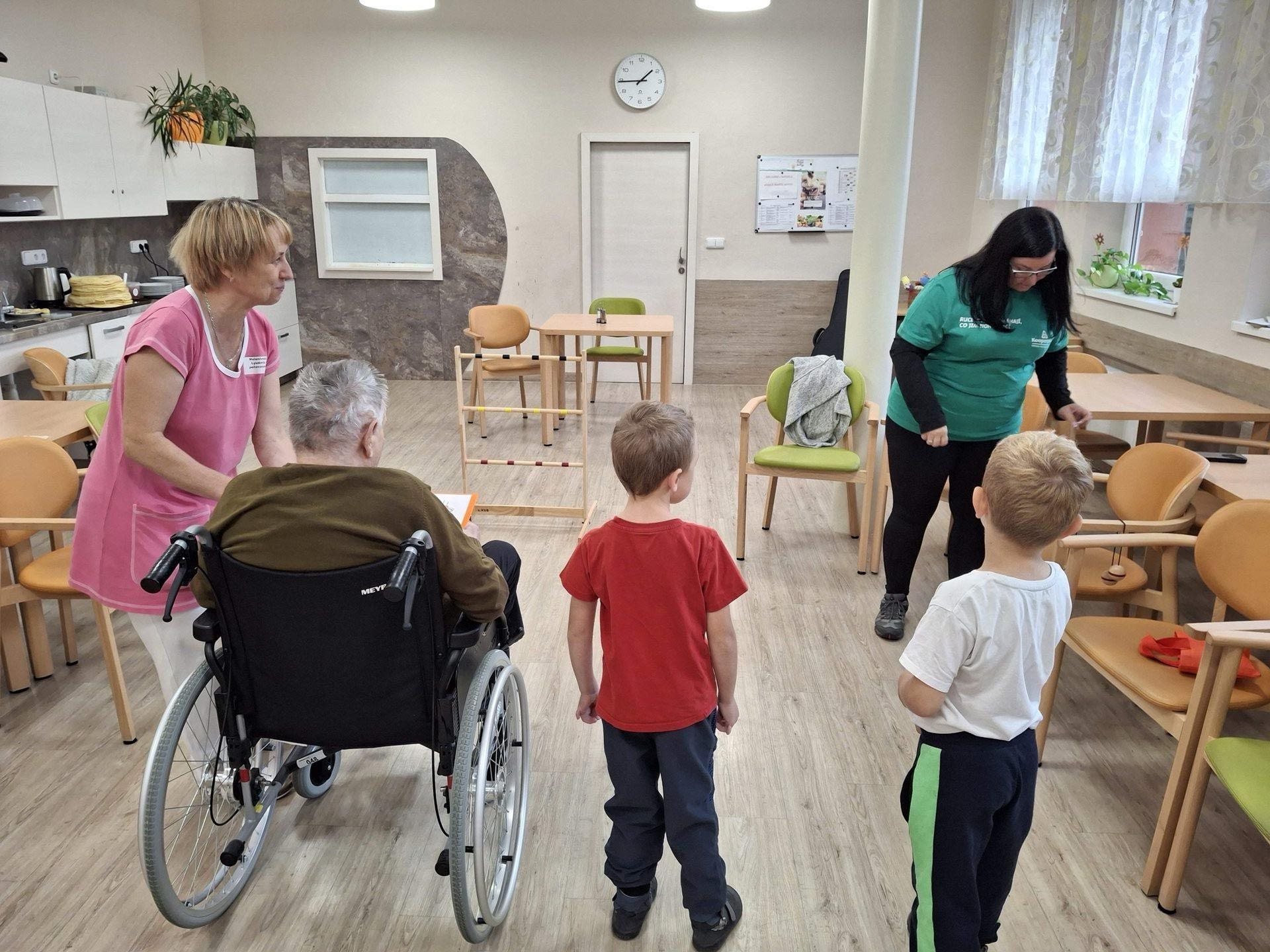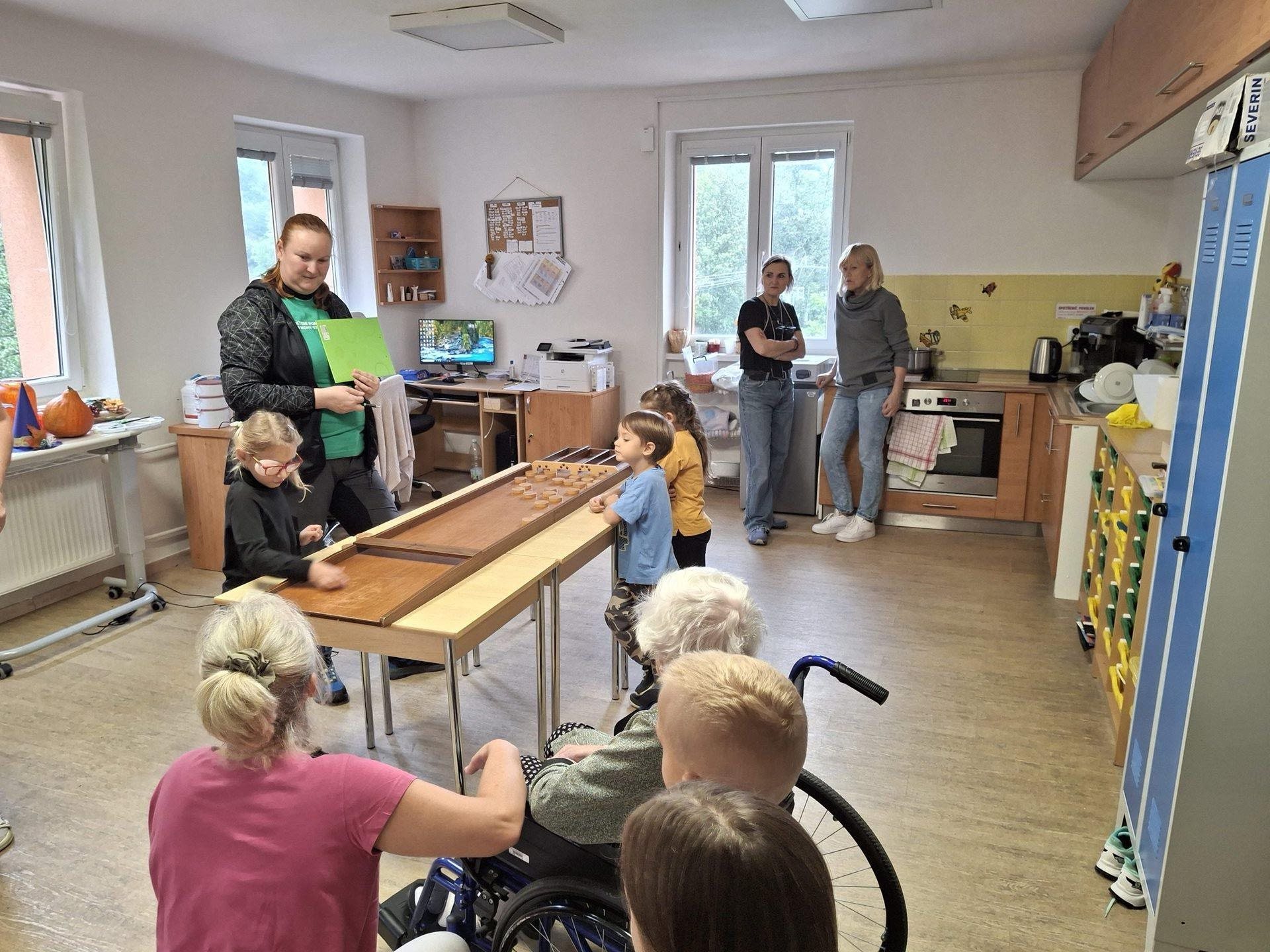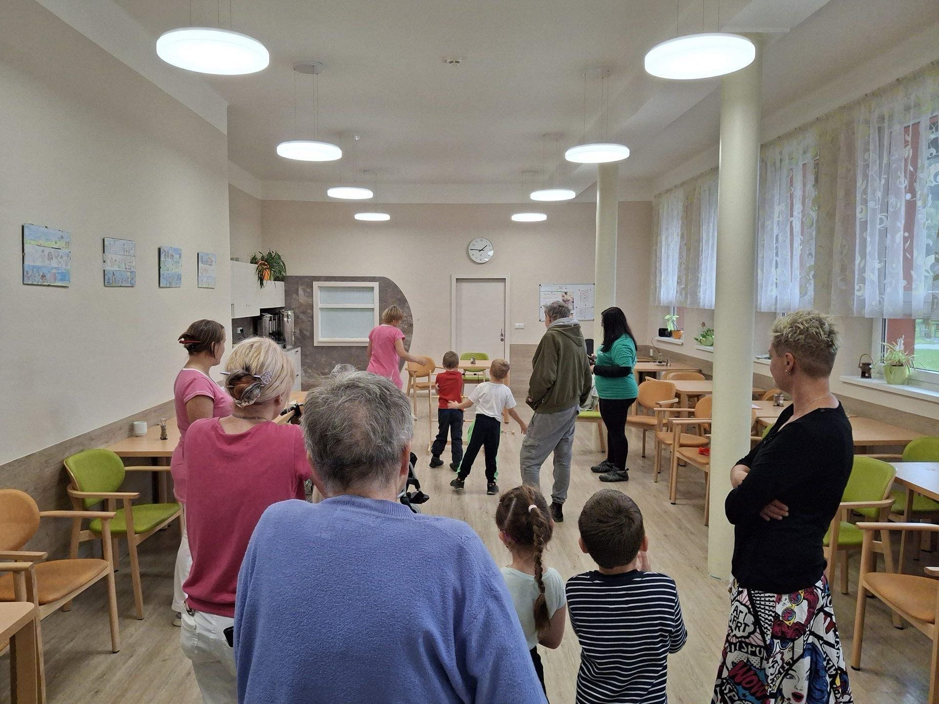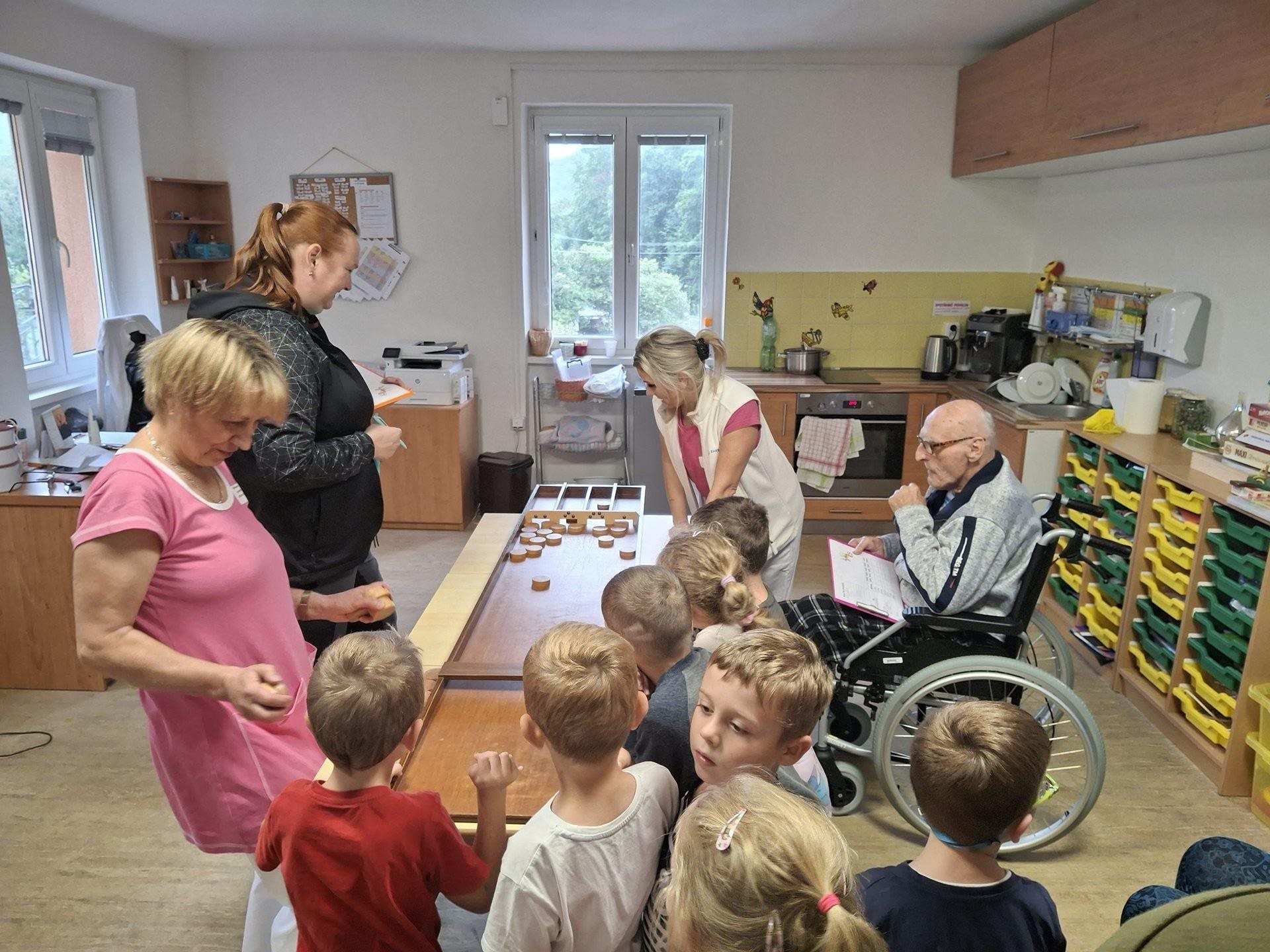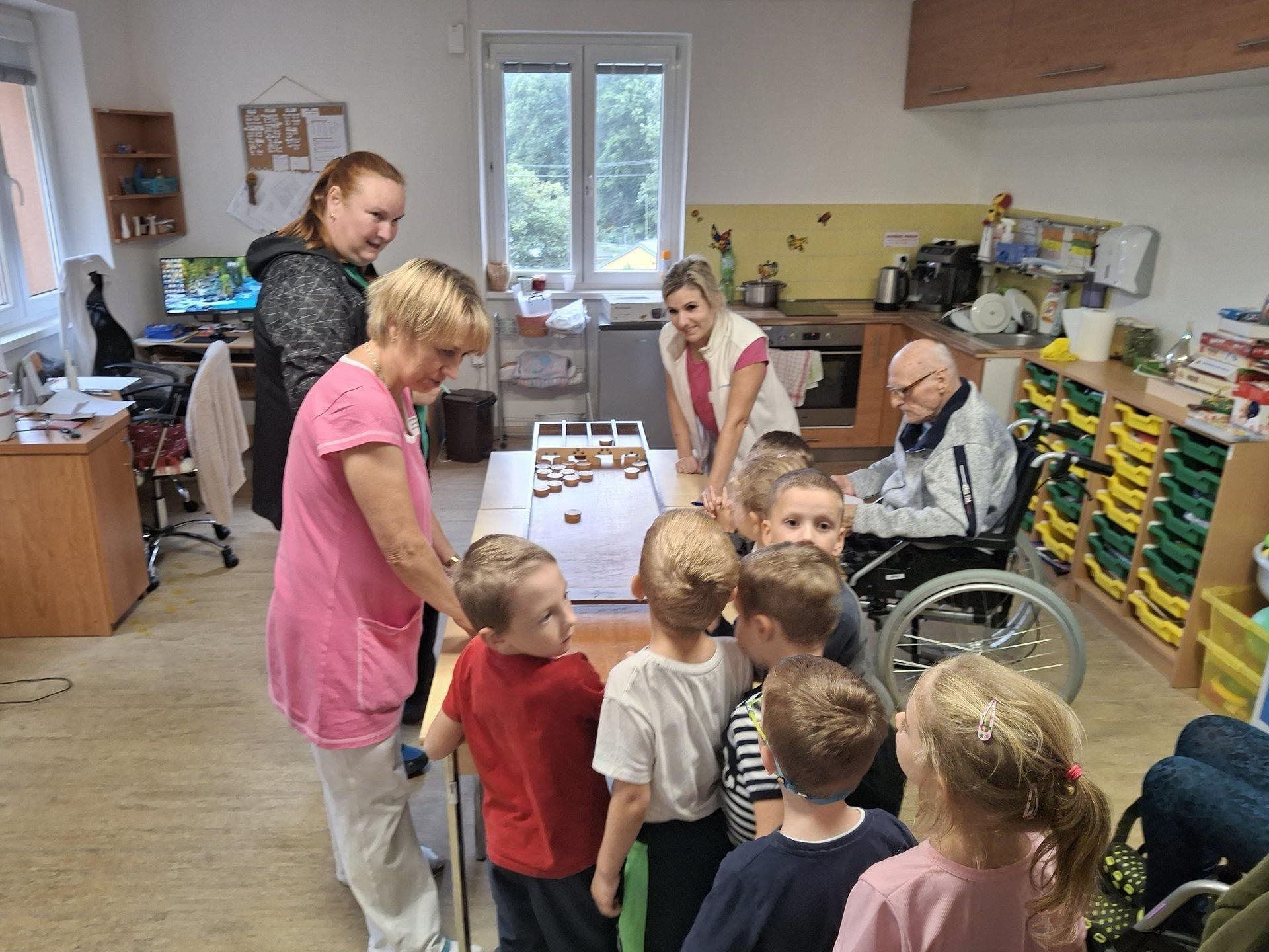 Ve středu 24. září jsme již podruhé v tomto roce uspořádali mezigenerační sportovní hry, které nesly podtitul „Když senioři a děti táhnou za jeden provaz.“ Počasí nám od samého rána příliš nepřálo – pršelo, foukal silný vítr a sluníčko se ani neukázalo. Déšť sice později ustoupil, ale vítr přetrvával, a tak jsme se rozhodli celý program operativně přesunout do vnitřních prostor. A světe div se – všechna stanoviště se vešla! Byl to den plný pohybu, her, smíchu, radosti, a především mezigeneračního porozumění. Naši milí uživatelé se opět společně s dětmi zapojili do pestrých sportovních disciplín. Připravili jsme celkem pět stanovišť: