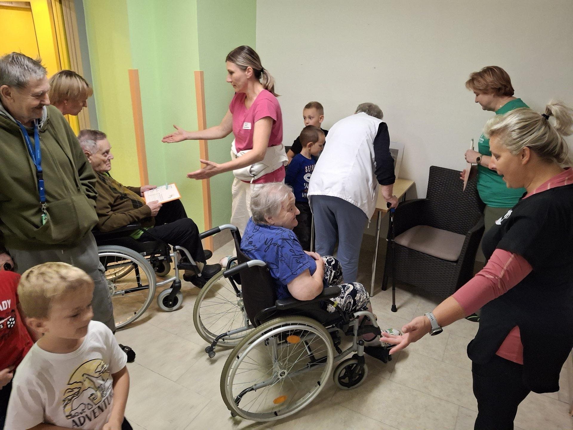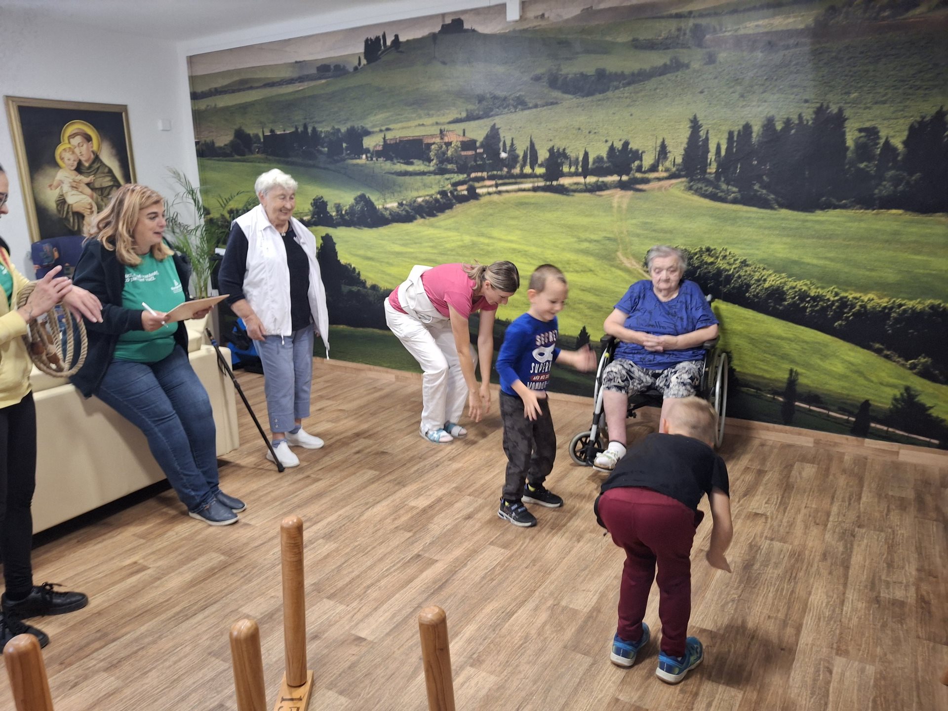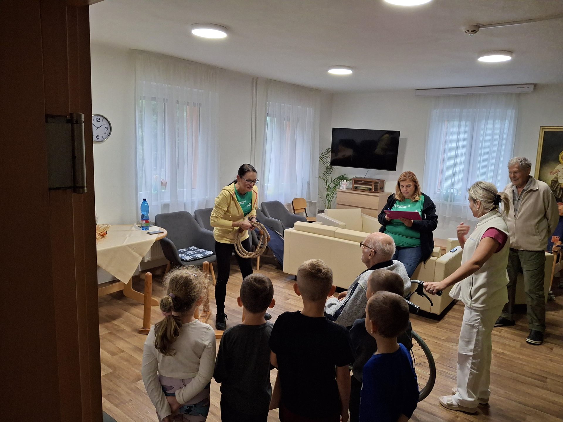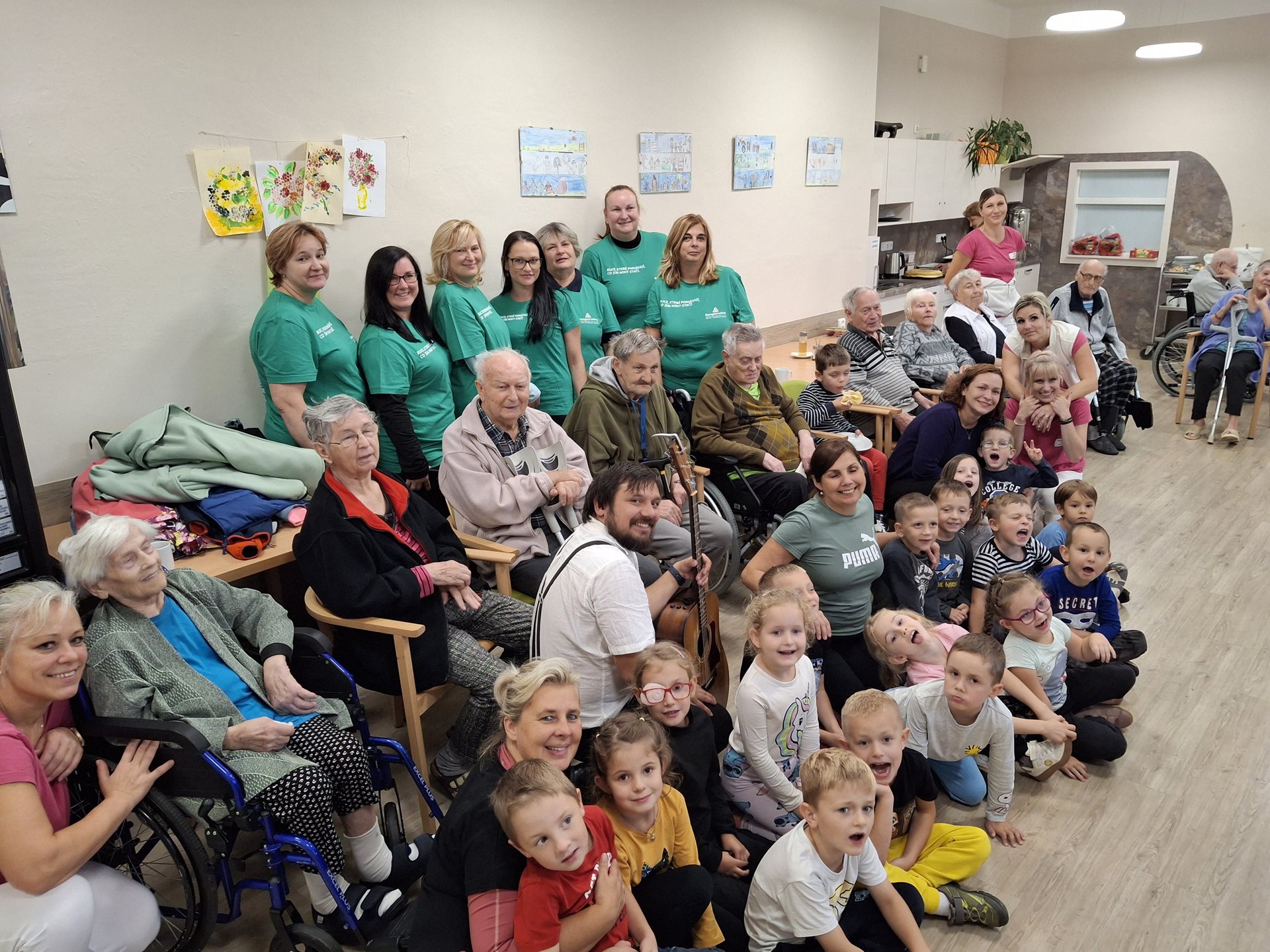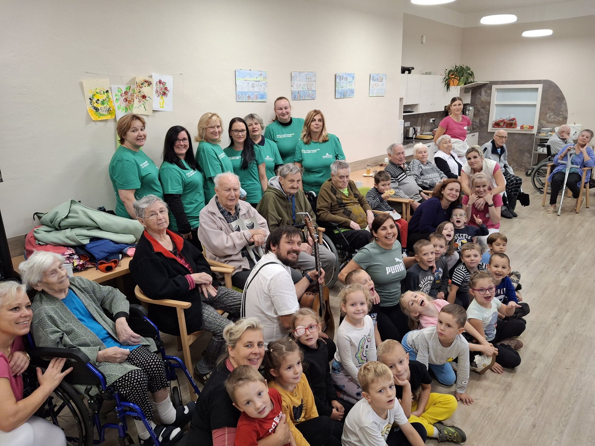 Ve středu 24. září jsme již podruhé v tomto roce uspořádali mezigenerační sportovní hry, které nesly podtitul „Když senioři a děti táhnou za jeden provaz.“ Počasí nám od samého rána příliš nepřálo – pršelo, foukal silný vítr a sluníčko se ani neukázalo. Déšť sice později ustoupil, ale vítr přetrvával, a tak jsme se rozhodli celý program operativně přesunout do vnitřních prostor. A světe div se – všechna stanoviště se vešla! Byl to den plný pohybu, her, smíchu, radosti, a především mezigeneračního porozumění. Naši milí uživatelé se opět společně s dětmi zapojili do pestrých sportovních disciplín. Připravili jsme celkem pět stanovišť:
