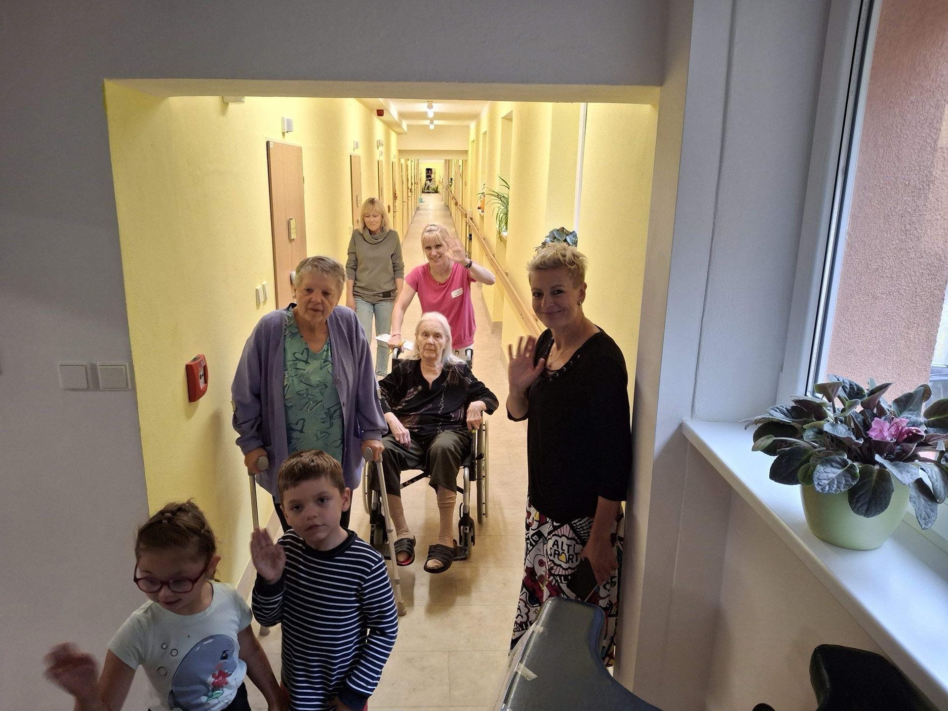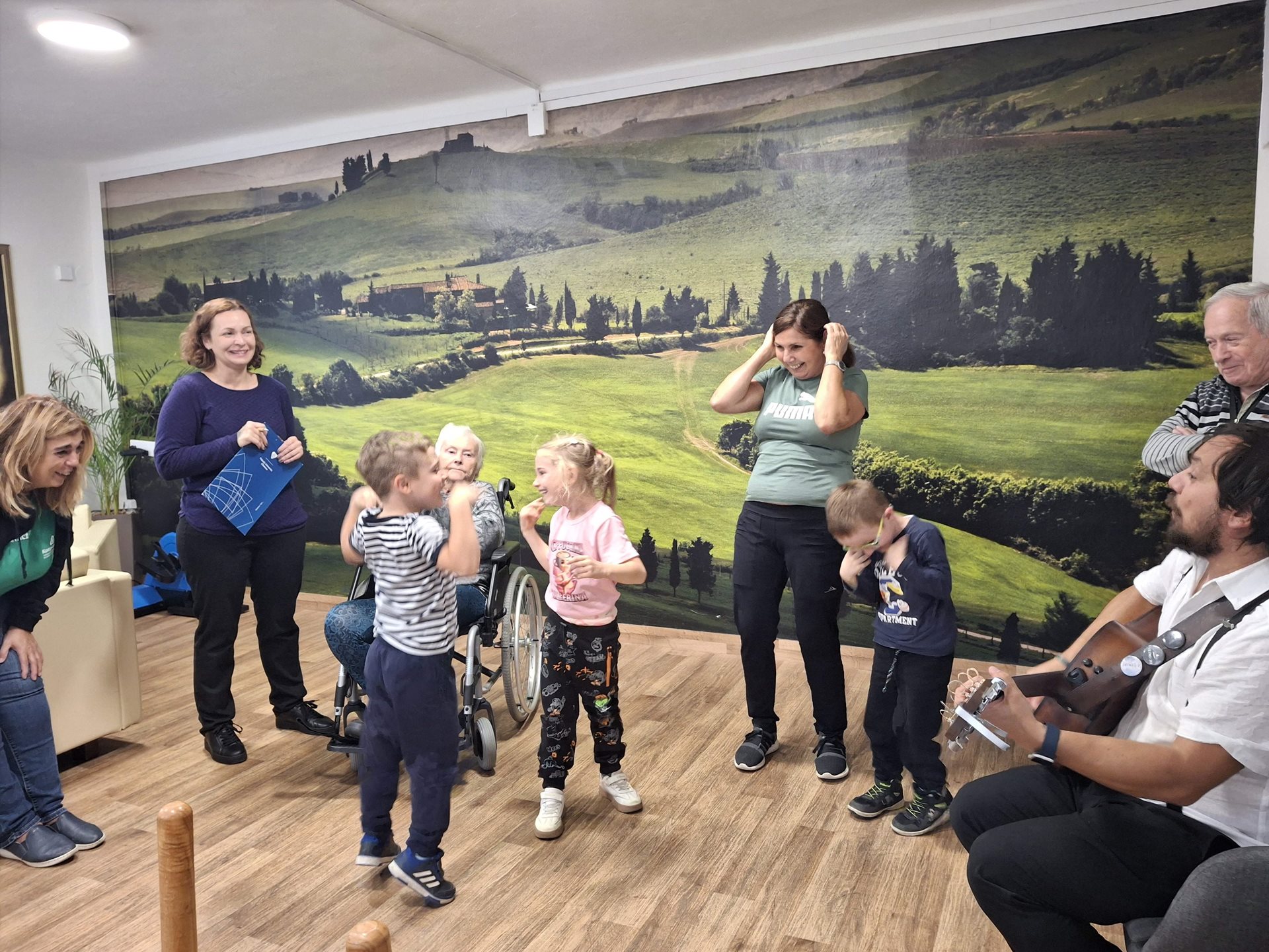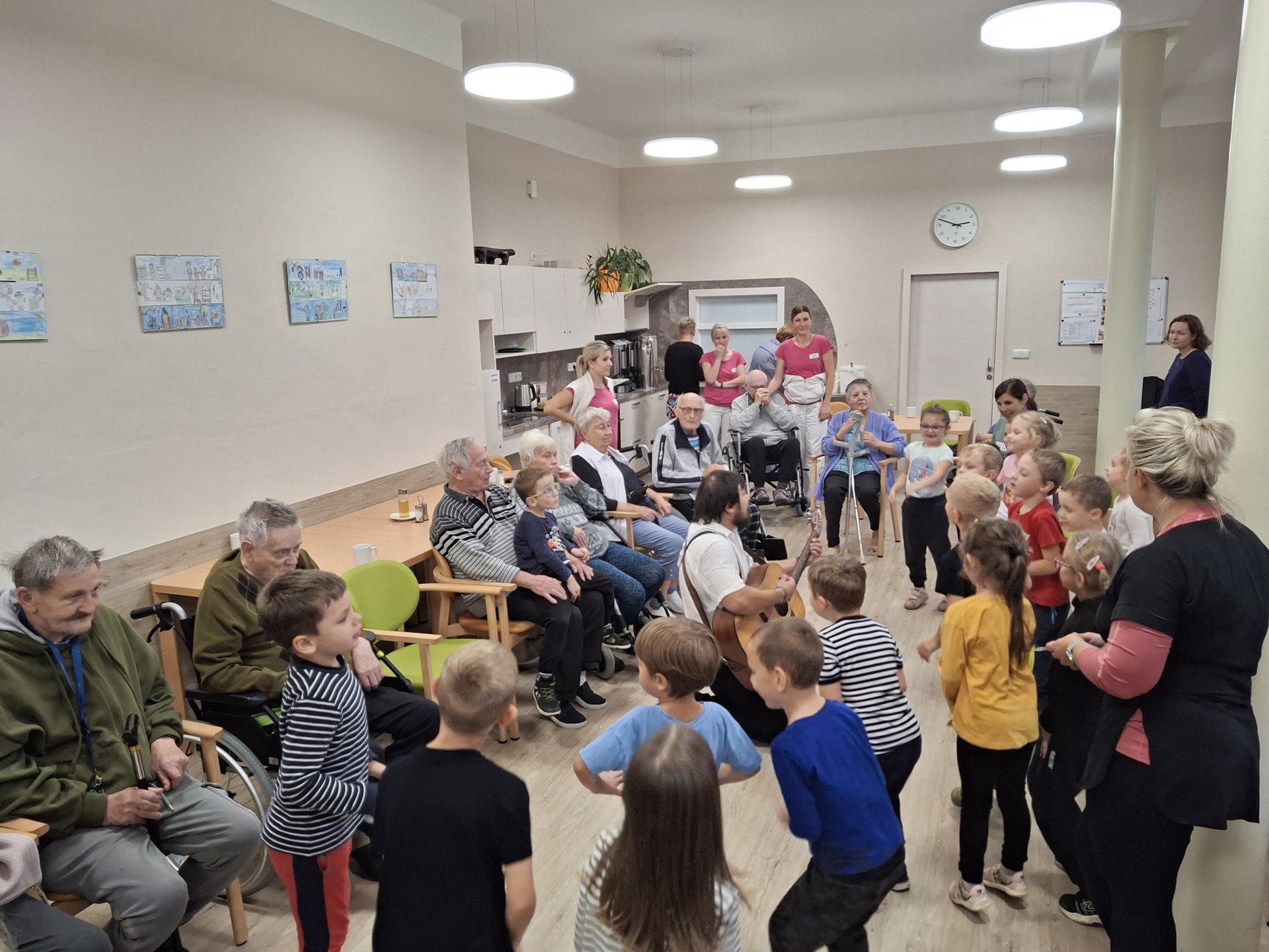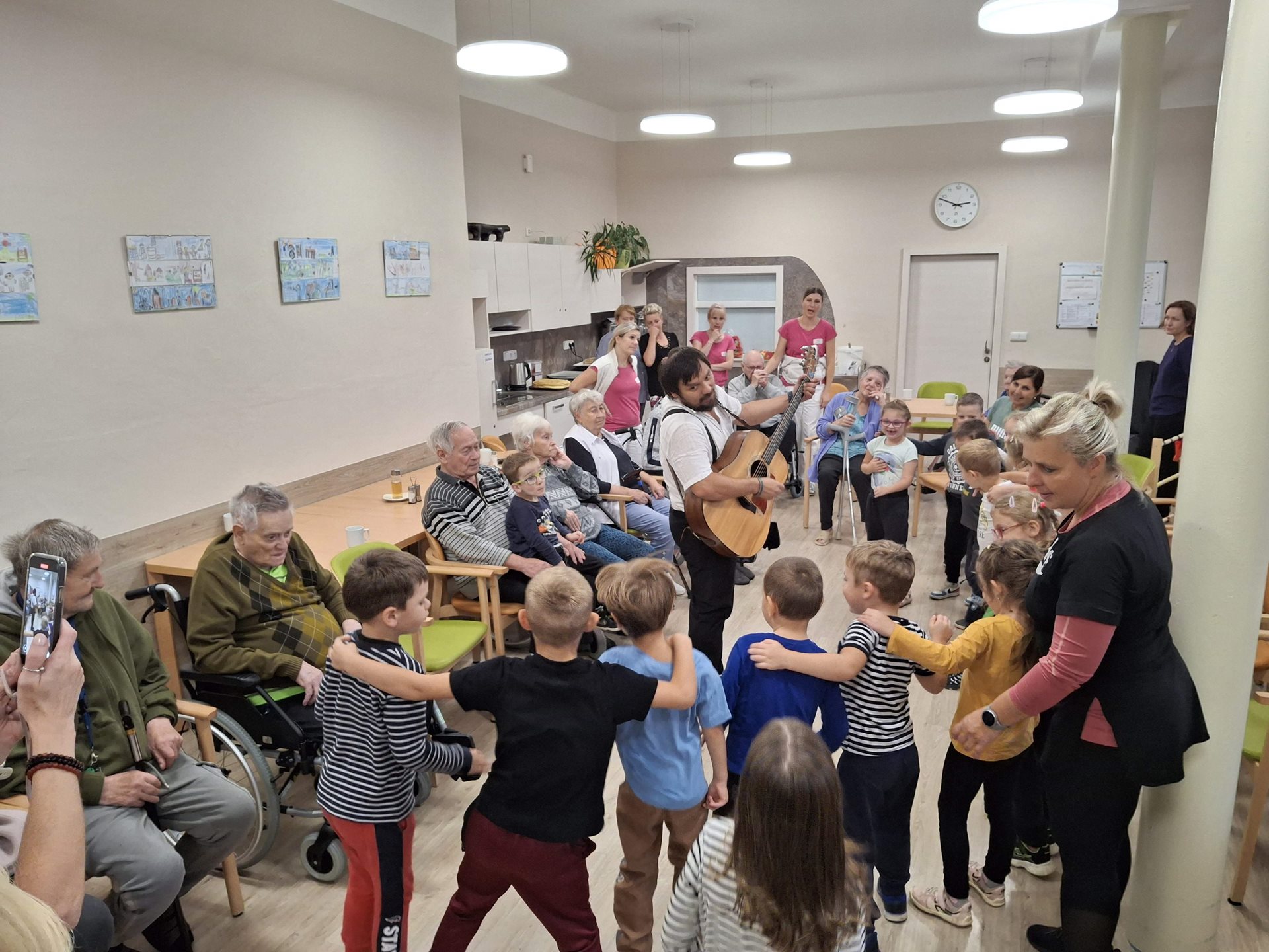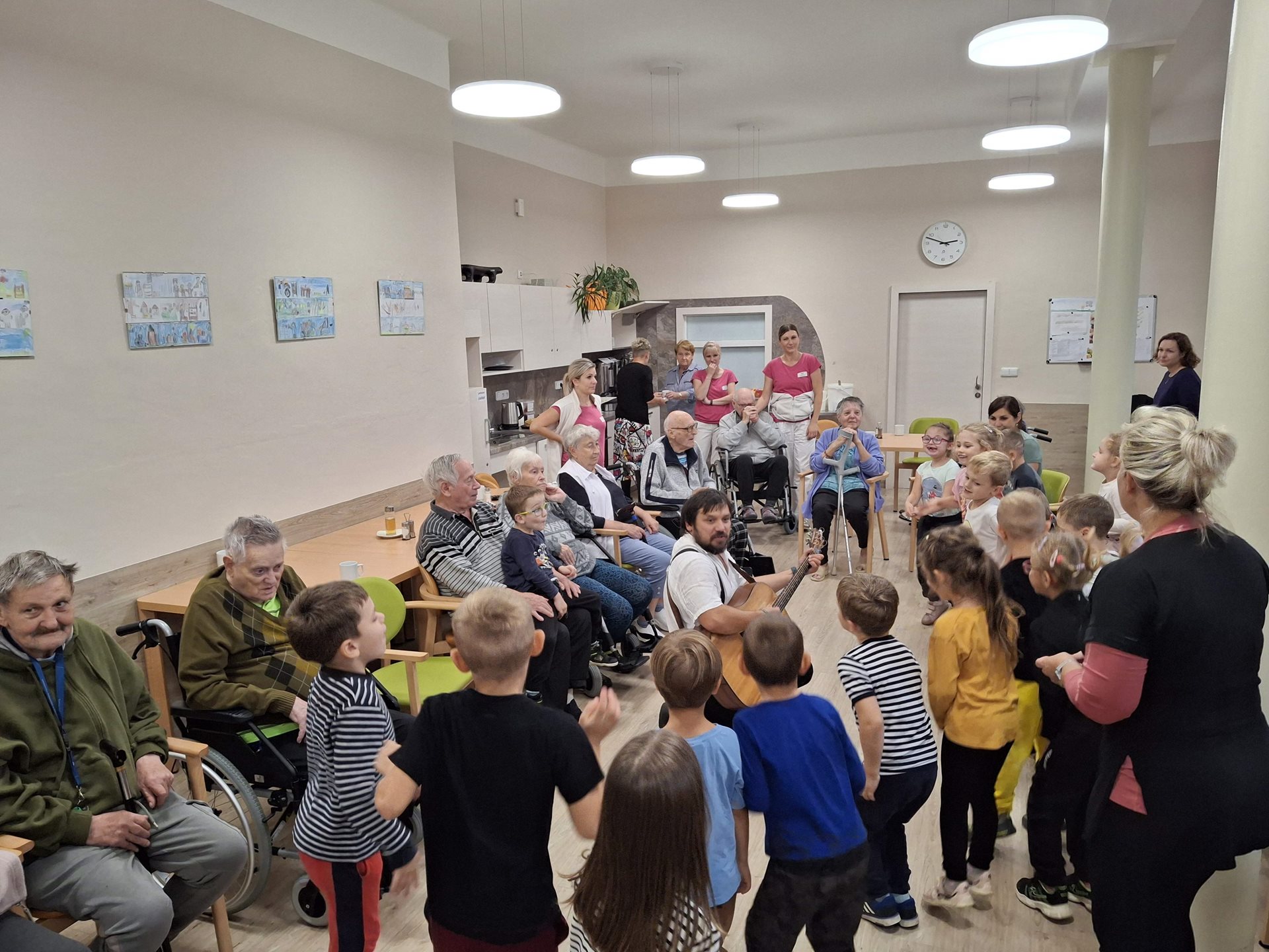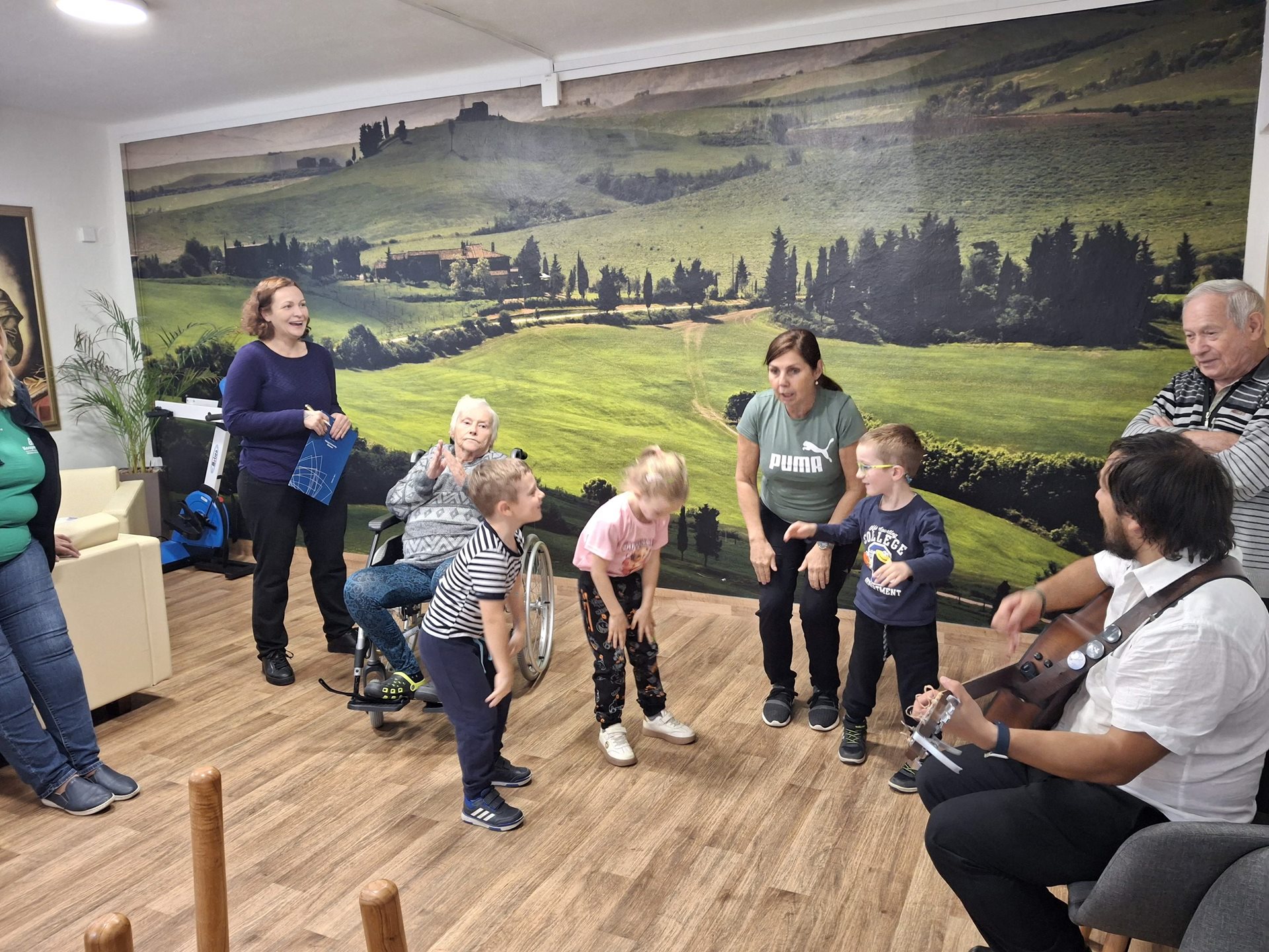 Ve středu 24. září jsme již podruhé v tomto roce uspořádali mezigenerační sportovní hry, které nesly podtitul „Když senioři a děti táhnou za jeden provaz.“ Počasí nám od samého rána příliš nepřálo – pršelo, foukal silný vítr a sluníčko se ani neukázalo. Déšť sice později ustoupil, ale vítr přetrvával, a tak jsme se rozhodli celý program operativně přesunout do vnitřních prostor. A světe div se – všechna stanoviště se vešla! Byl to den plný pohybu, her, smíchu, radosti, a především mezigeneračního porozumění. Naši milí uživatelé se opět společně s dětmi zapojili do pestrých sportovních disciplín. Připravili jsme celkem pět stanovišť: