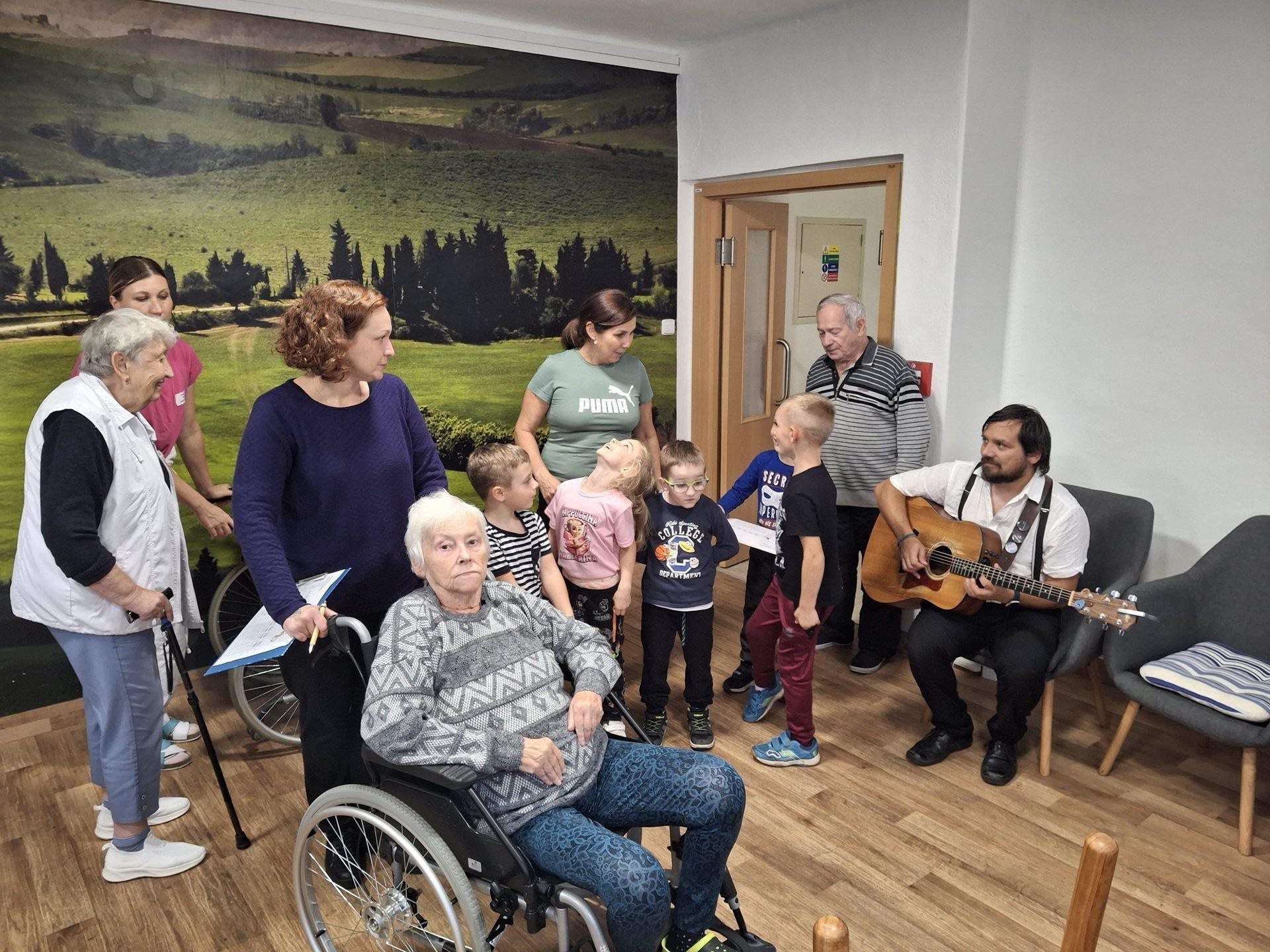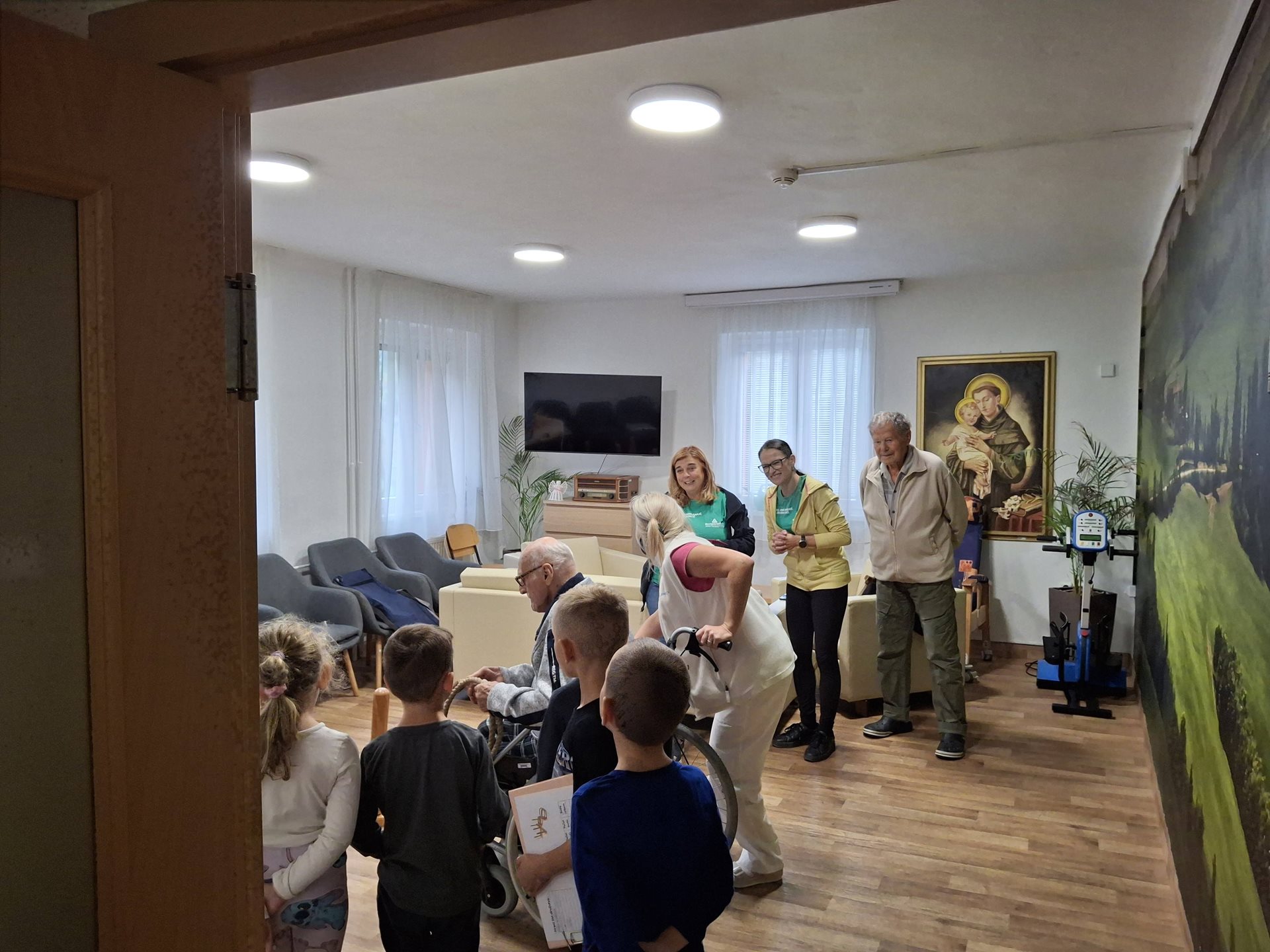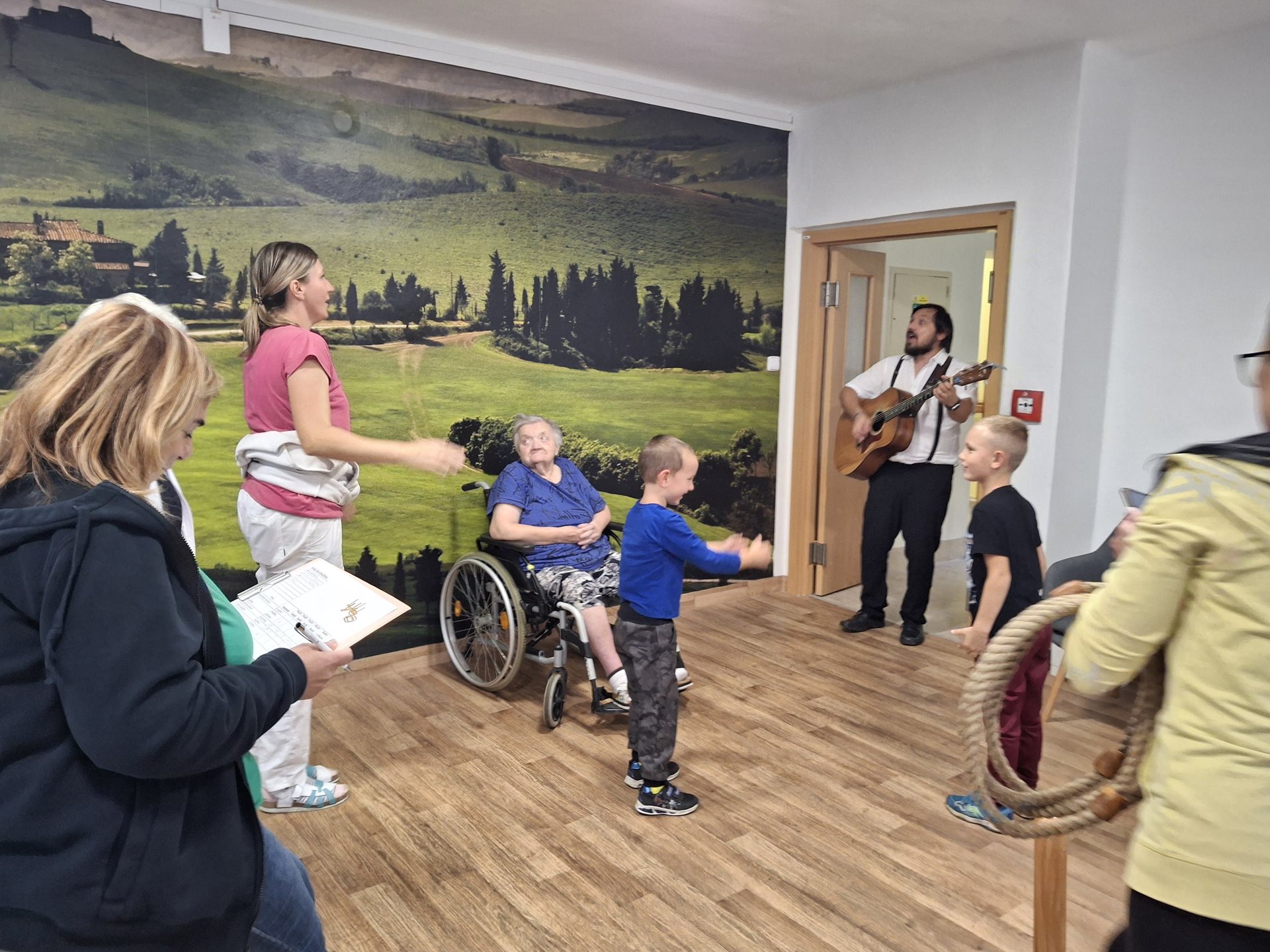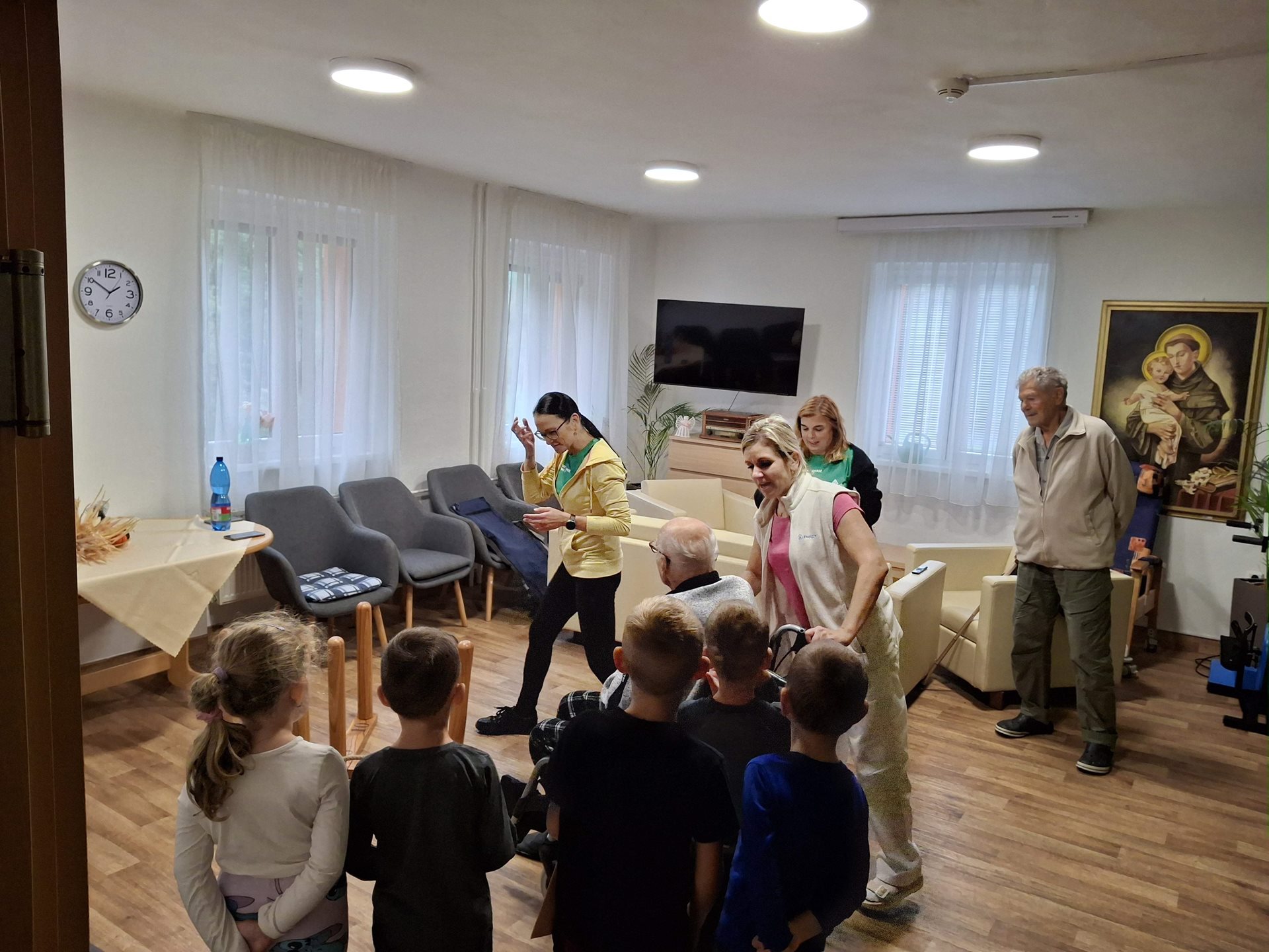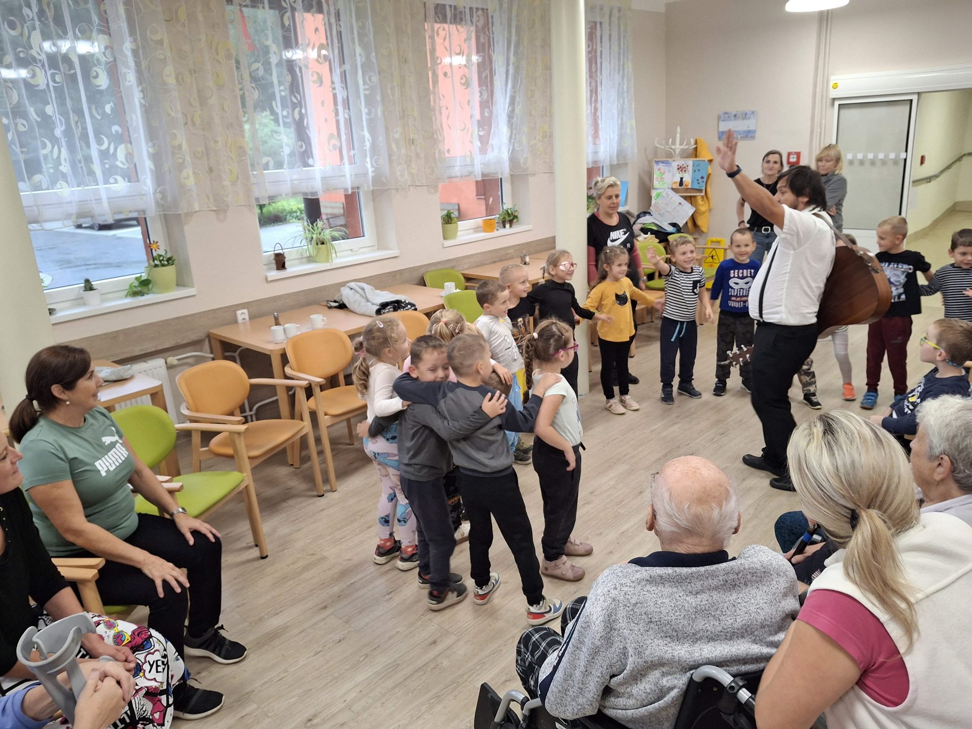 Ve středu 24. září jsme již podruhé v tomto roce uspořádali mezigenerační sportovní hry, které nesly podtitul „Když senioři a děti táhnou za jeden provaz.“ Počasí nám od samého rána příliš nepřálo – pršelo, foukal silný vítr a sluníčko se ani neukázalo. Déšť sice později ustoupil, ale vítr přetrvával, a tak jsme se rozhodli celý program operativně přesunout do vnitřních prostor. A světe div se – všechna stanoviště se vešla! Byl to den plný pohybu, her, smíchu, radosti, a především mezigeneračního porozumění. Naši milí uživatelé se opět společně s dětmi zapojili do pestrých sportovních disciplín. Připravili jsme celkem pět stanovišť: