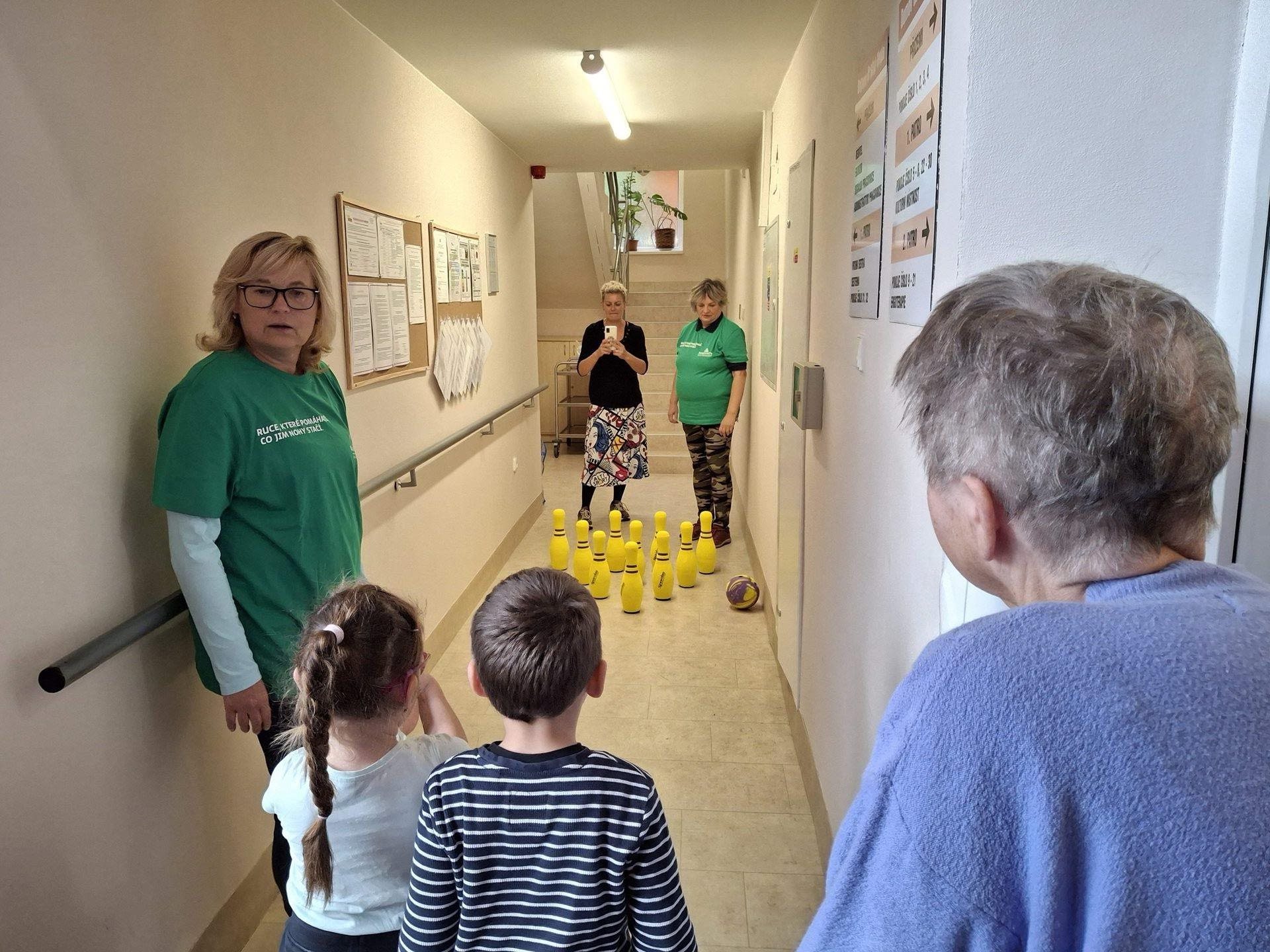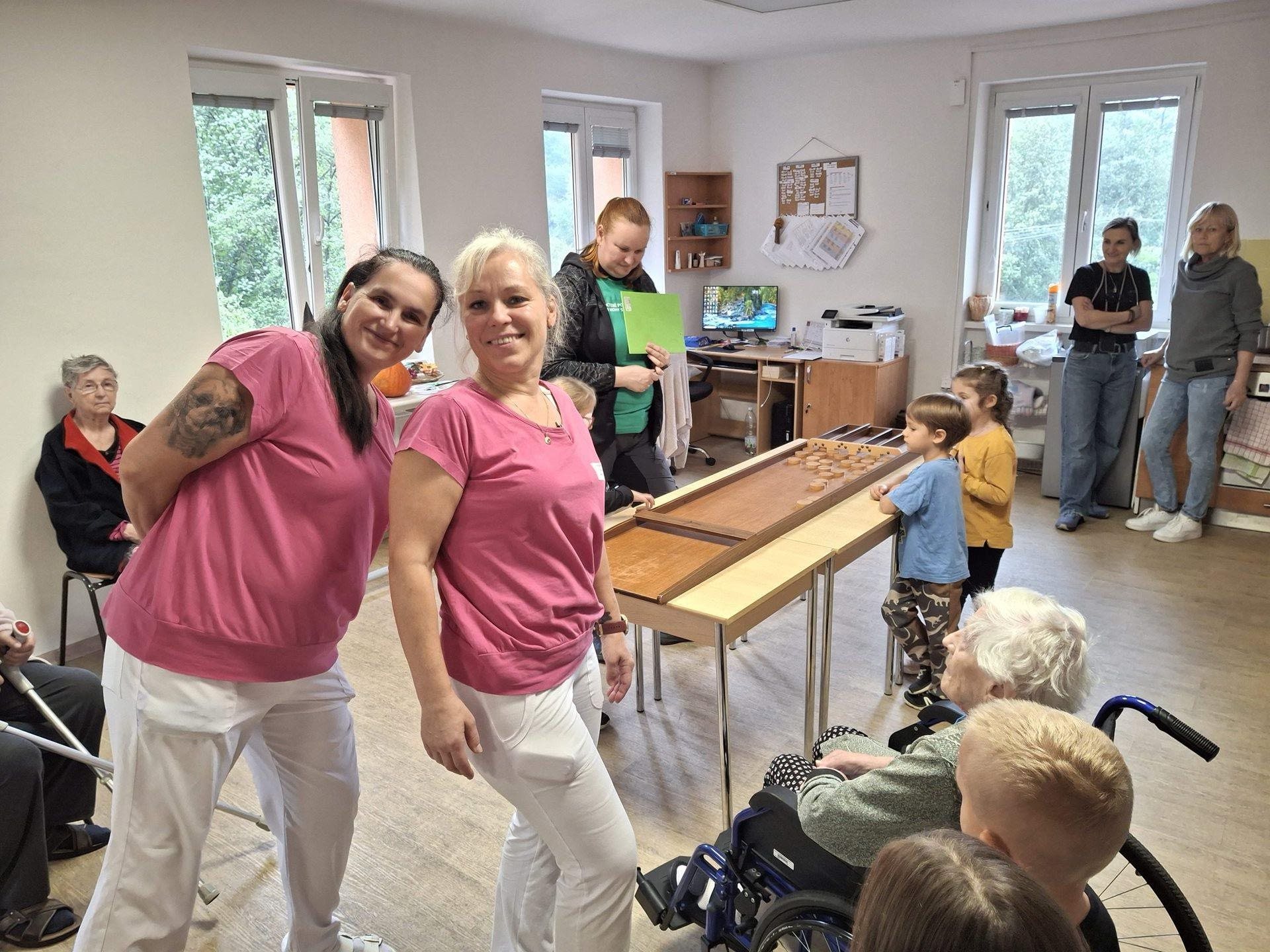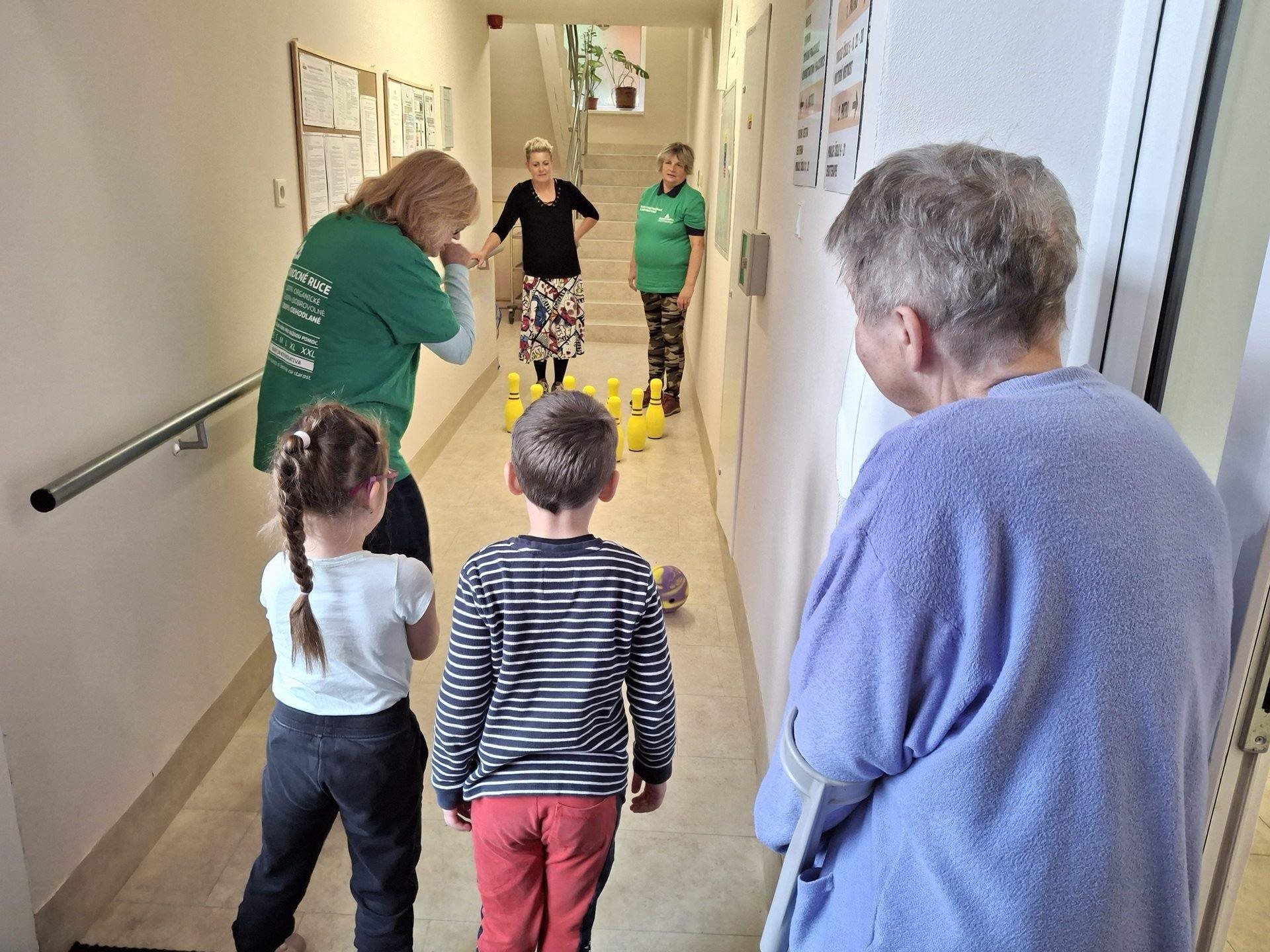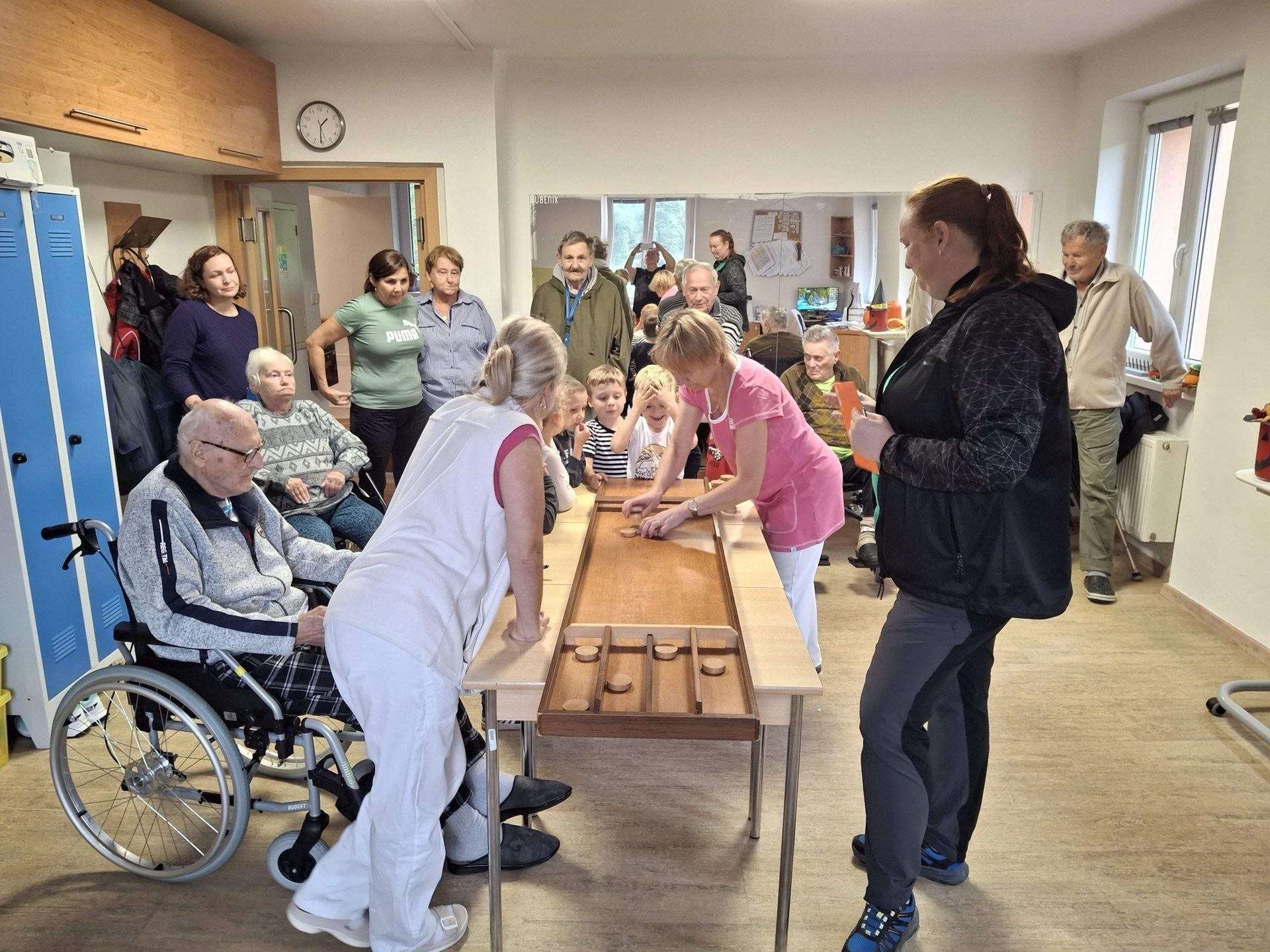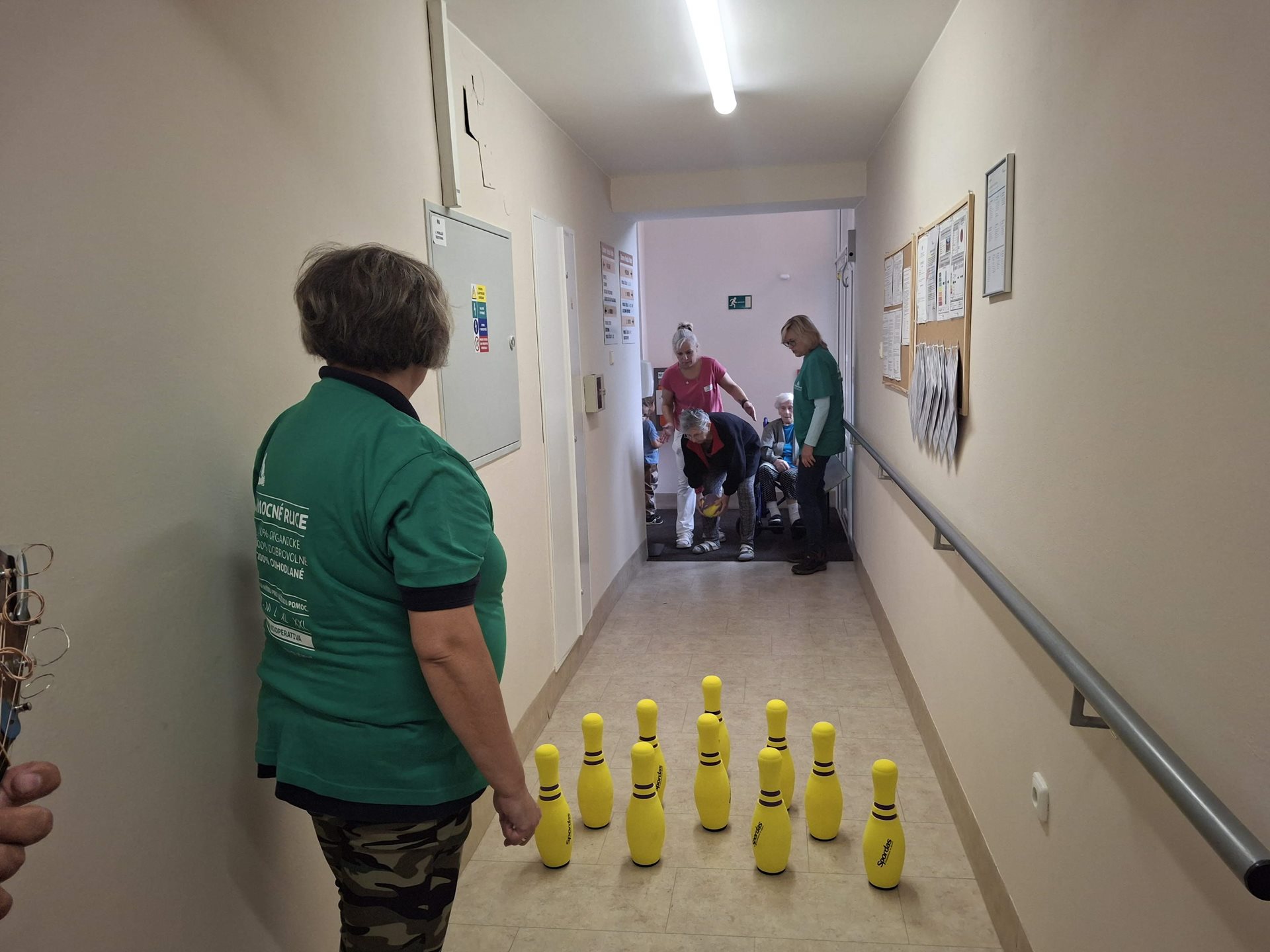 Do sportovního klání se zapojilo sedm smíšených týmů, z nichž každý měl zastoupení z obou generací. O hladký a férový průběh soutěží se postaraly zaměstnankyně pojišťovny Kooperativa, které se na jeden den staly našimi rozhodčími. Tuto akci pojaly jako svůj charitativní dobrovolnický den, za což jim patří velké poděkování. Velkou inspirací bylo sledovat, jak se členové týmů navzájem podporovali a spolupracovali jako jeden celek. Program obohatil také doprovodný muzikant, který se tu a tam objevil u kuželek, jindy zavítal za uživateli na pokoj, a než jsme se nadáli, byl už na jiném stanovišti. Jeho hudební „dopink“ byl příjemným zpestřením a často dodával týmům energii a chuť do soutěžení. Po skončení sportovní části jsme si společně poseděli v jídelně u voňavých palačinek, a zatímco jsme si pochutnávali, probíhalo sčítání bodů a vyhlášení výsledků. I když jsme ocenili vítězný tým, skutečným vítězem byl každý, kdo se zúčastnil – ať už soutěžil, nebo fandil. Děkujeme všem, kteří se na této krásné akci podíleli, a už nyní se těšíme na další ročník mezigeneračního sportovního klání!