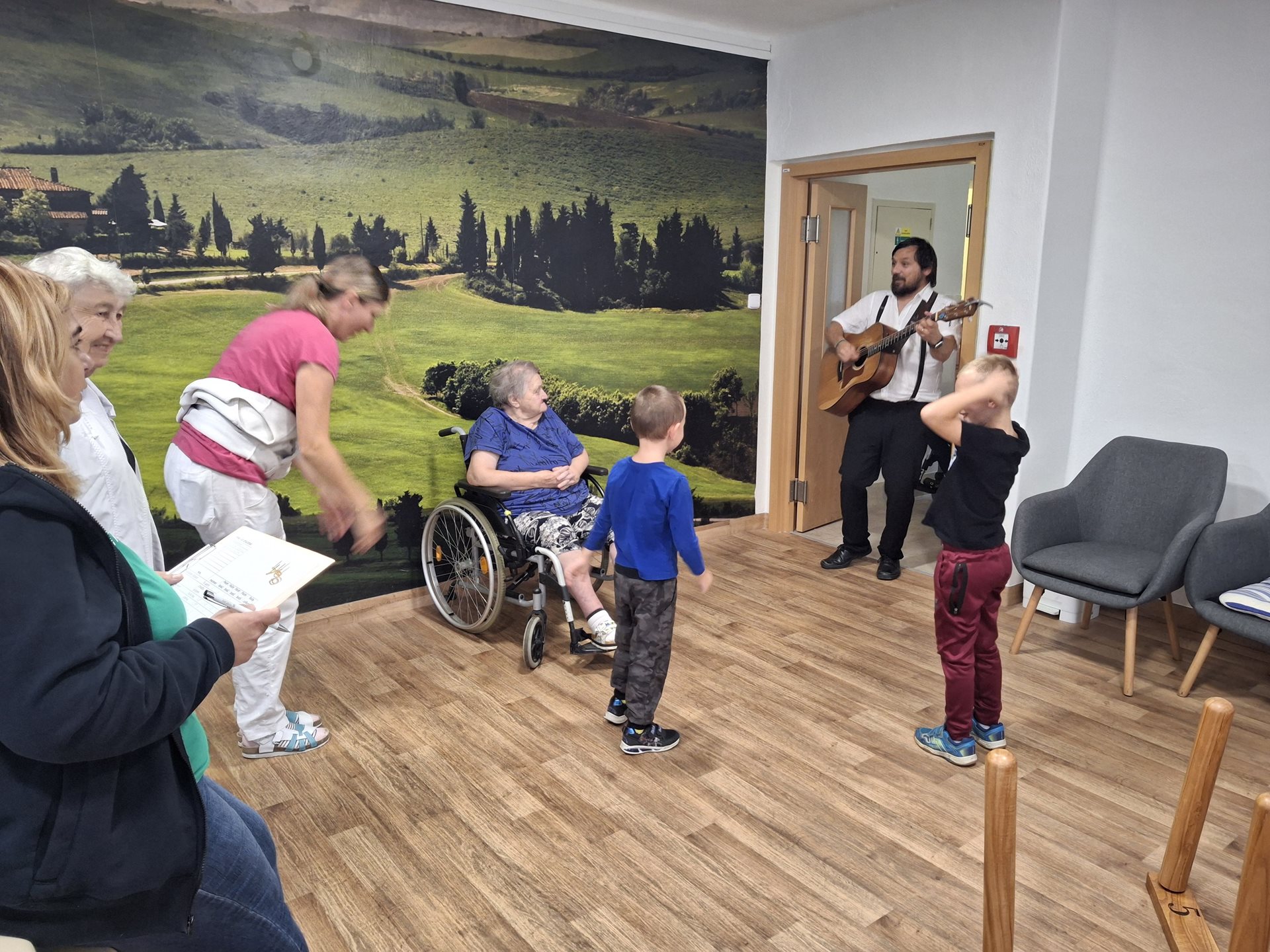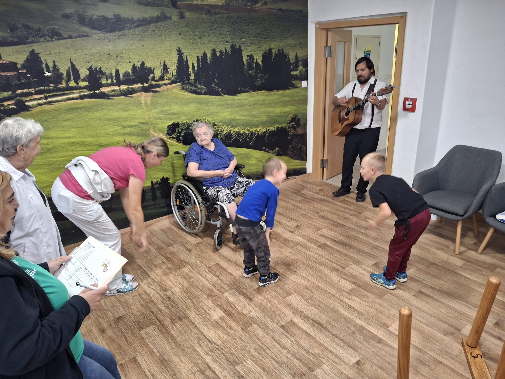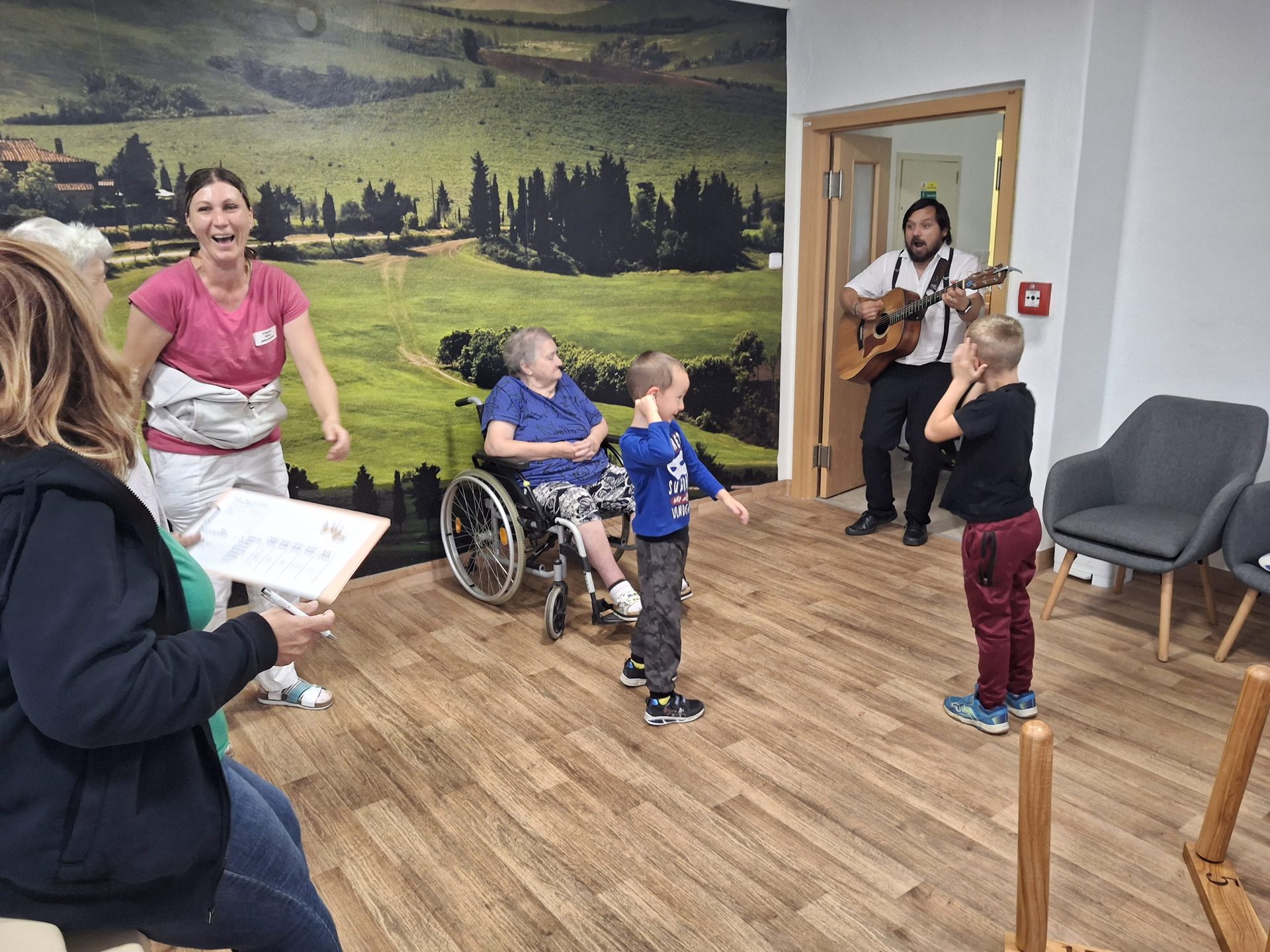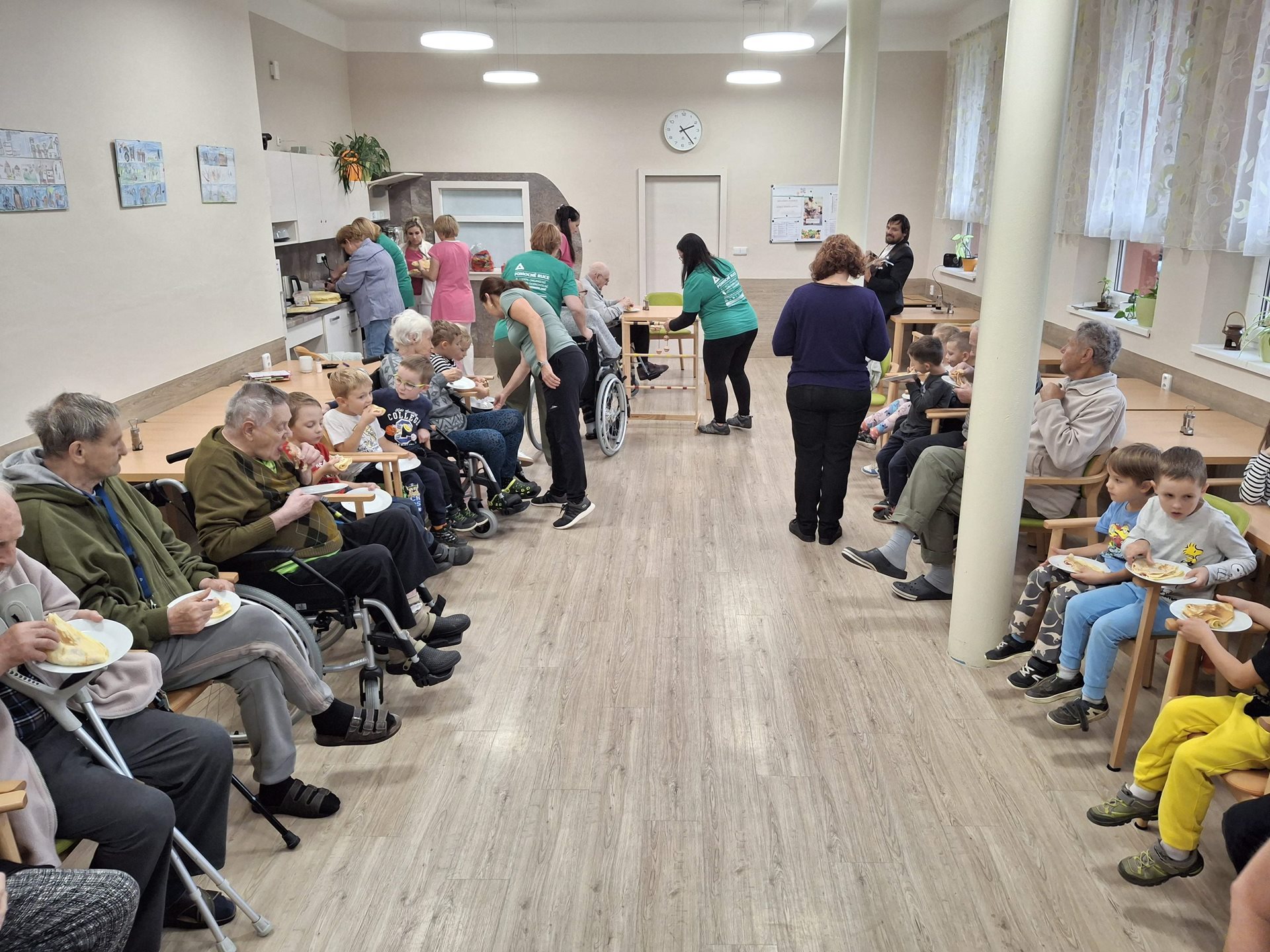 Do sportovního klání se zapojilo sedm smíšených týmů, z nichž každý měl zastoupení z obou generací. O hladký a férový průběh soutěží se postaraly zaměstnankyně pojišťovny Kooperativa, které se na jeden den staly našimi rozhodčími. Tuto akci pojaly jako svůj charitativní dobrovolnický den, za což jim patří velké poděkování. Velkou inspirací bylo sledovat, jak se členové týmů navzájem podporovali a spolupracovali jako jeden celek. Program obohatil také doprovodný muzikant, který se tu a tam objevil u kuželek, jindy zavítal za uživateli na pokoj, a než jsme se nadáli, byl už na jiném stanovišti. Jeho hudební „dopink“ byl příjemným zpestřením a často dodával týmům energii a chuť do soutěžení. Po skončení sportovní části jsme si společně poseděli v jídelně u voňavých palačinek, a zatímco jsme si pochutnávali, probíhalo sčítání bodů a vyhlášení výsledků. I když jsme ocenili vítězný tým, skutečným vítězem byl každý, kdo se zúčastnil – ať už soutěžil, nebo fandil. Děkujeme všem, kteří se na této krásné akci podíleli, a už nyní se těšíme na další ročník mezigeneračního sportovního klání!