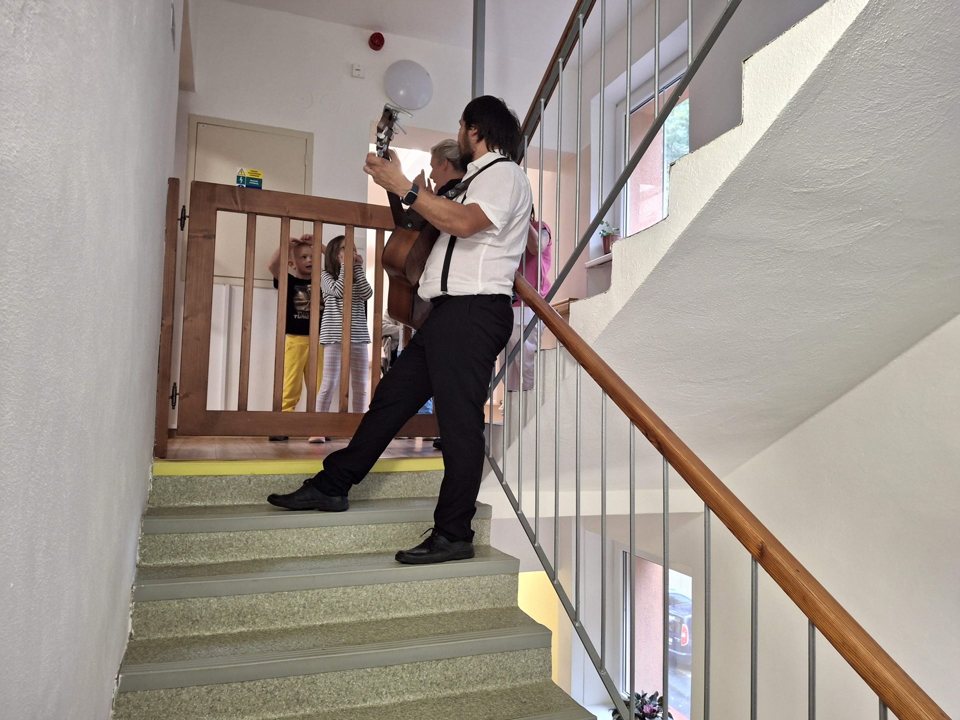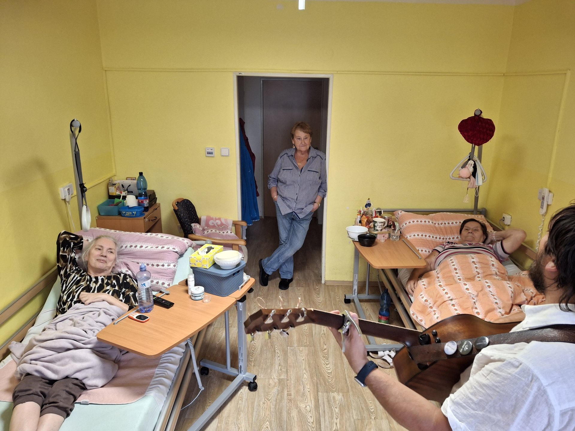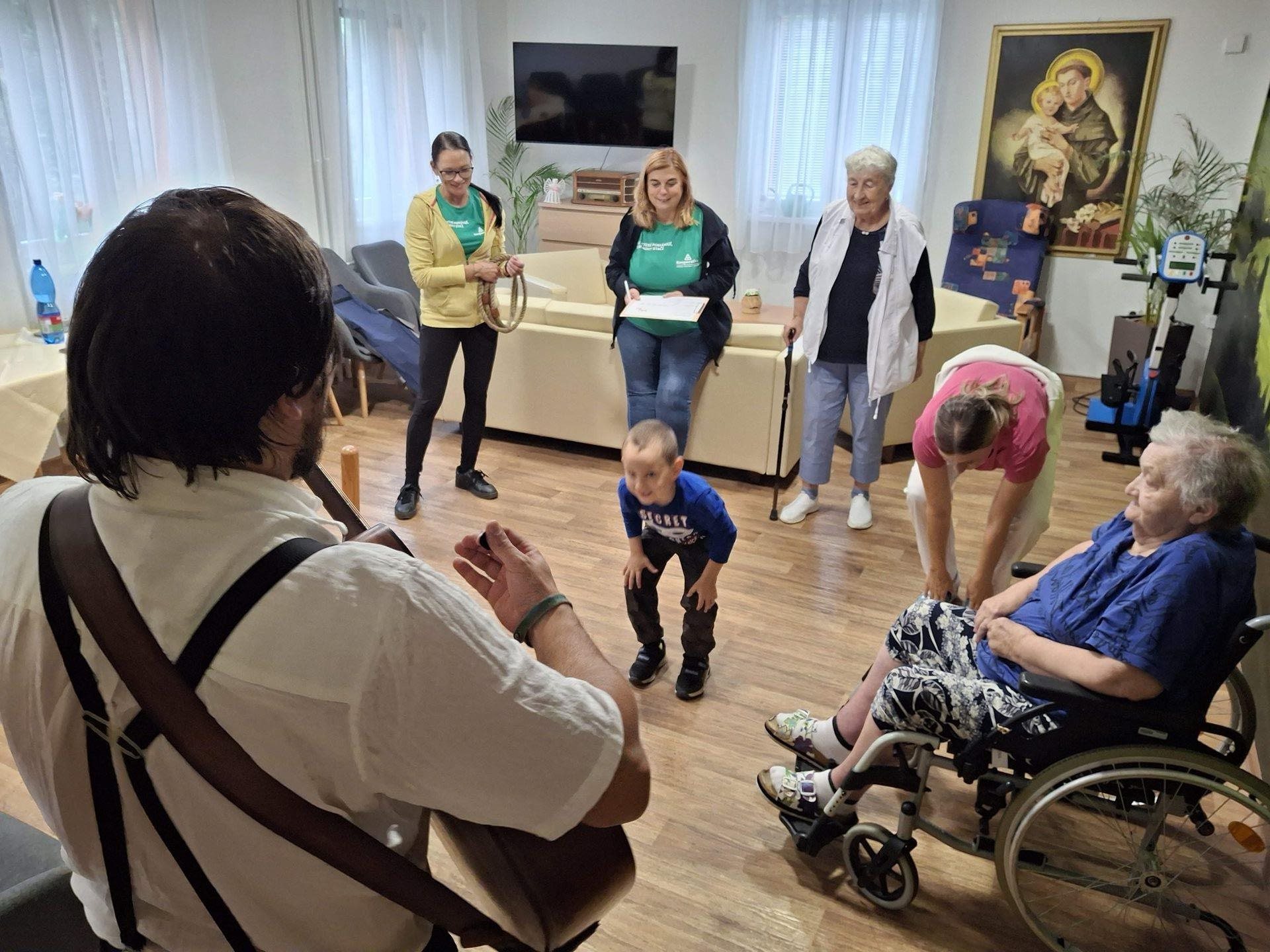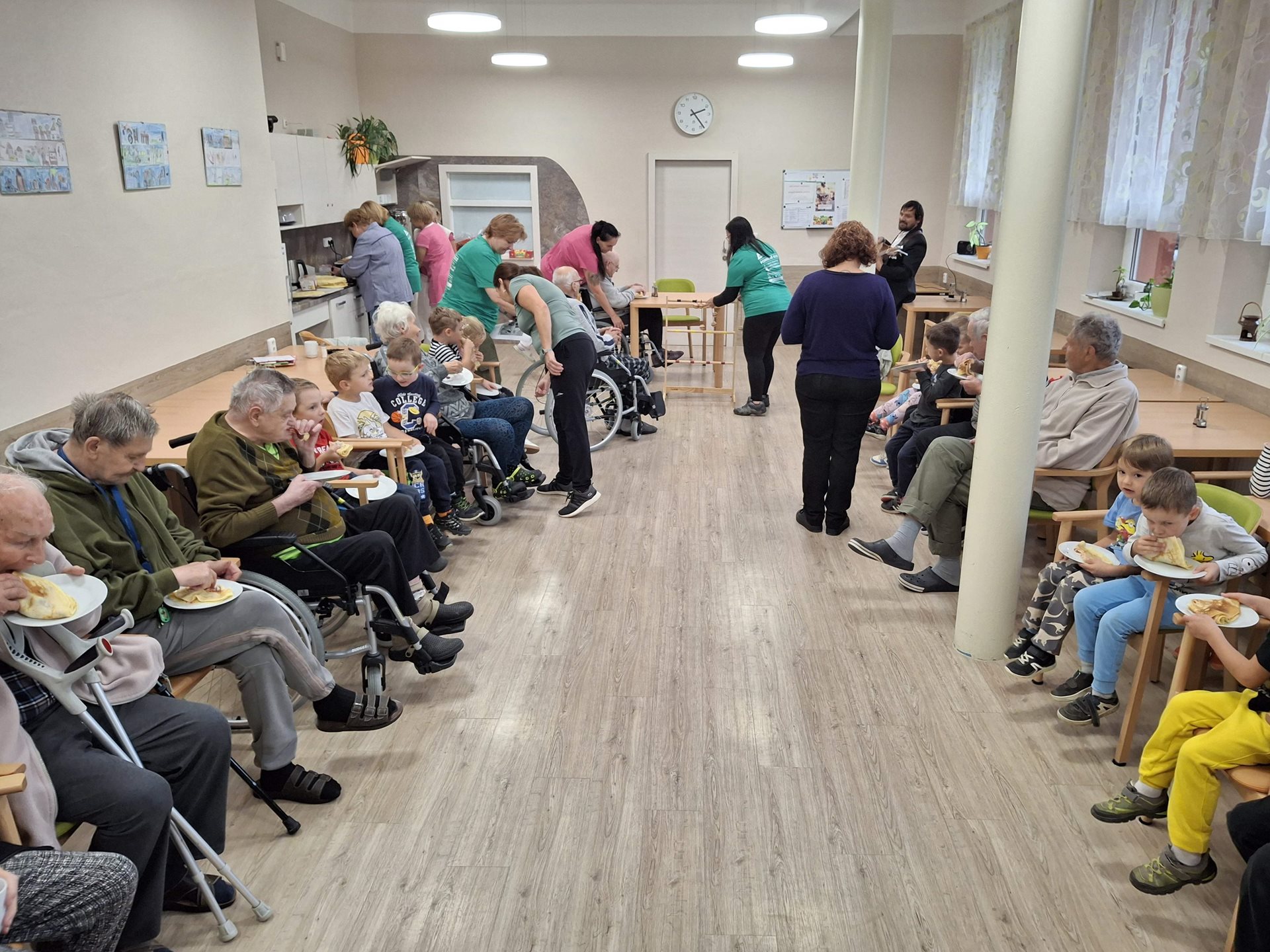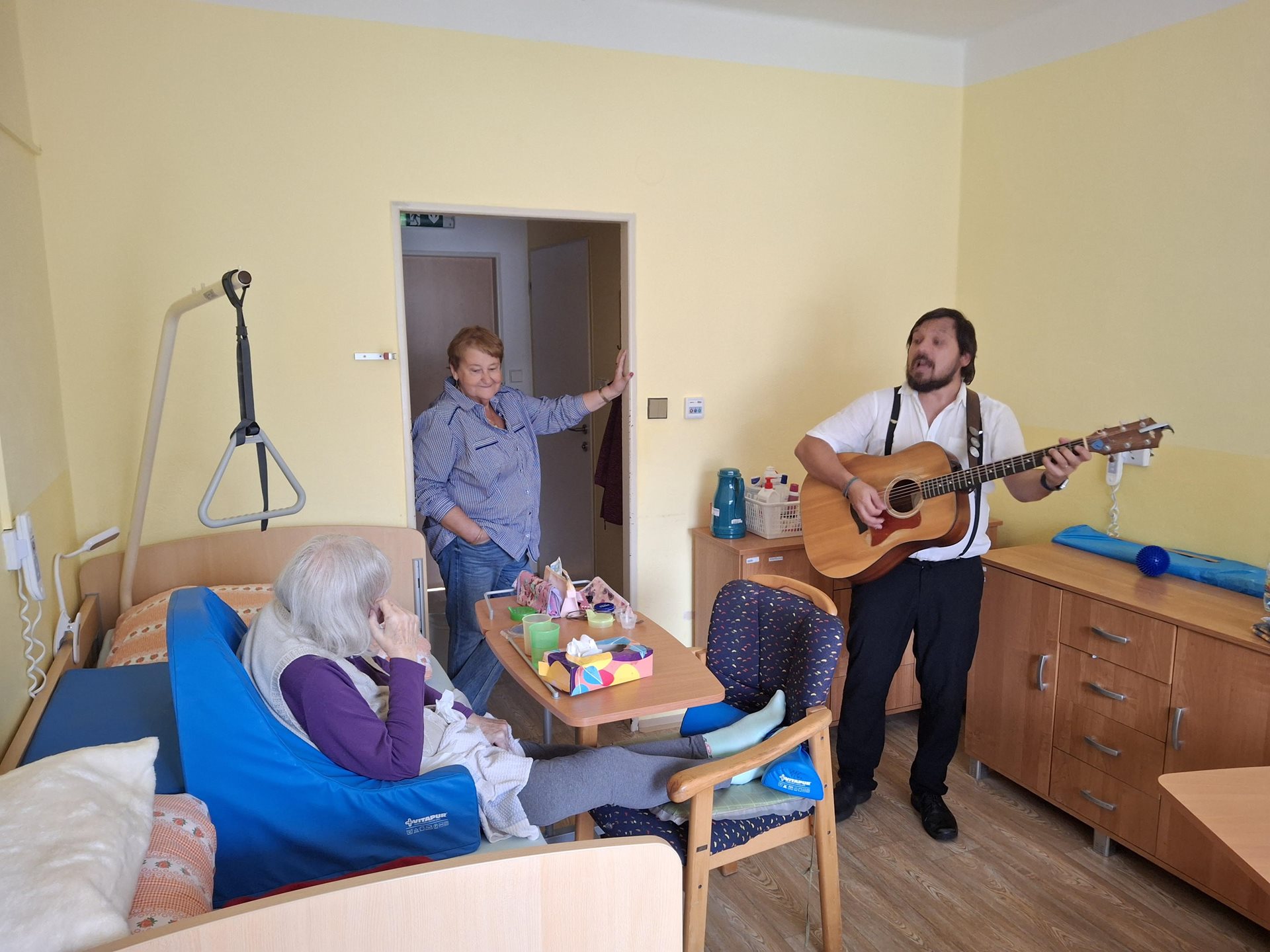 Do sportovního klání se zapojilo sedm smíšených týmů, z nichž každý měl zastoupení z obou generací. O hladký a férový průběh soutěží se postaraly zaměstnankyně pojišťovny Kooperativa, které se na jeden den staly našimi rozhodčími. Tuto akci pojaly jako svůj charitativní dobrovolnický den, za což jim patří velké poděkování. Velkou inspirací bylo sledovat, jak se členové týmů navzájem podporovali a spolupracovali jako jeden celek. Program obohatil také doprovodný muzikant, který se tu a tam objevil u kuželek, jindy zavítal za uživateli na pokoj, a než jsme se nadáli, byl už na jiném stanovišti. Jeho hudební „dopink“ byl příjemným zpestřením a často dodával týmům energii a chuť do soutěžení. Po skončení sportovní části jsme si společně poseděli v jídelně u voňavých palačinek, a zatímco jsme si pochutnávali, probíhalo sčítání bodů a vyhlášení výsledků. I když jsme ocenili vítězný tým, skutečným vítězem byl každý, kdo se zúčastnil – ať už soutěžil, nebo fandil. Děkujeme všem, kteří se na této krásné akci podíleli, a už nyní se těšíme na další ročník mezigeneračního sportovního klání!
