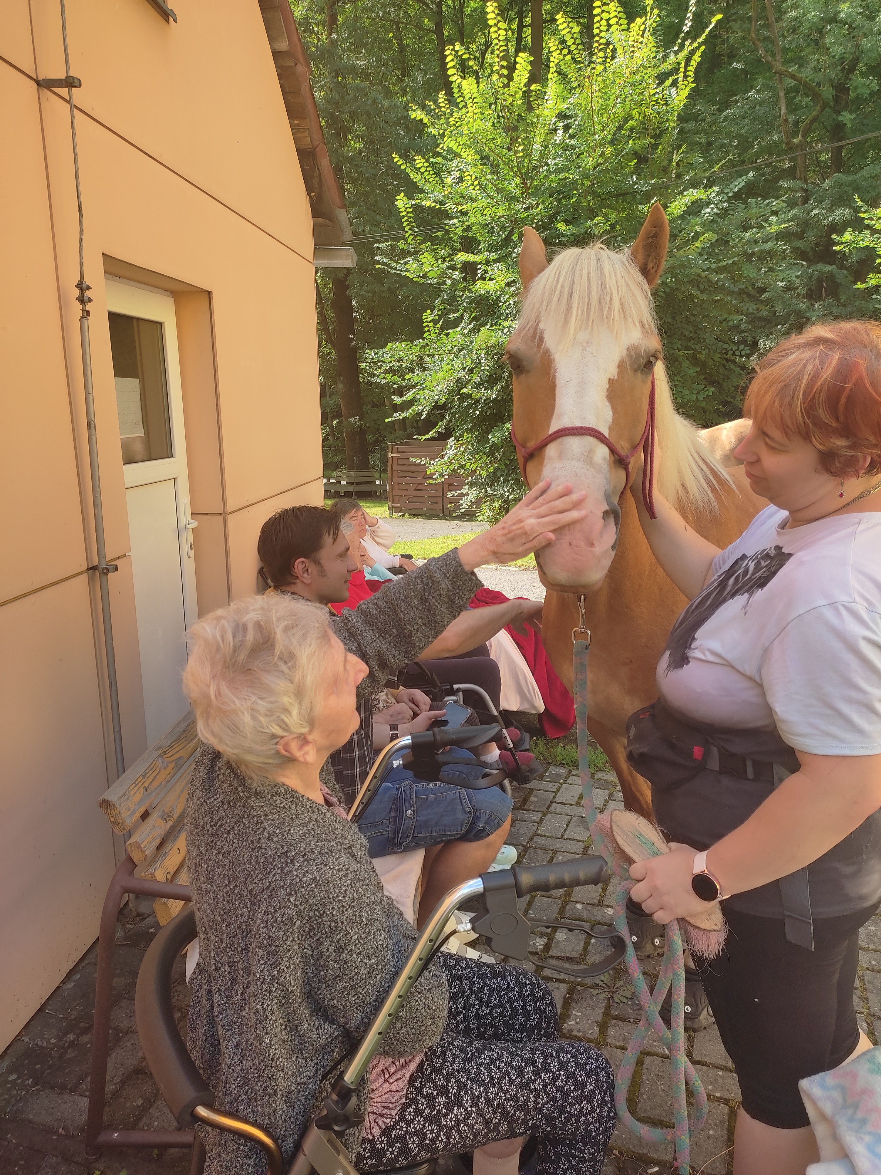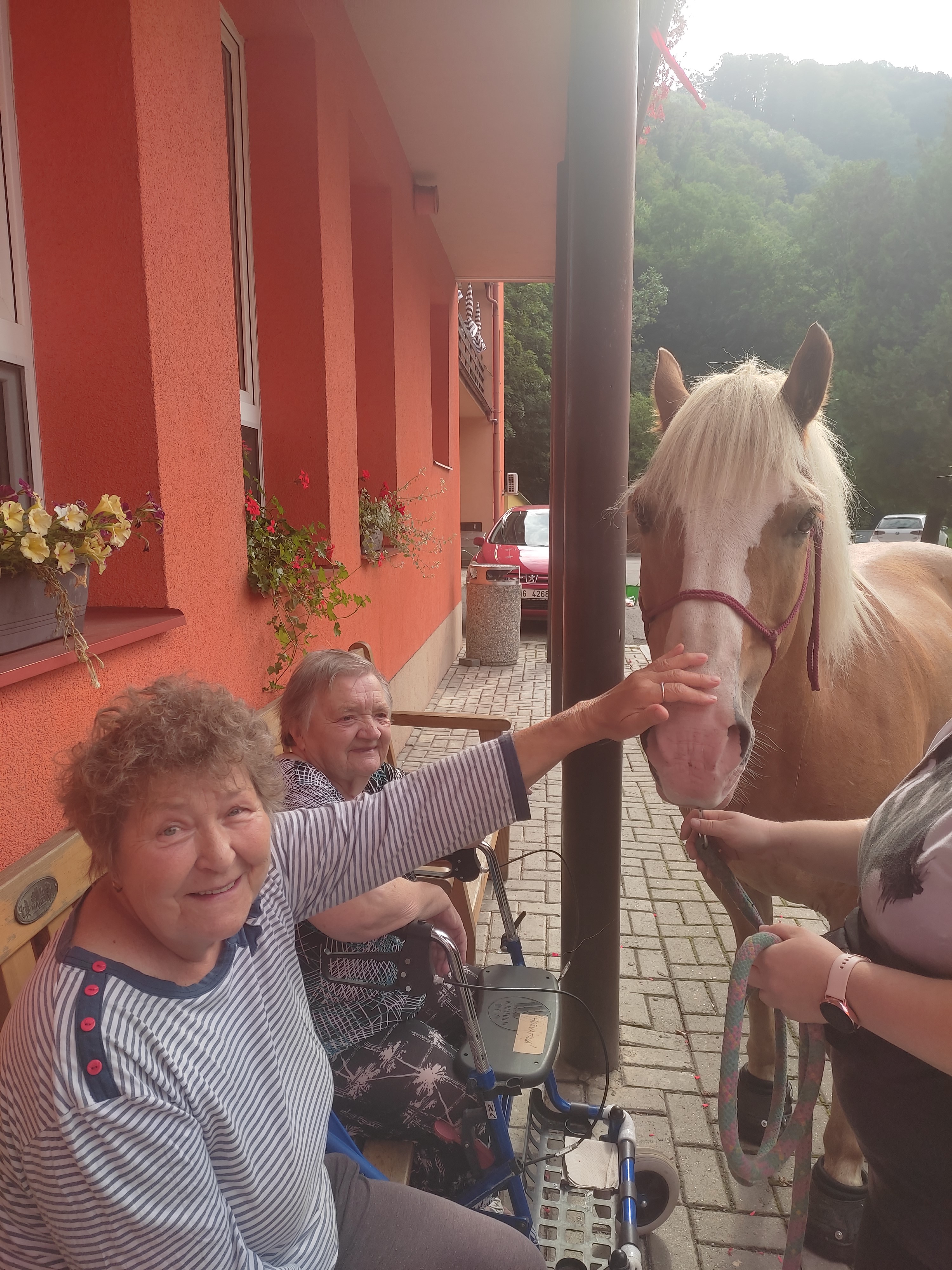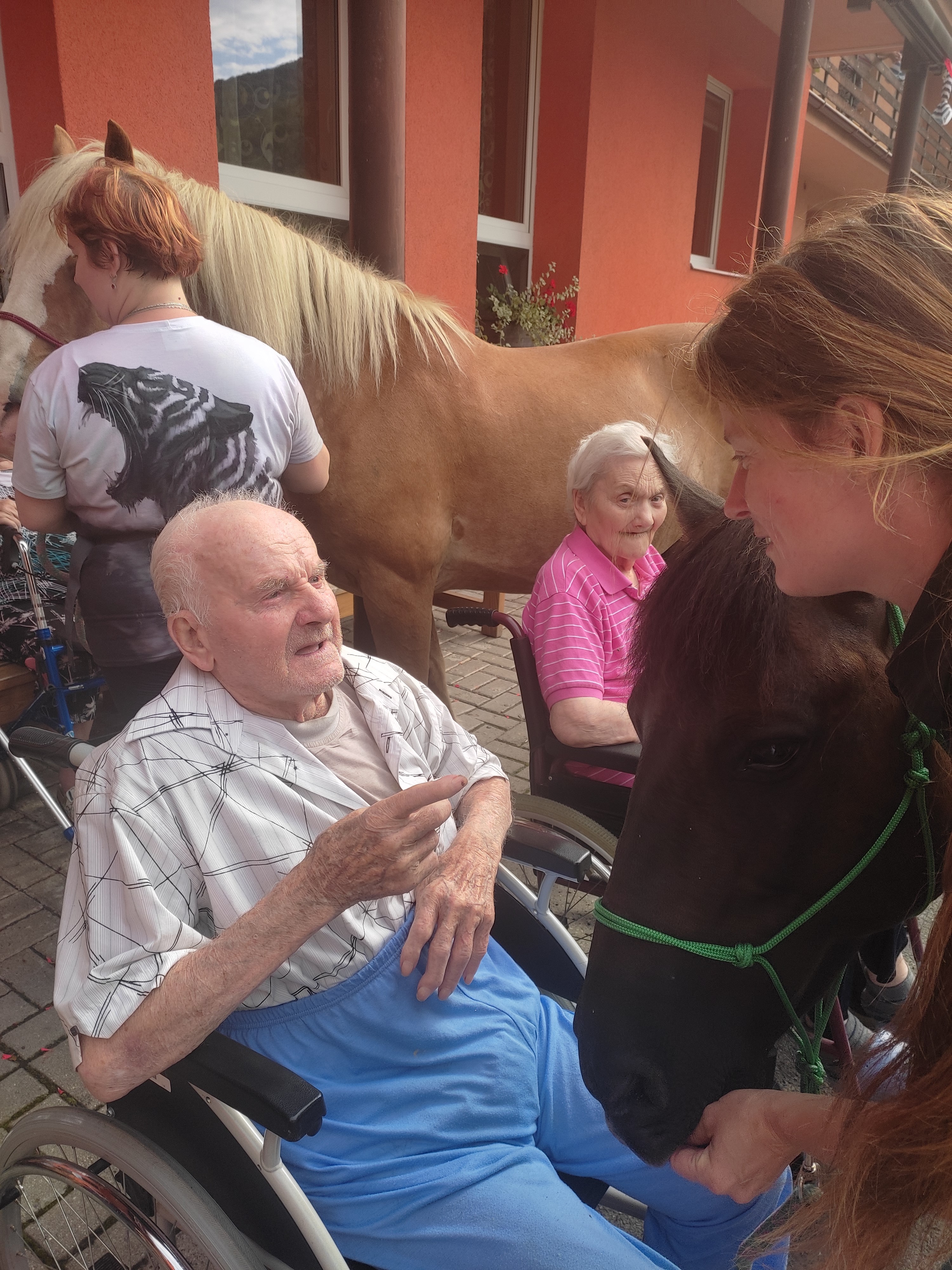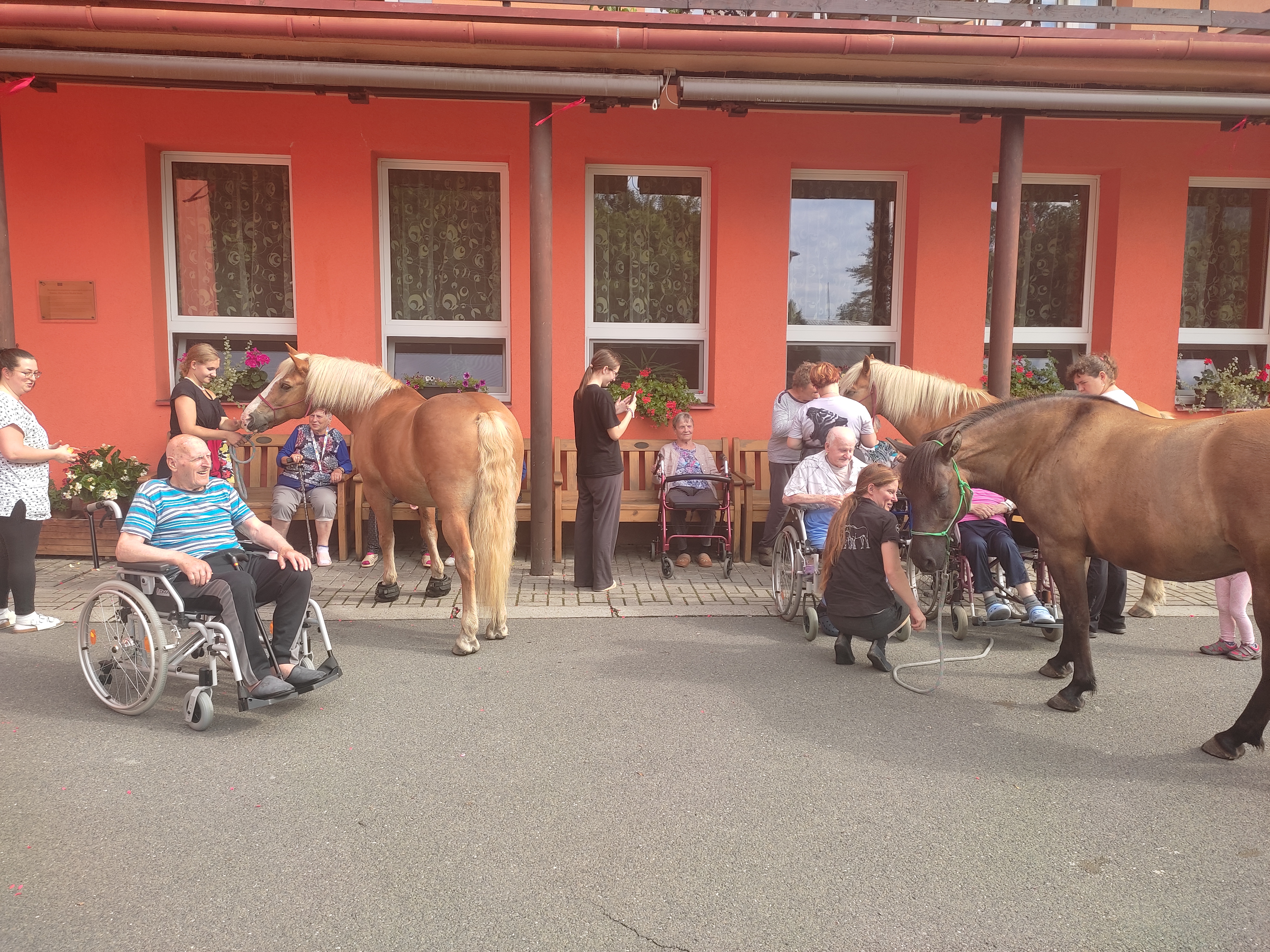 Plán se stal skutečností a my přivítali živé koně. Canisterapie se u nás odehrává pravidelně. Na to už jsme si zvykli. Hipoterapii jsme zažili poprvé. Nejprve bylo vzájemné oťukávání a navázání oboustranné důvěry. K tomu jsme využili naše venkovní prostory, které posloužily koníkům jako pastvina. Některé odvážné uživatelky se zapojily a koníky hřebelcovaly. Mysleli jsme i na další uživatele, pro které je opuštění lůžka velmi obtížné. Tak za těmi jsme šli přímo na pokoj. Bylo až neuvěřitelné slyšet po budově řehtání a dusot kopyt. Slovy se pocity nedají ani popsat. Tolik radosti. Moc děkujeme.
