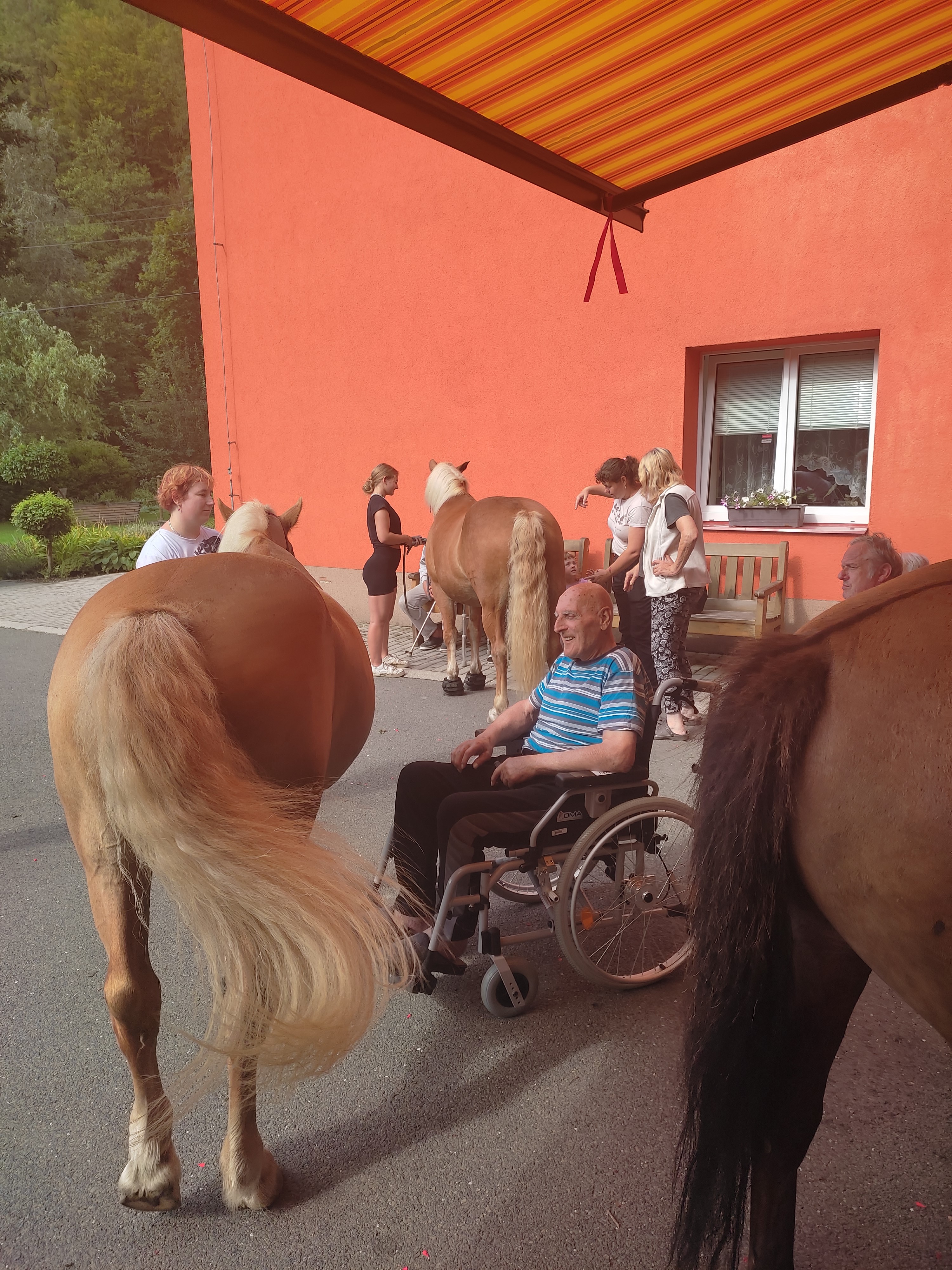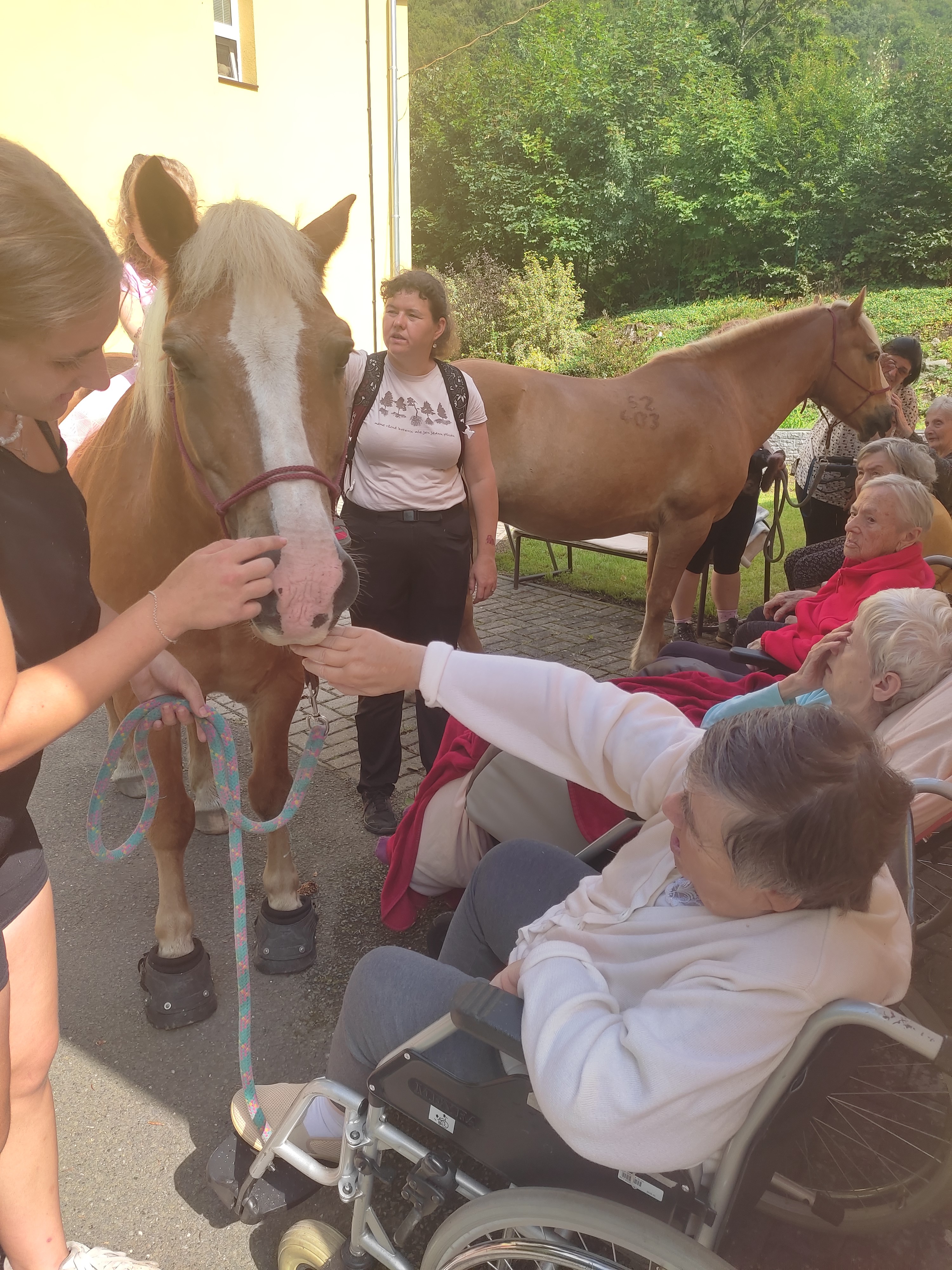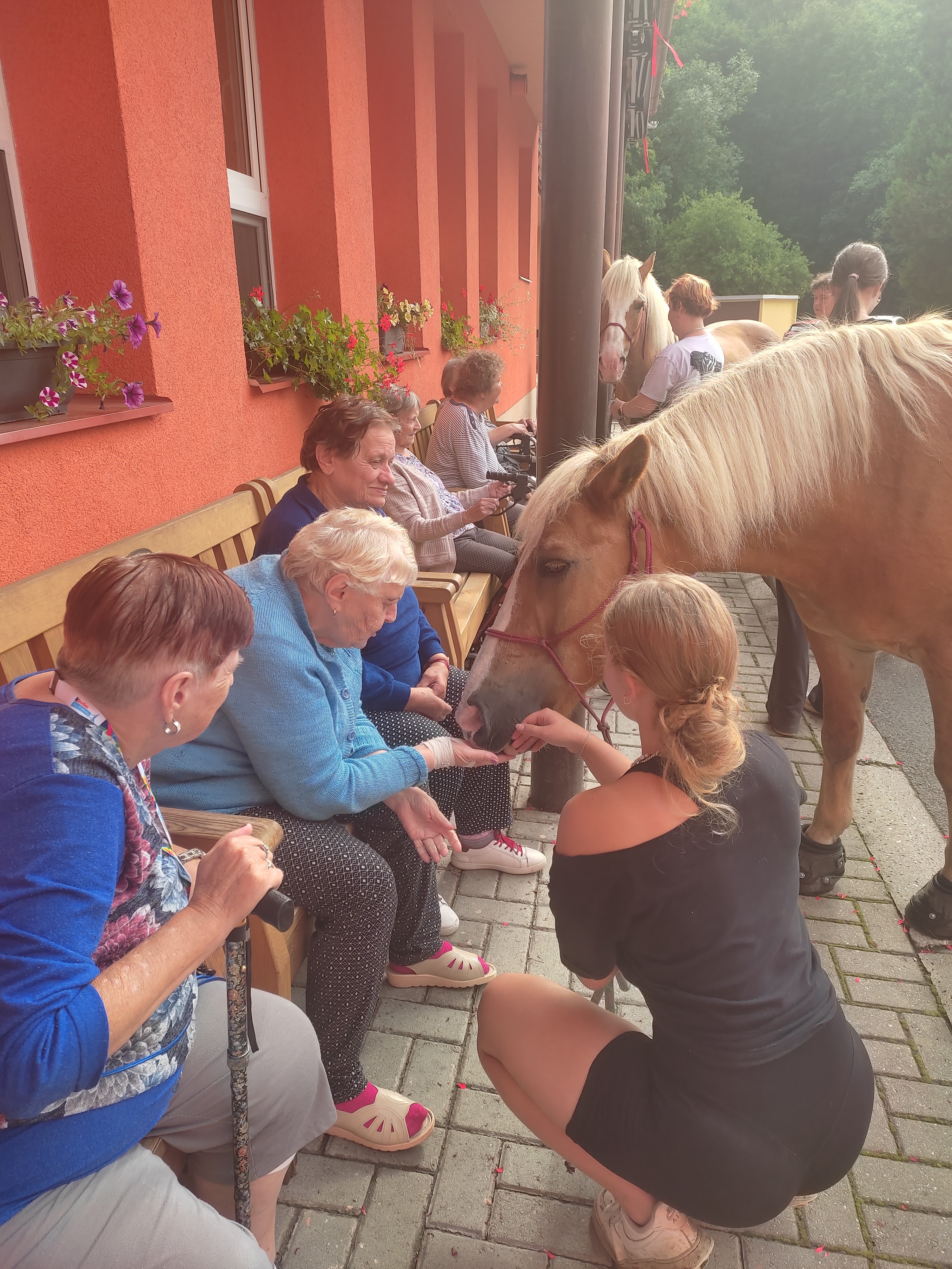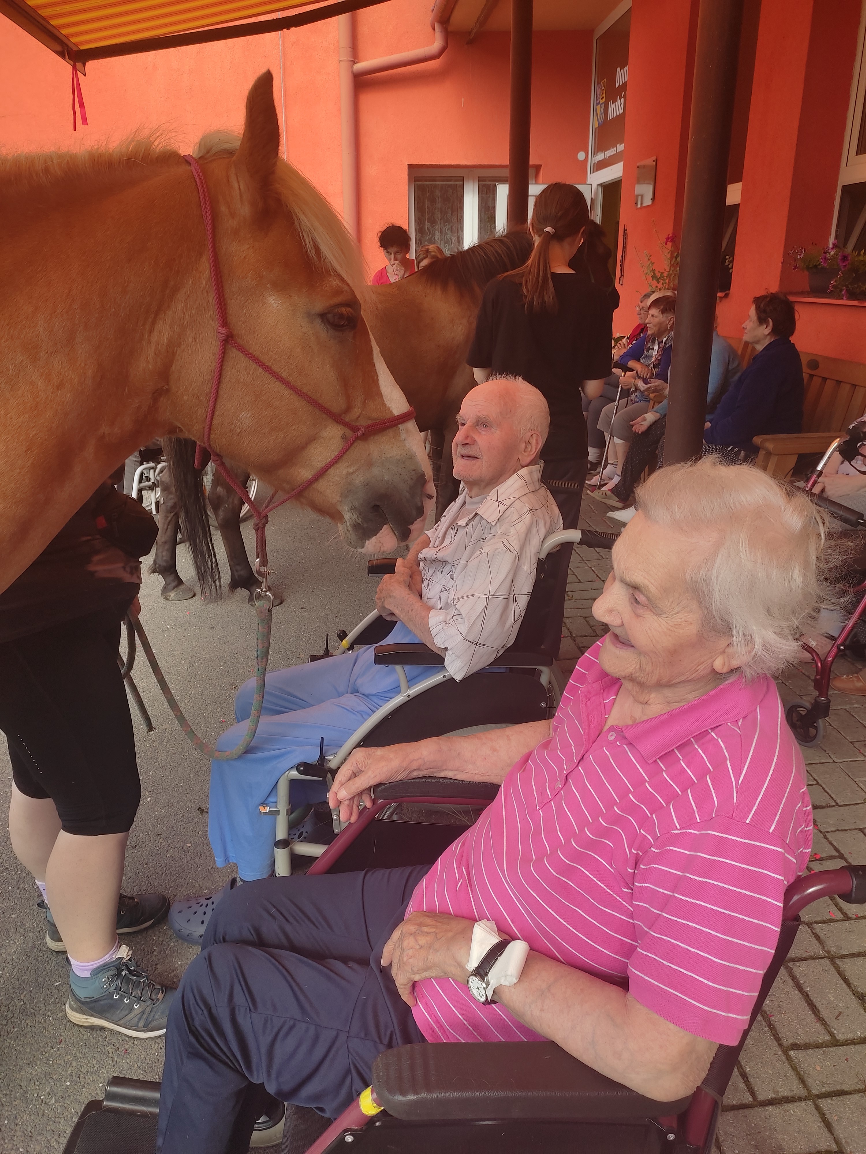 Plán se stal skutečností a my přivítali živé koně. Canisterapie se u nás odehrává pravidelně. Na to už jsme si zvykli. Hipoterapii jsme zažili poprvé. Nejprve bylo vzájemné oťukávání a navázání oboustranné důvěry. K tomu jsme využili naše venkovní prostory, které posloužily koníkům jako pastvina. Některé odvážné uživatelky se zapojily a koníky hřebelcovaly. Mysleli jsme i na další uživatele, pro které je opuštění lůžka velmi obtížné. Tak za těmi jsme šli přímo na pokoj. Bylo až neuvěřitelné slyšet po budově řehtání a dusot kopyt. Slovy se pocity nedají ani popsat. Tolik radosti. Moc děkujeme.