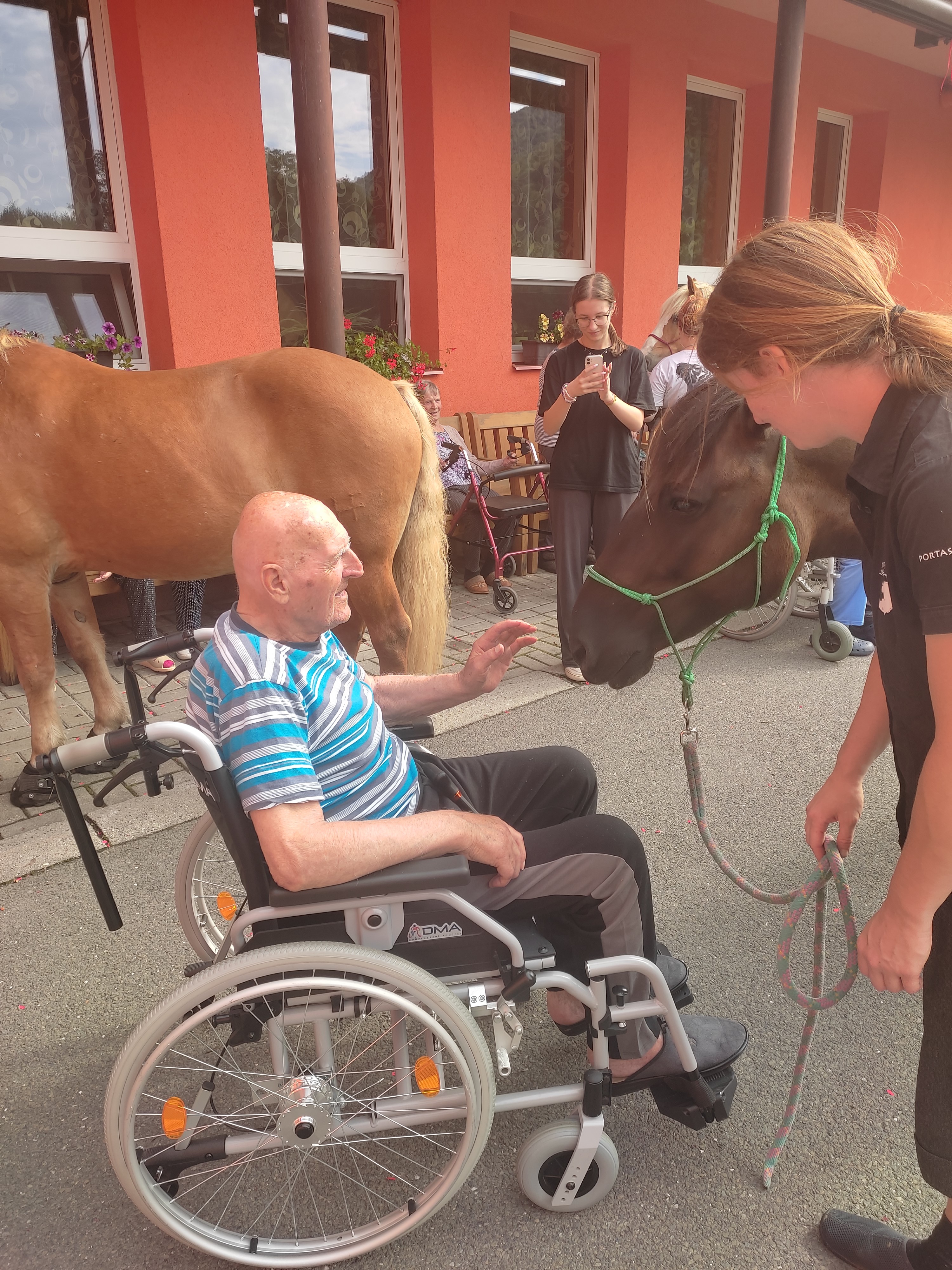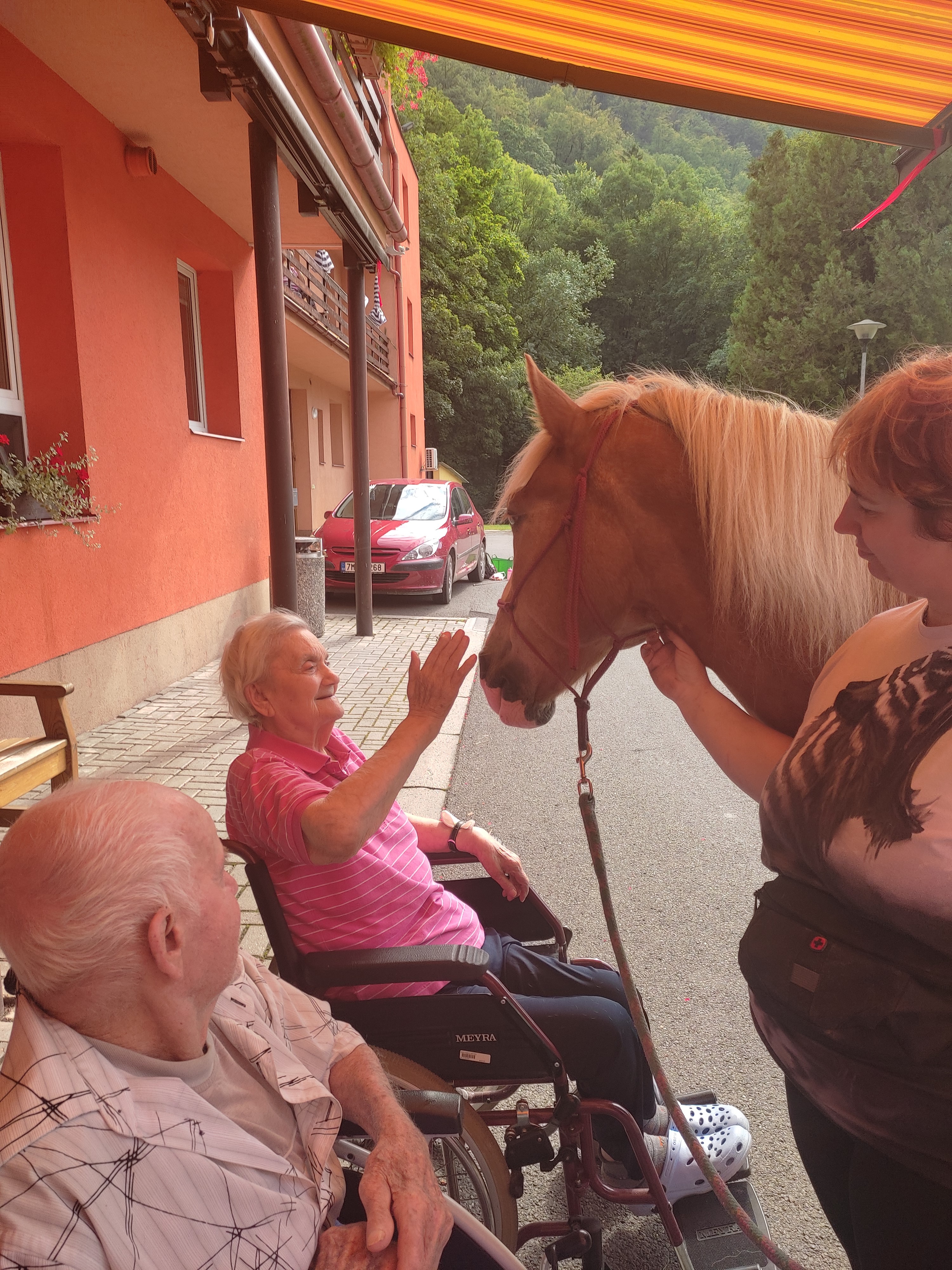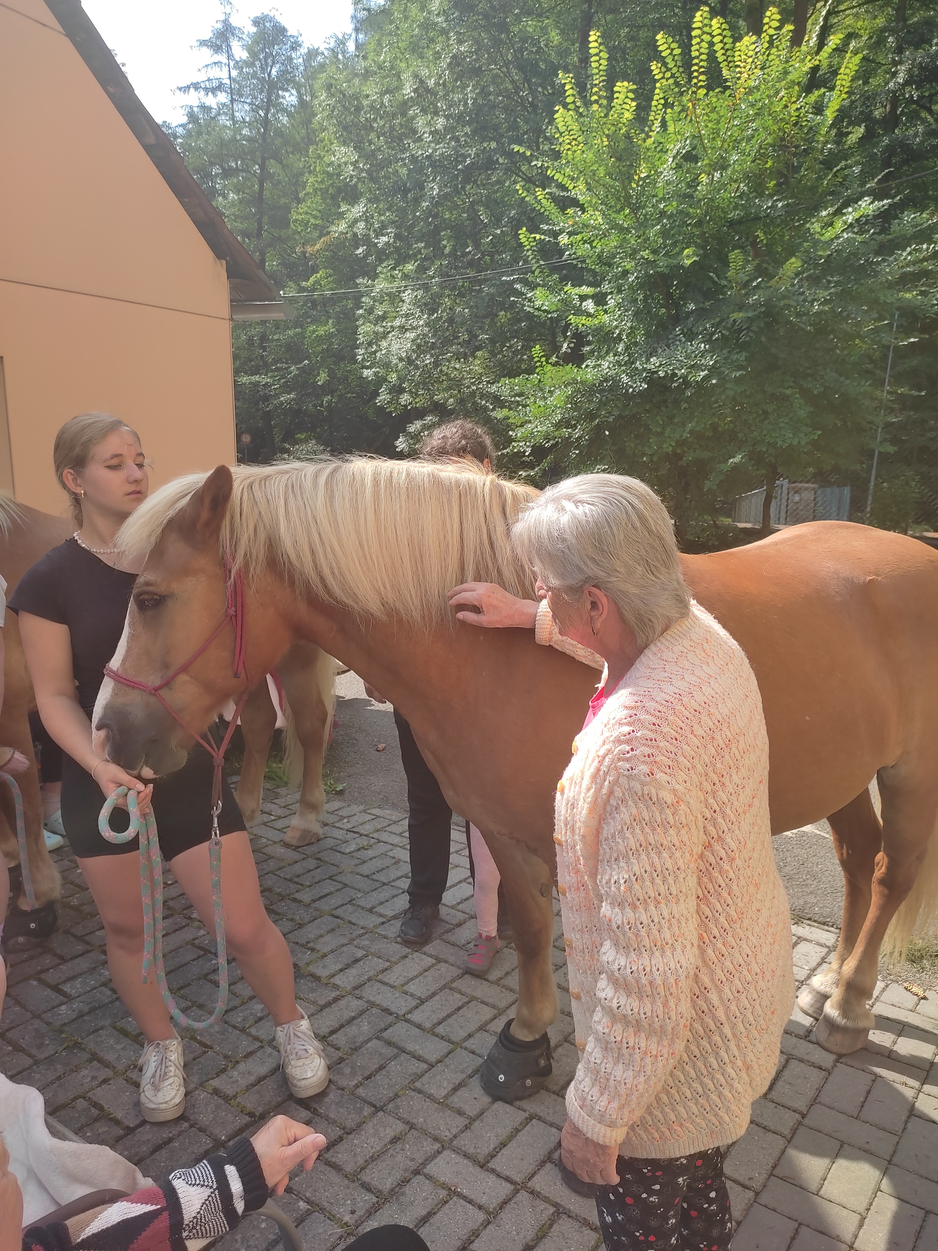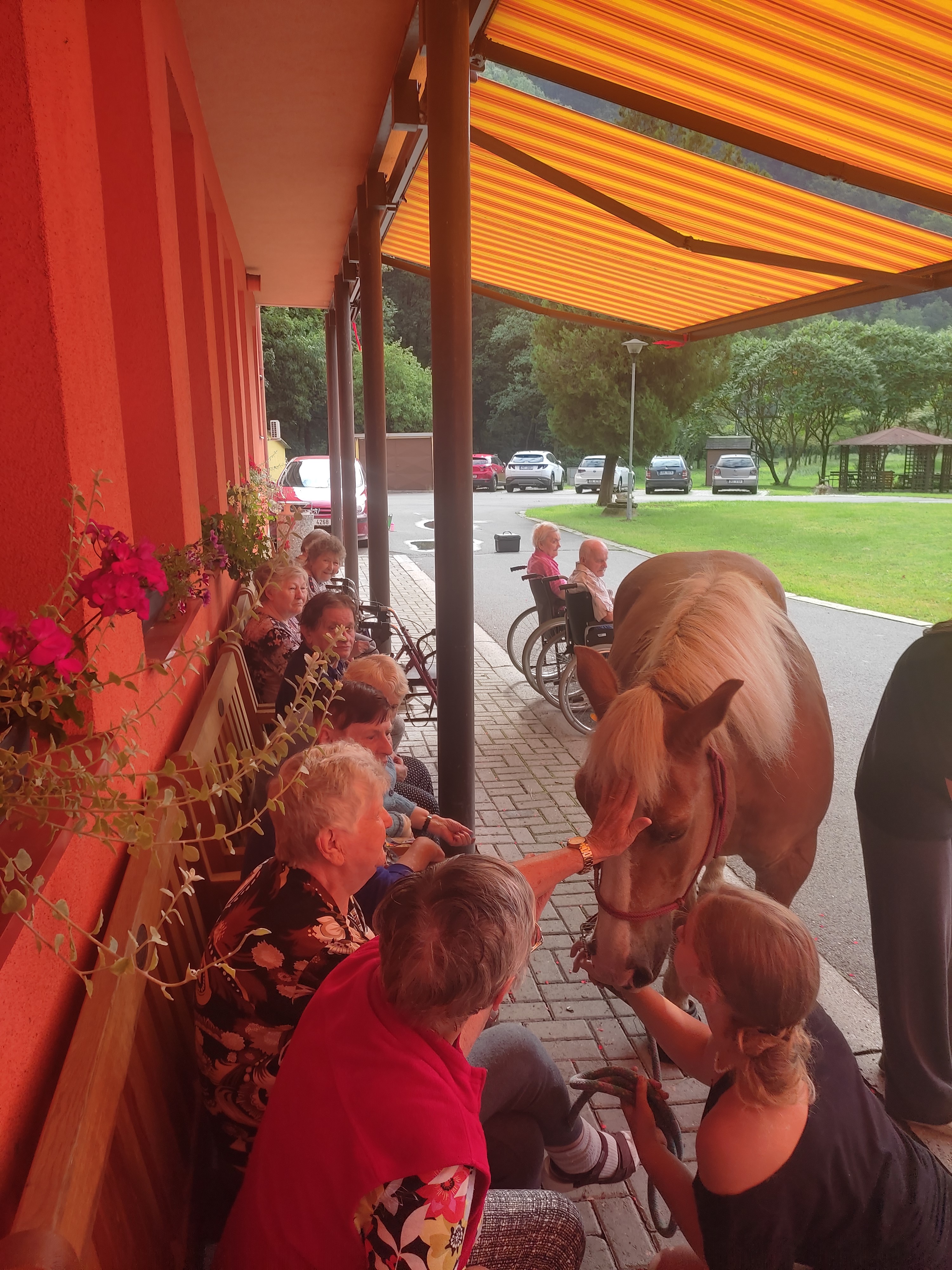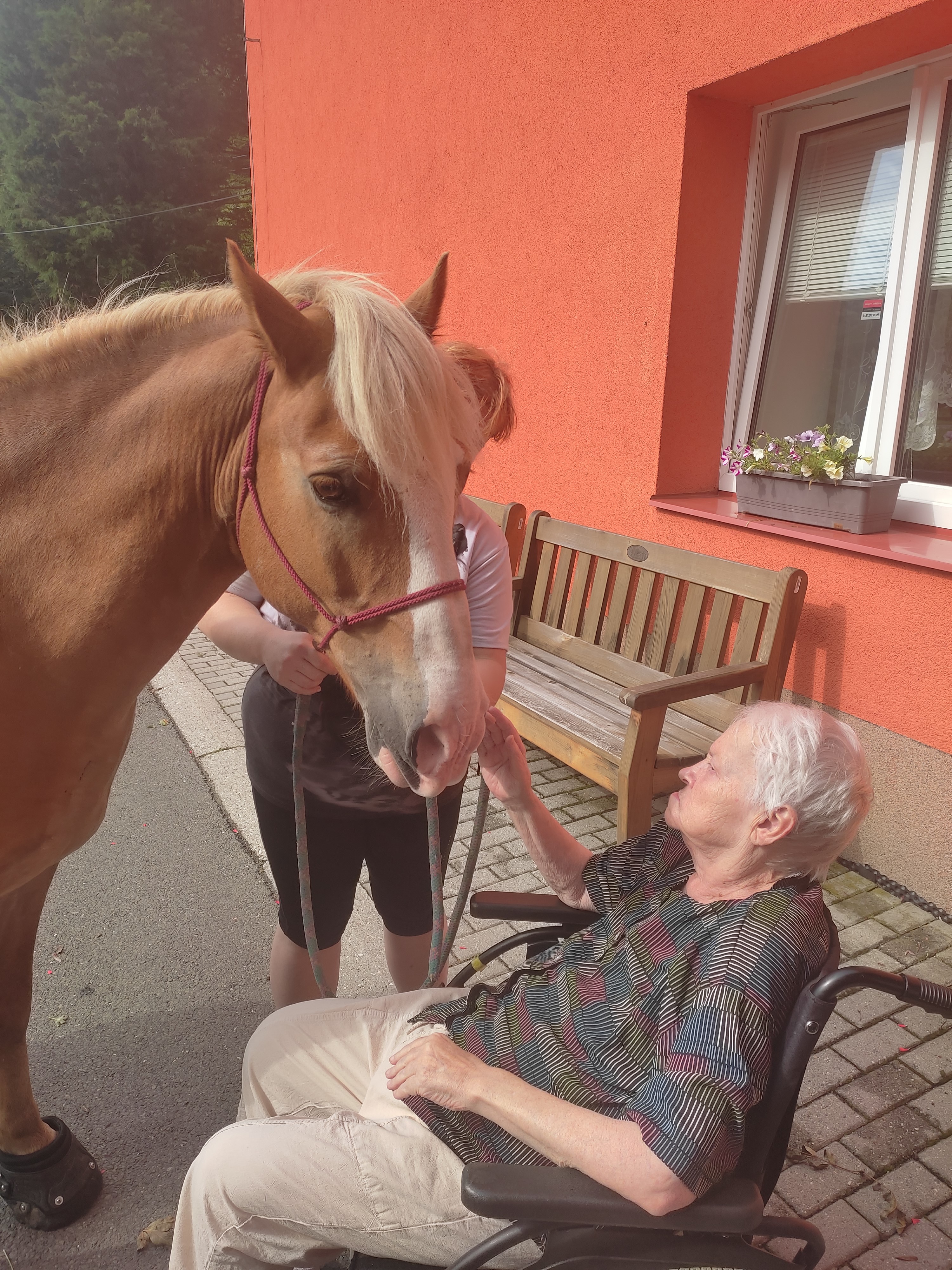 Plán se stal skutečností a my přivítali živé koně. Canisterapie se u nás odehrává pravidelně. Na to už jsme si zvykli. Hipoterapii jsme zažili poprvé. Nejprve bylo vzájemné oťukávání a navázání oboustranné důvěry. K tomu jsme využili naše venkovní prostory, které posloužily koníkům jako pastvina. Některé odvážné uživatelky se zapojily a koníky hřebelcovaly. Mysleli jsme i na další uživatele, pro které je opuštění lůžka velmi obtížné. Tak za těmi jsme šli přímo na pokoj. Bylo až neuvěřitelné slyšet po budově řehtání a dusot kopyt. Slovy se pocity nedají ani popsat. Tolik radosti. Moc děkujeme.