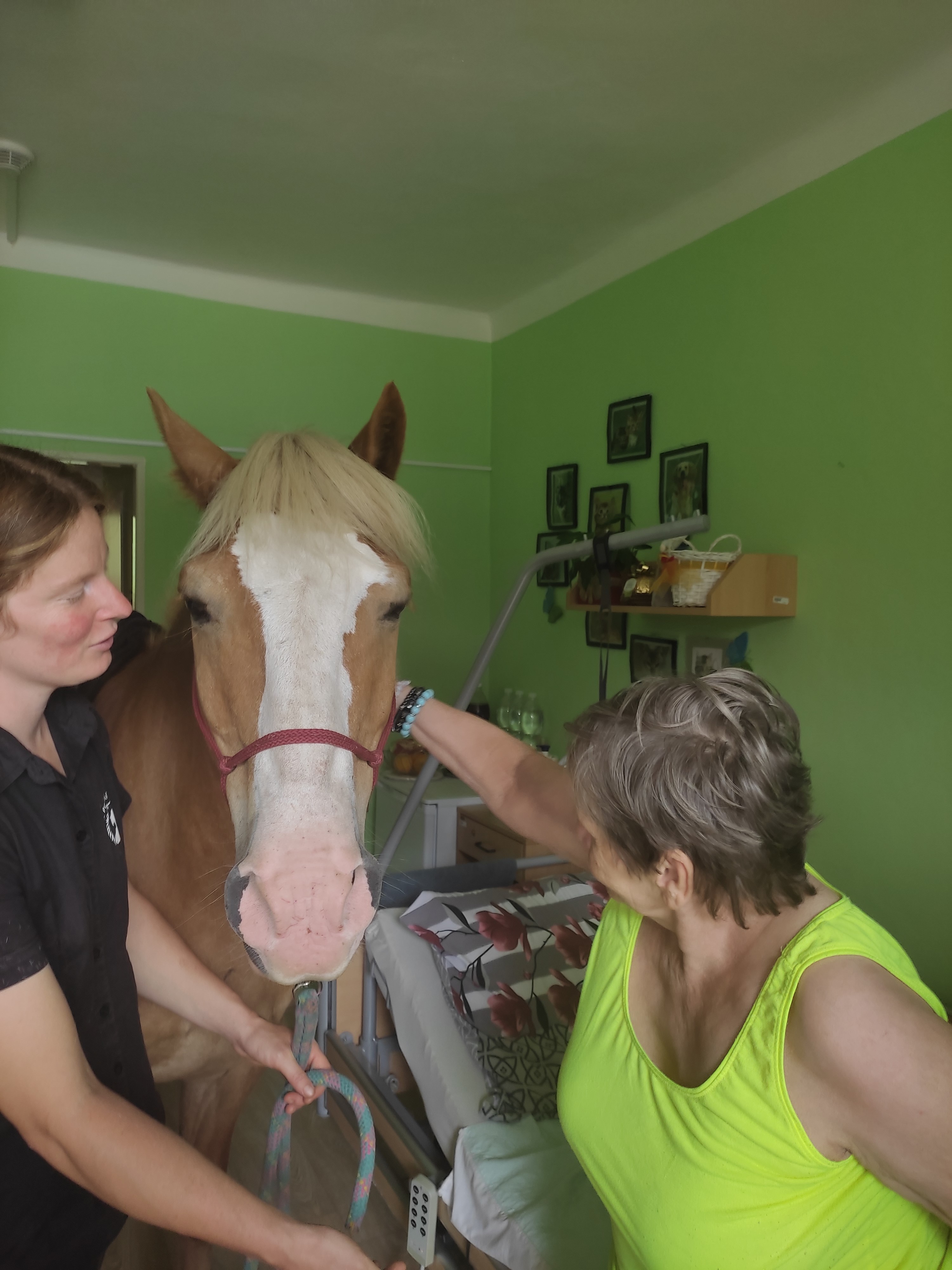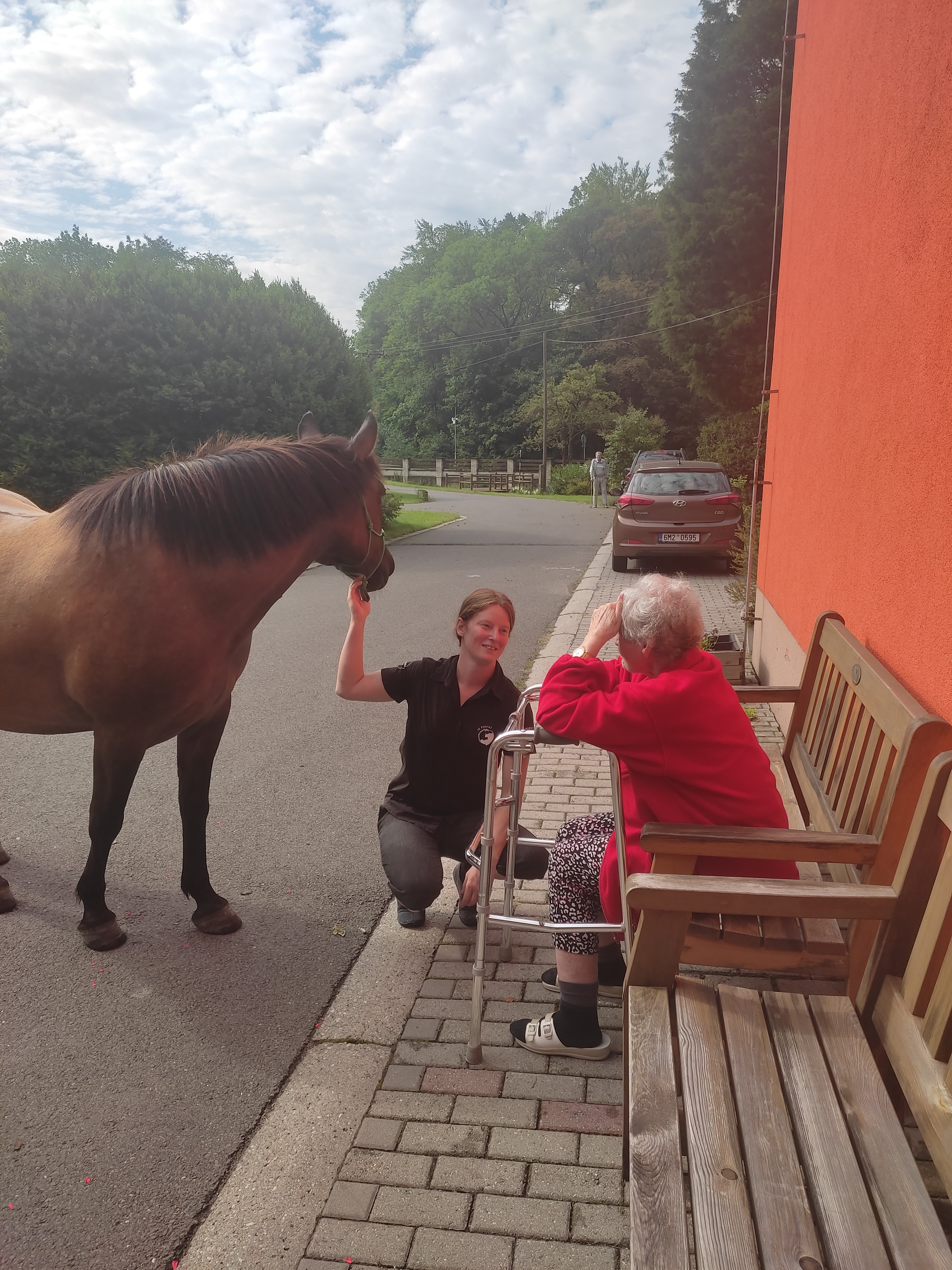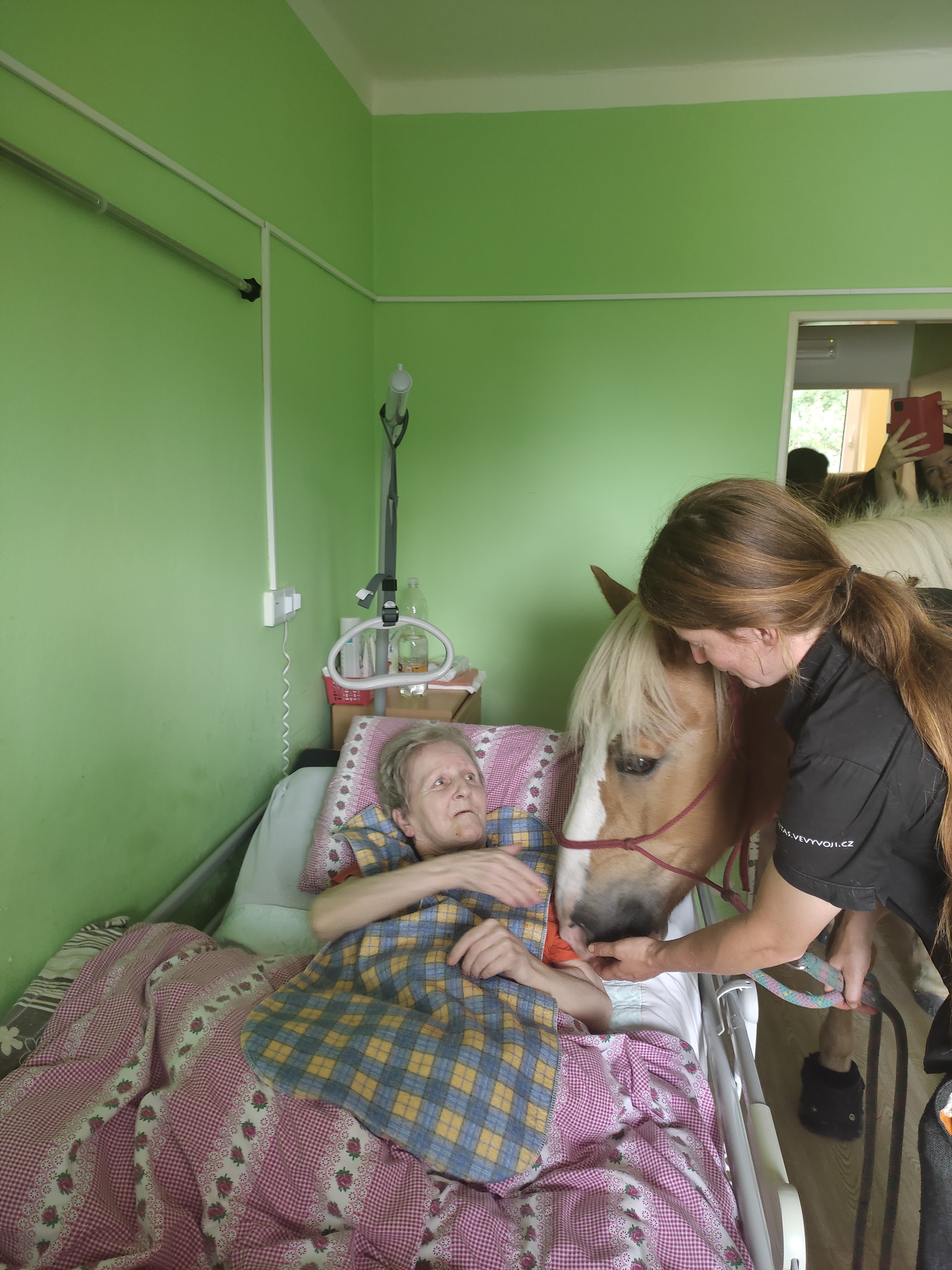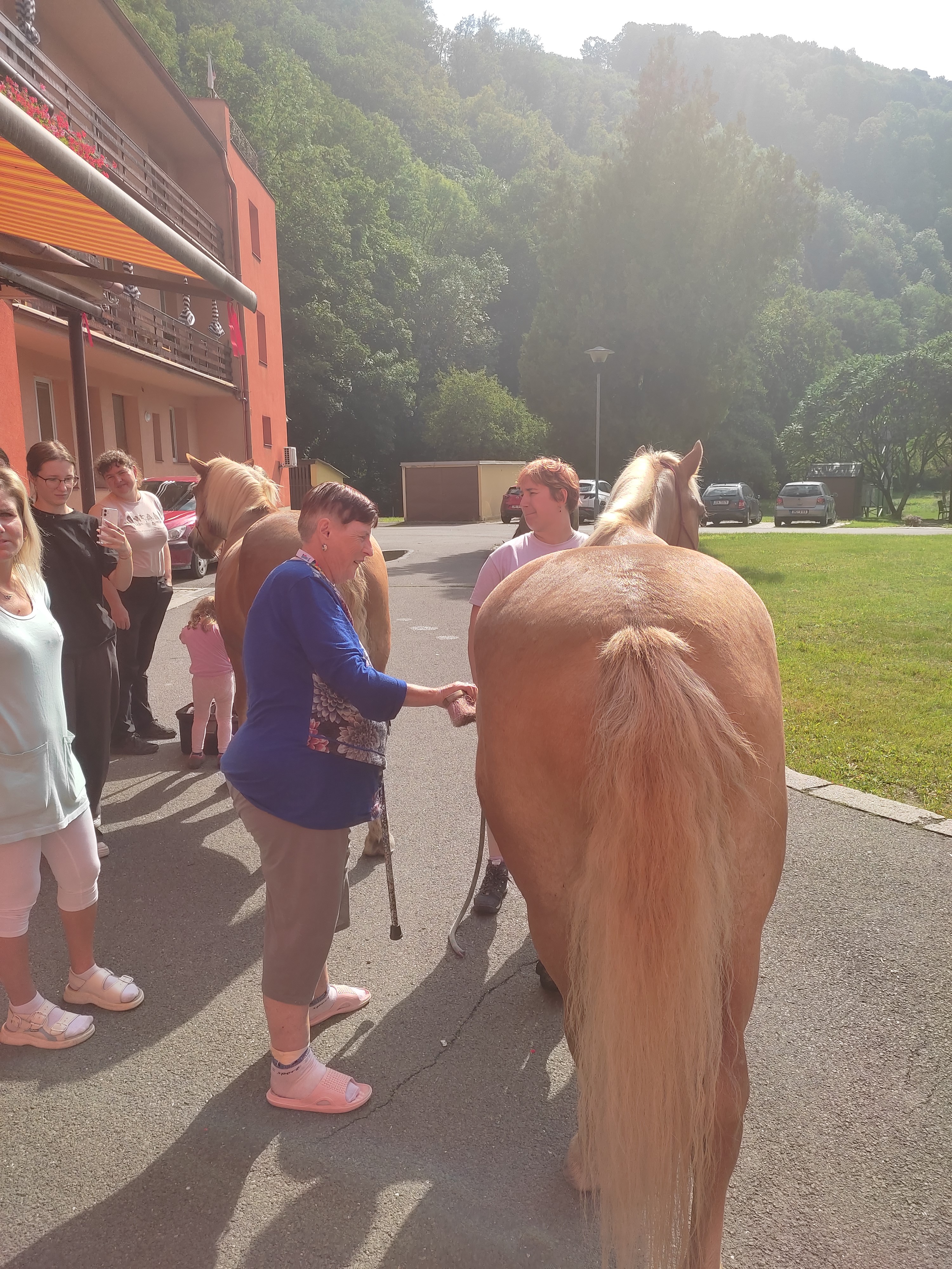 Plán se stal skutečností a my přivítali živé koně. Canisterapie se u nás odehrává pravidelně. Na to už jsme si zvykli. Hipoterapii jsme zažili poprvé. Nejprve bylo vzájemné oťukávání a navázání oboustranné důvěry. K tomu jsme využili naše venkovní prostory, které posloužily koníkům jako pastvina. Některé odvážné uživatelky se zapojily a koníky hřebelcovaly. Mysleli jsme i na další uživatele, pro které je opuštění lůžka velmi obtížné. Tak za těmi jsme šli přímo na pokoj. Bylo až neuvěřitelné slyšet po budově řehtání a dusot kopyt. Slovy se pocity nedají ani popsat. Tolik radosti. Moc děkujeme.