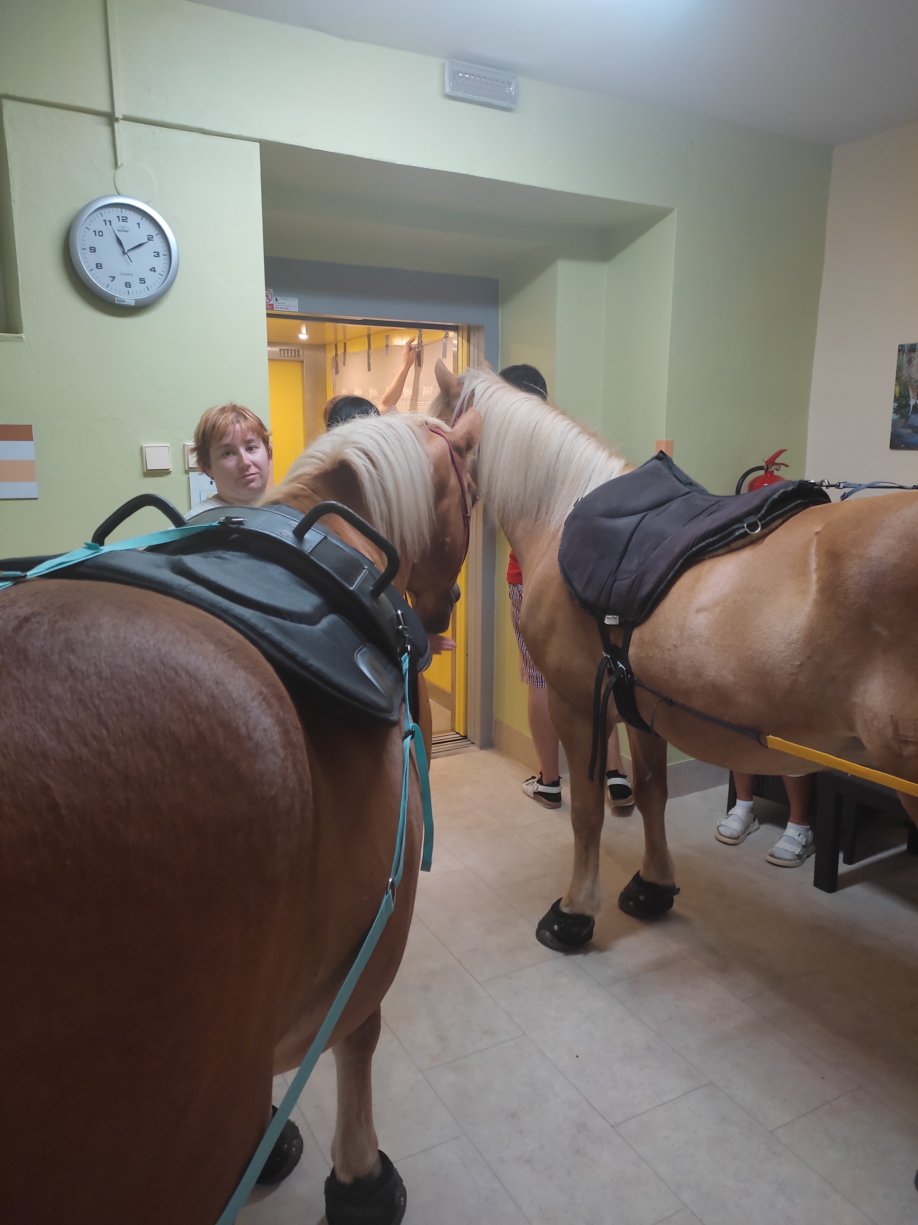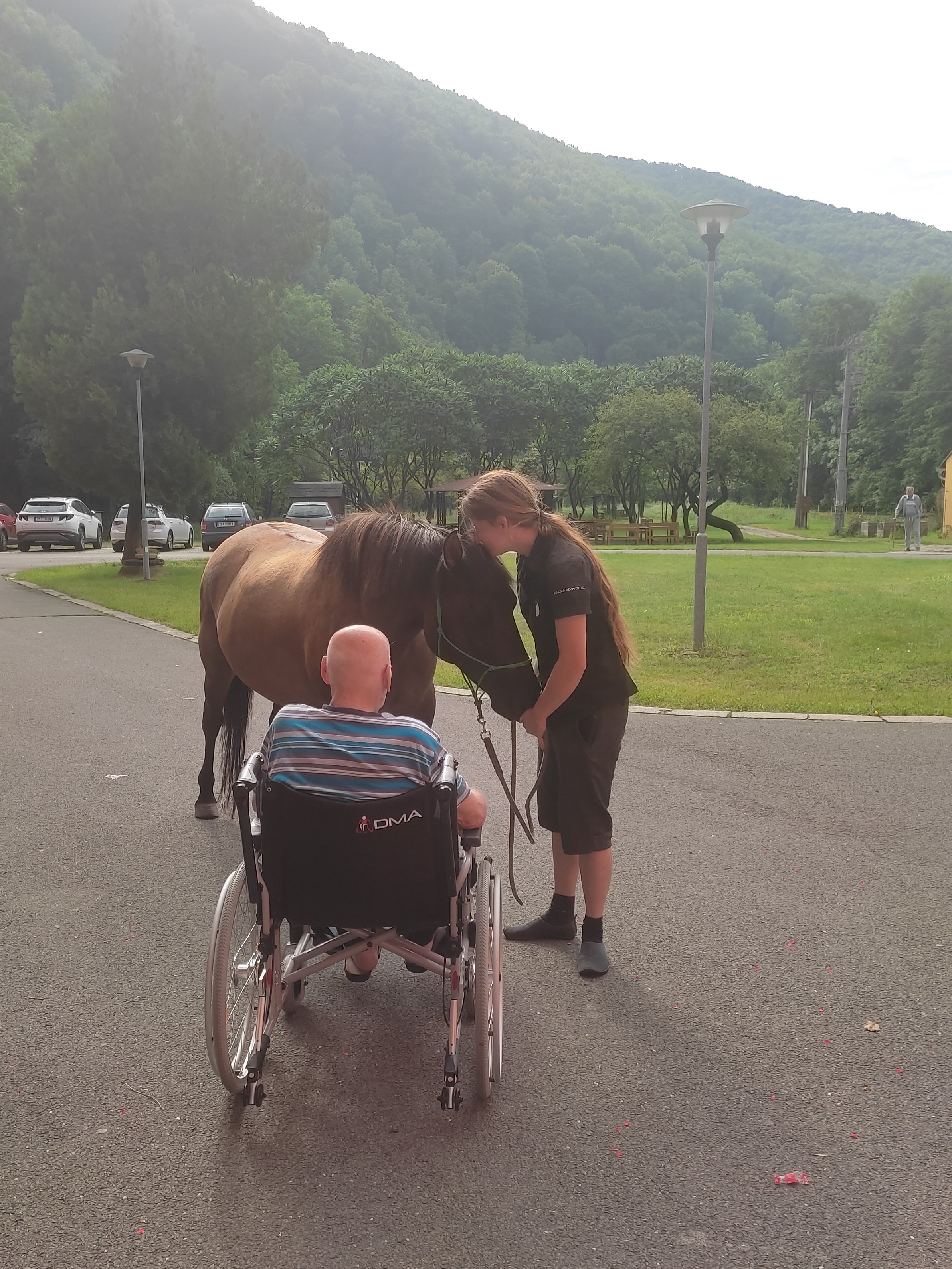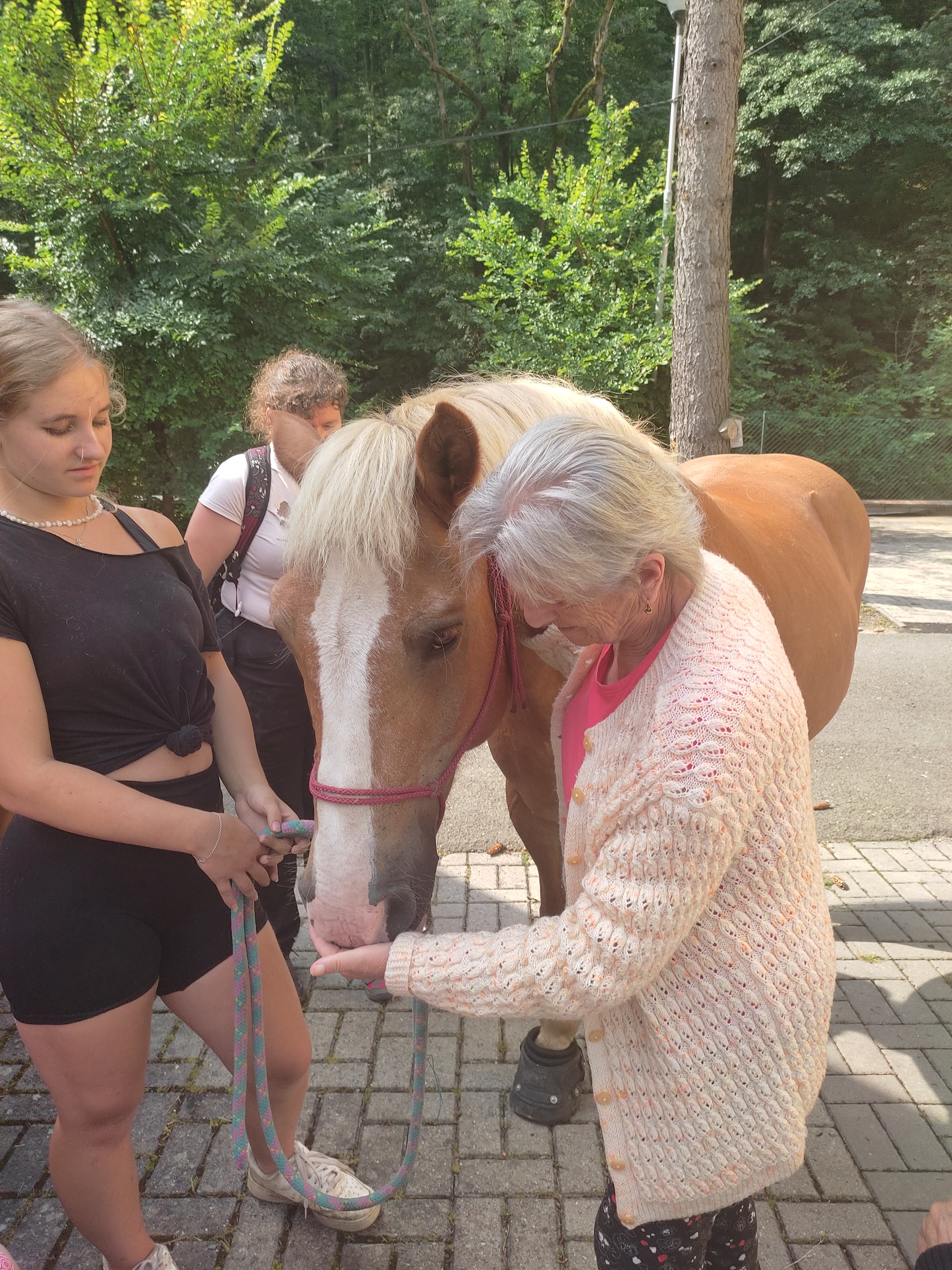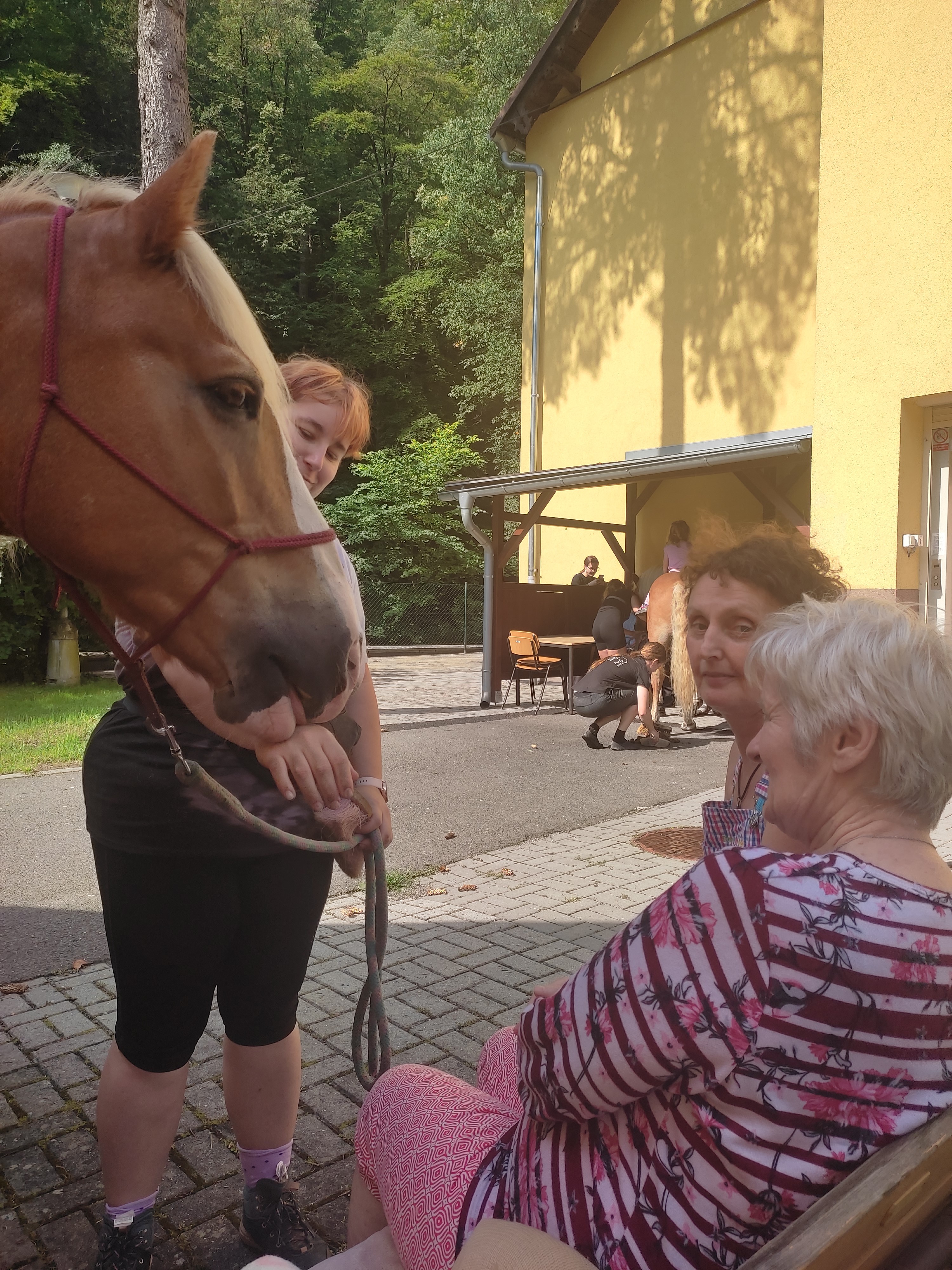 Plán se stal skutečností a my přivítali živé koně. Canisterapie se u nás odehrává pravidelně. Na to už jsme si zvykli. Hipoterapii jsme zažili poprvé. Nejprve bylo vzájemné oťukávání a navázání oboustranné důvěry. K tomu jsme využili naše venkovní prostory, které posloužily koníkům jako pastvina. Některé odvážné uživatelky se zapojily a koníky hřebelcovaly. Mysleli jsme i na další uživatele, pro které je opuštění lůžka velmi obtížné. Tak za těmi jsme šli přímo na pokoj. Bylo až neuvěřitelné slyšet po budově řehtání a dusot kopyt. Slovy se pocity nedají ani popsat. Tolik radosti. Moc děkujeme.