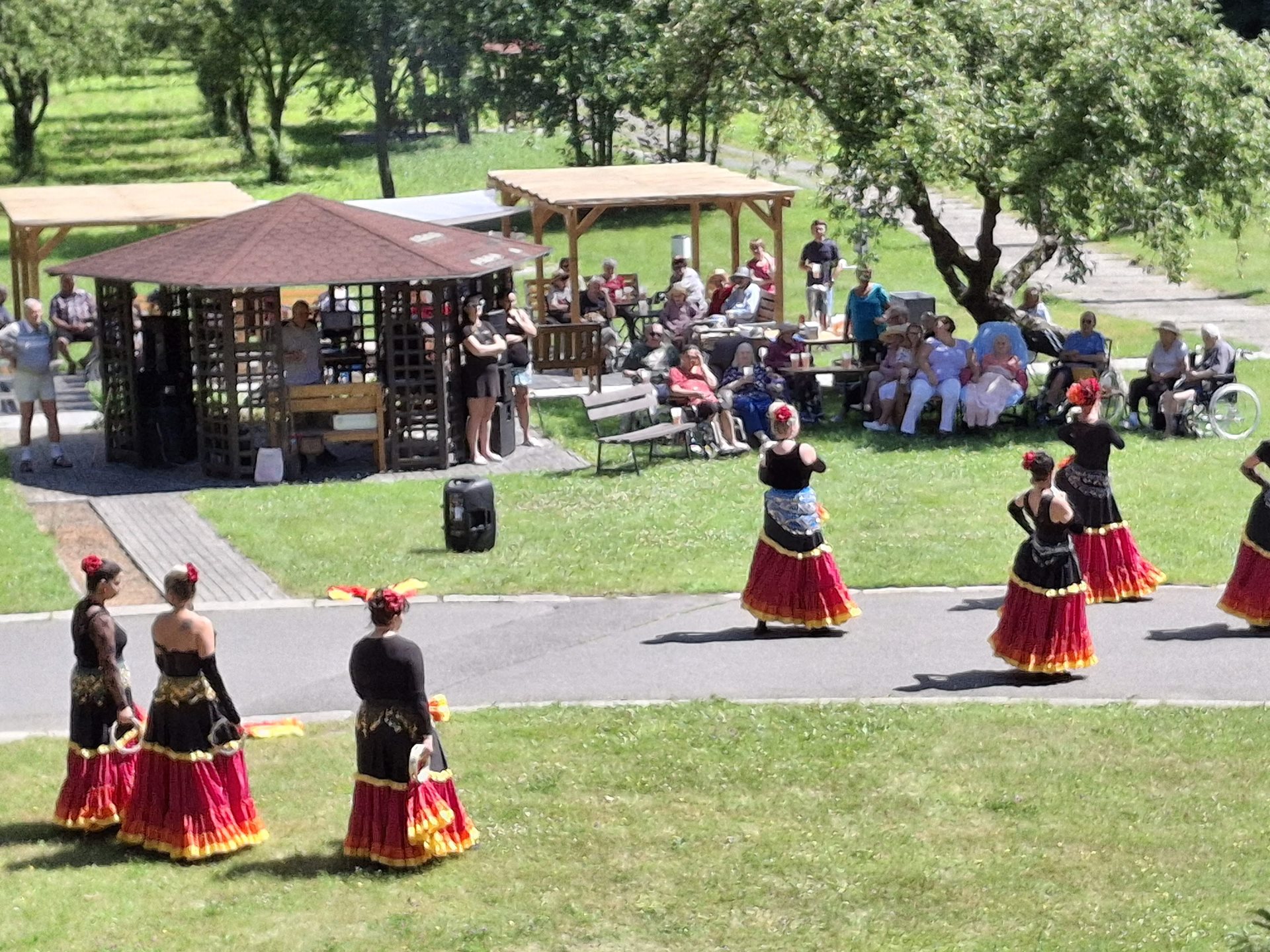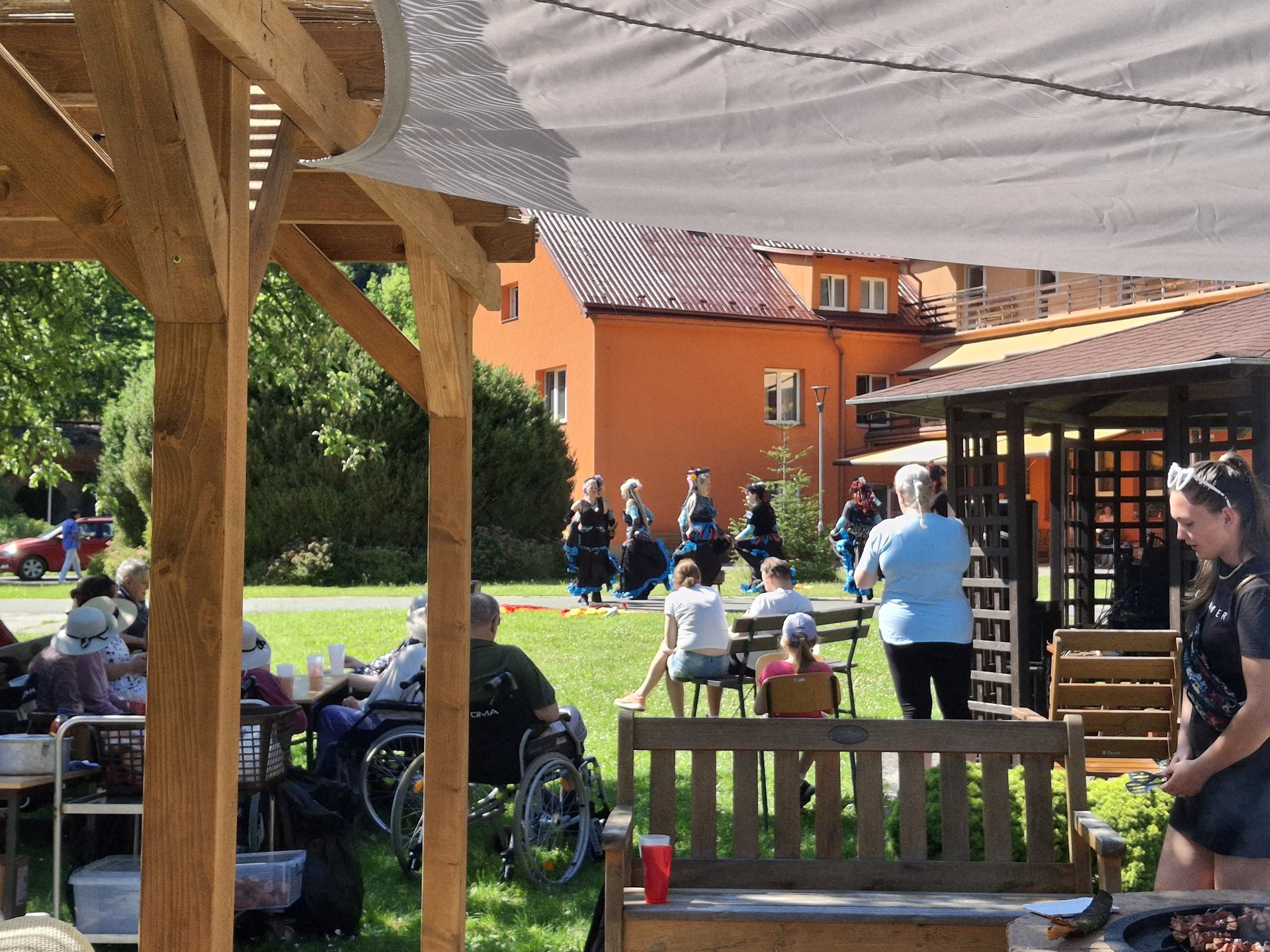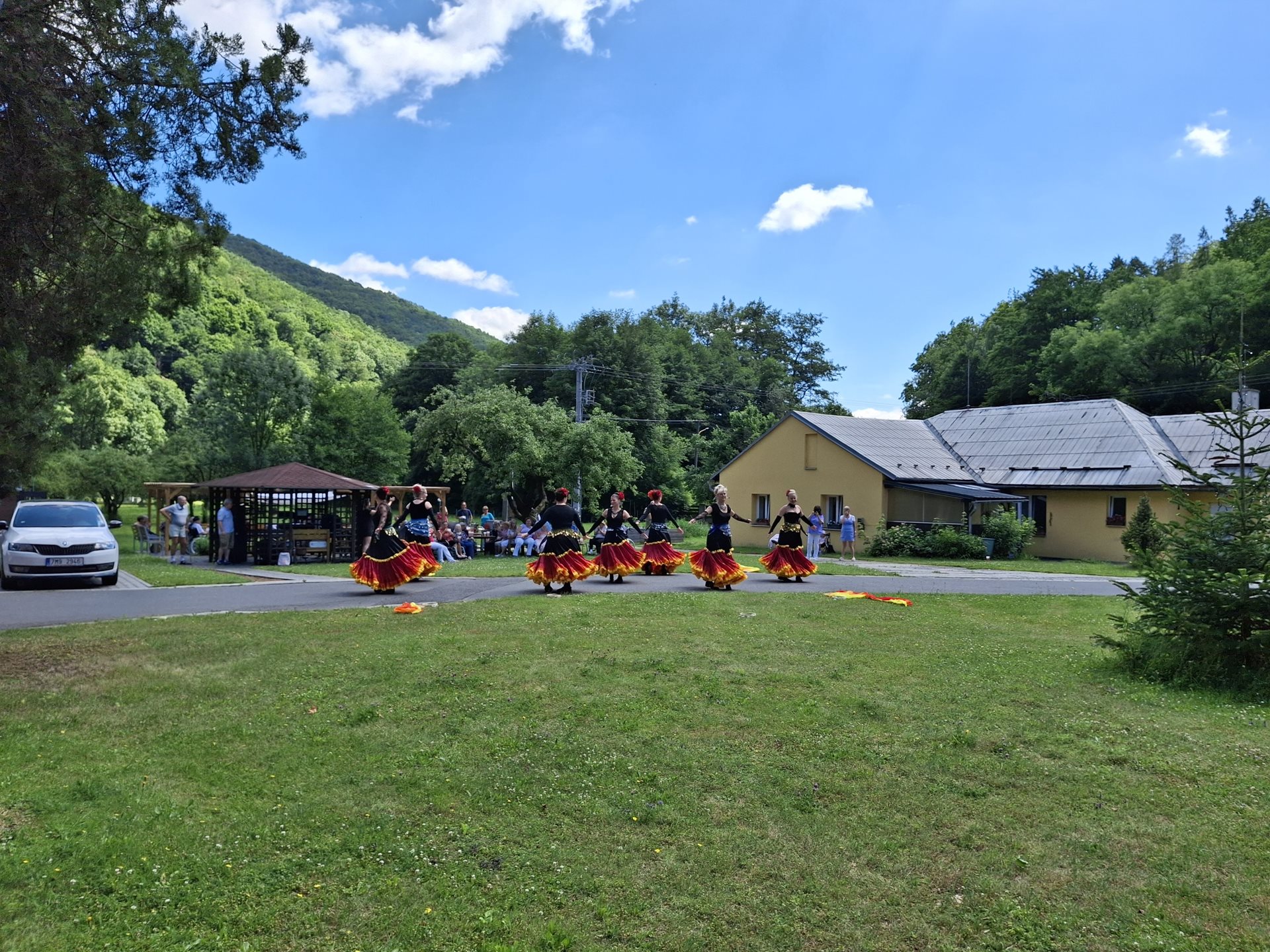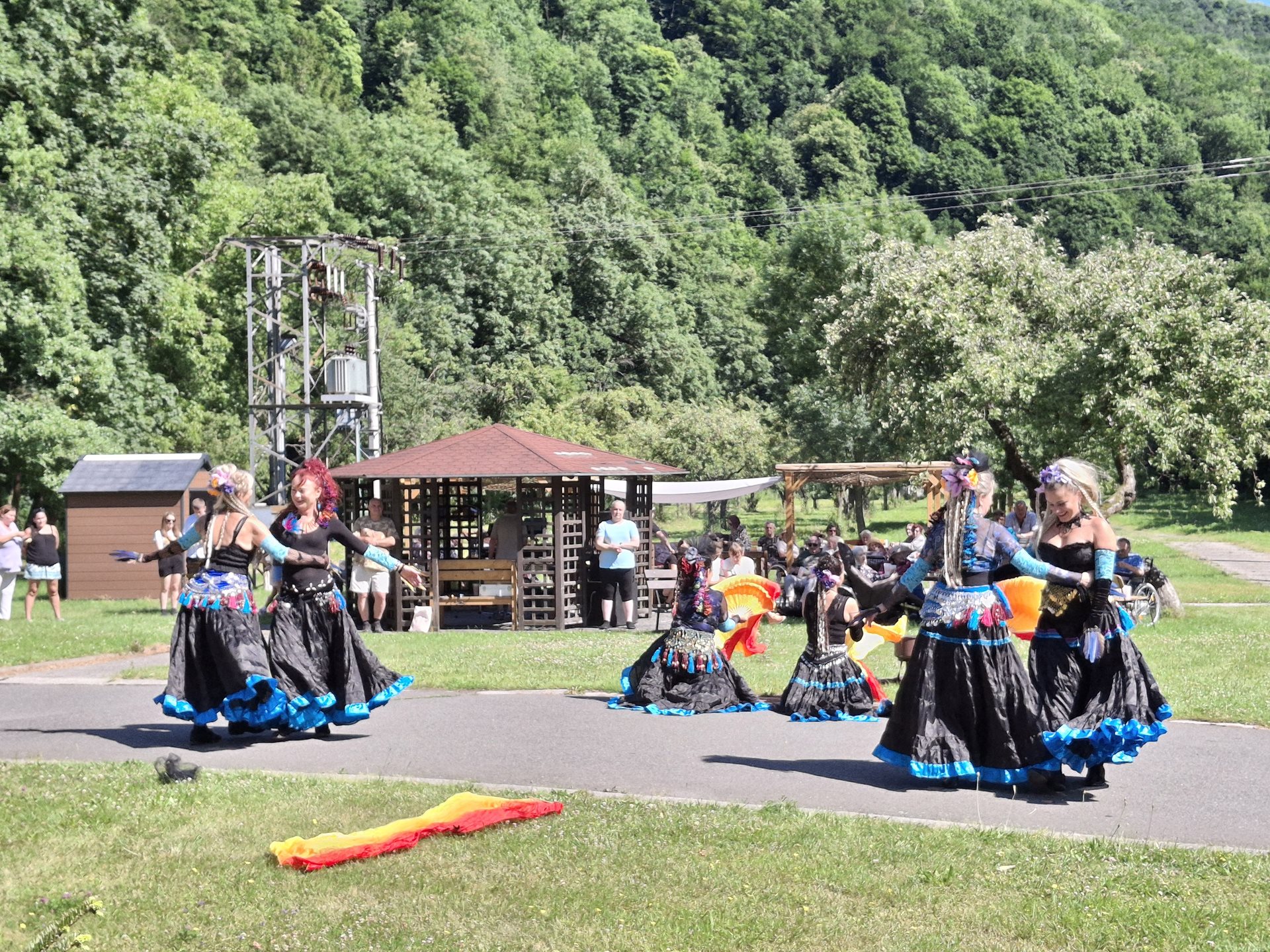 V sobotu jsme pořádali naše oblíbené opékání, které jsme si tentokrát zpříjemnili překvapením. Přijely nám zatančit tanečnice ze Vsetína. Jedná se o sedm kamarádek, které ve volném čase nacvičují taneční vystoupení. Pro nás si připravily pět tematických tanečních čísel. Celé odpoledne probíhalo ve velmi příjemné atmosféře, protože počasí nám přálo, slunce svítilo a sem tam příjemně zafoukal větřík, který nás osvěžil. Buřtíky chutnaly výborně a pivečko bylo krásně vychlazené.